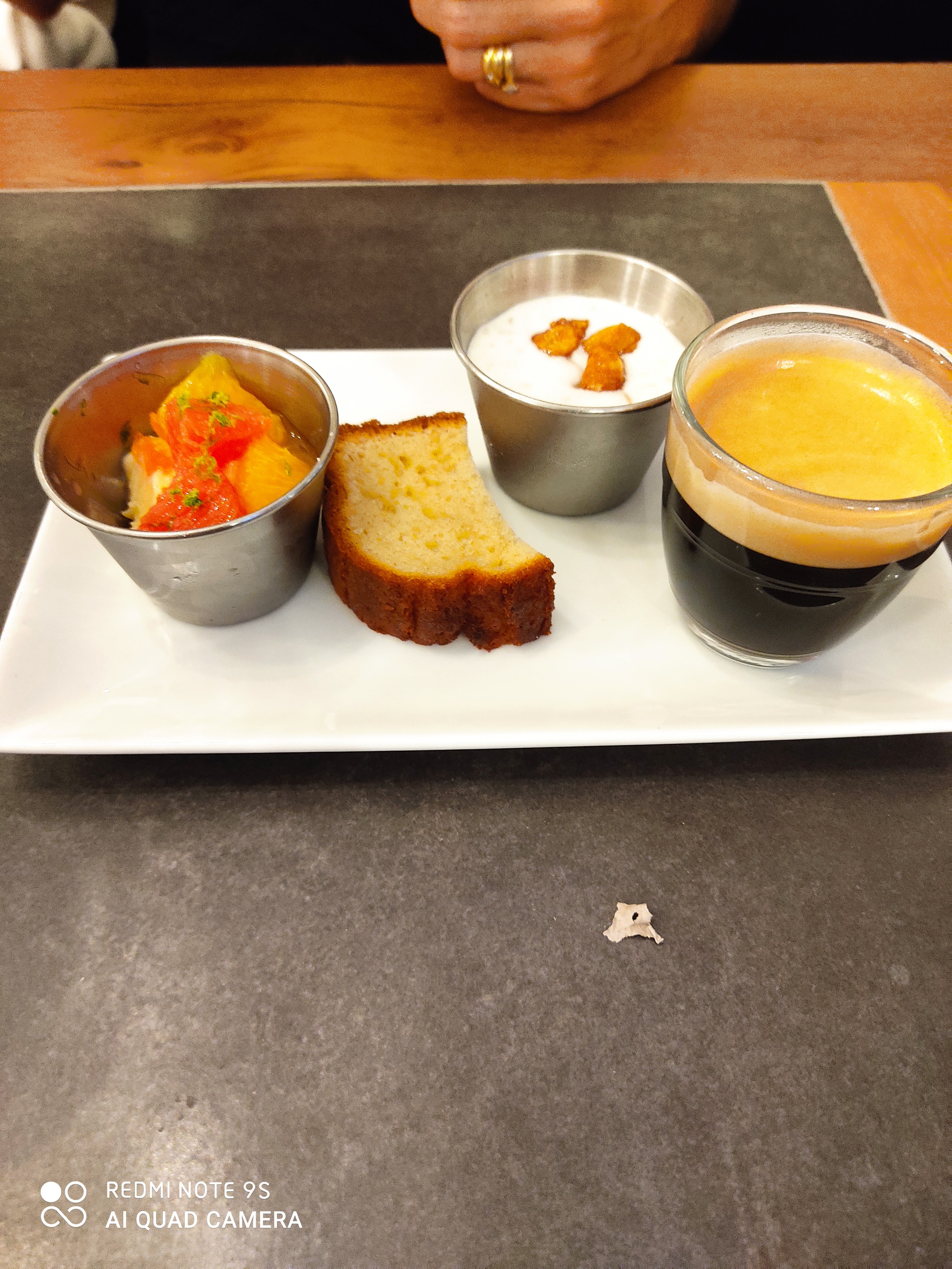 Un peu déçu de l'entrée. Plat trés intéressant. Désert trés agréable et très original. Mais note un peu élevé.