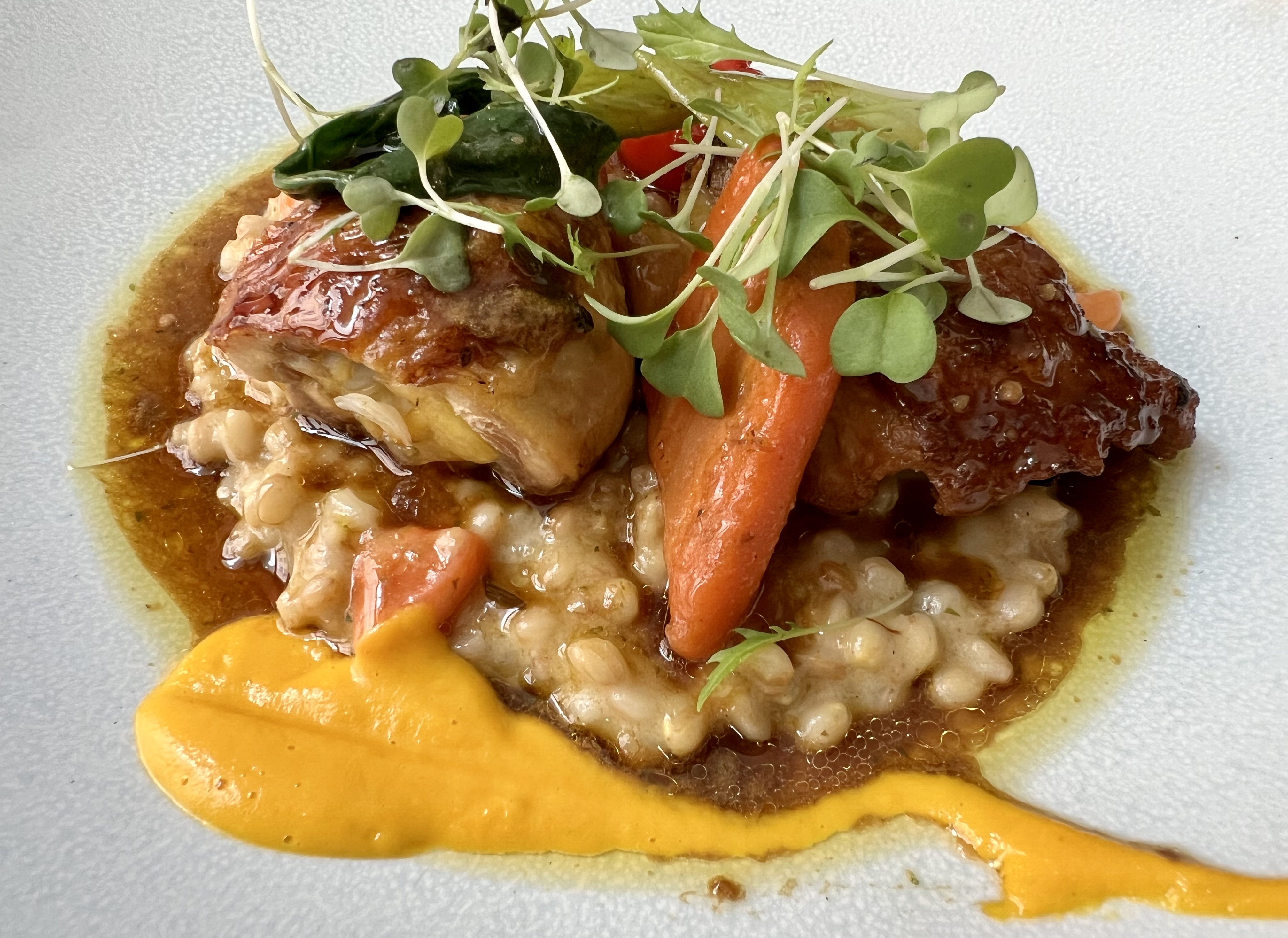 Repas très original avec beaucoup de saveurs différentes et de jolies associations. Très belle présentation. Portions qui conviennent à un repas du soir, mais qui pourraient être un peu plus copieuses pour de bons mangeurs.