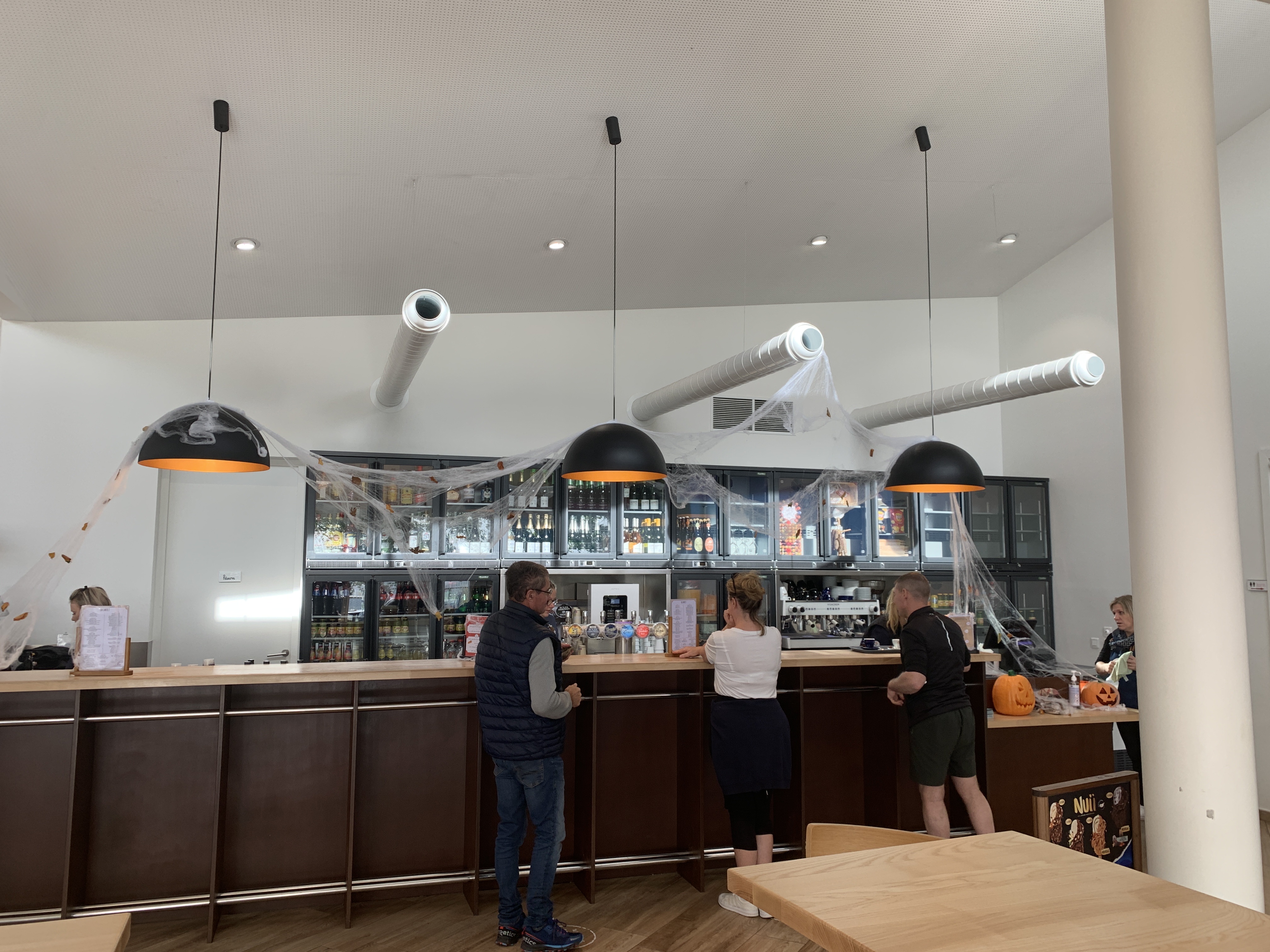 Ambiance cantine / self service dans une ambiance très familiale mais avec un décor néanmoins très “cosy” et soigné. Bon rapport qualité prix. Les chiens ne sont pas acceptés à l’intérieur mais des tables sont disponibles en extérieur. Le bar est quant à lui ouvert toute la journée, large choix de bières en pression 😁, bon plan pour les sportifs avec possibilité de remplir sa gourde à la fontaine à l’entrée