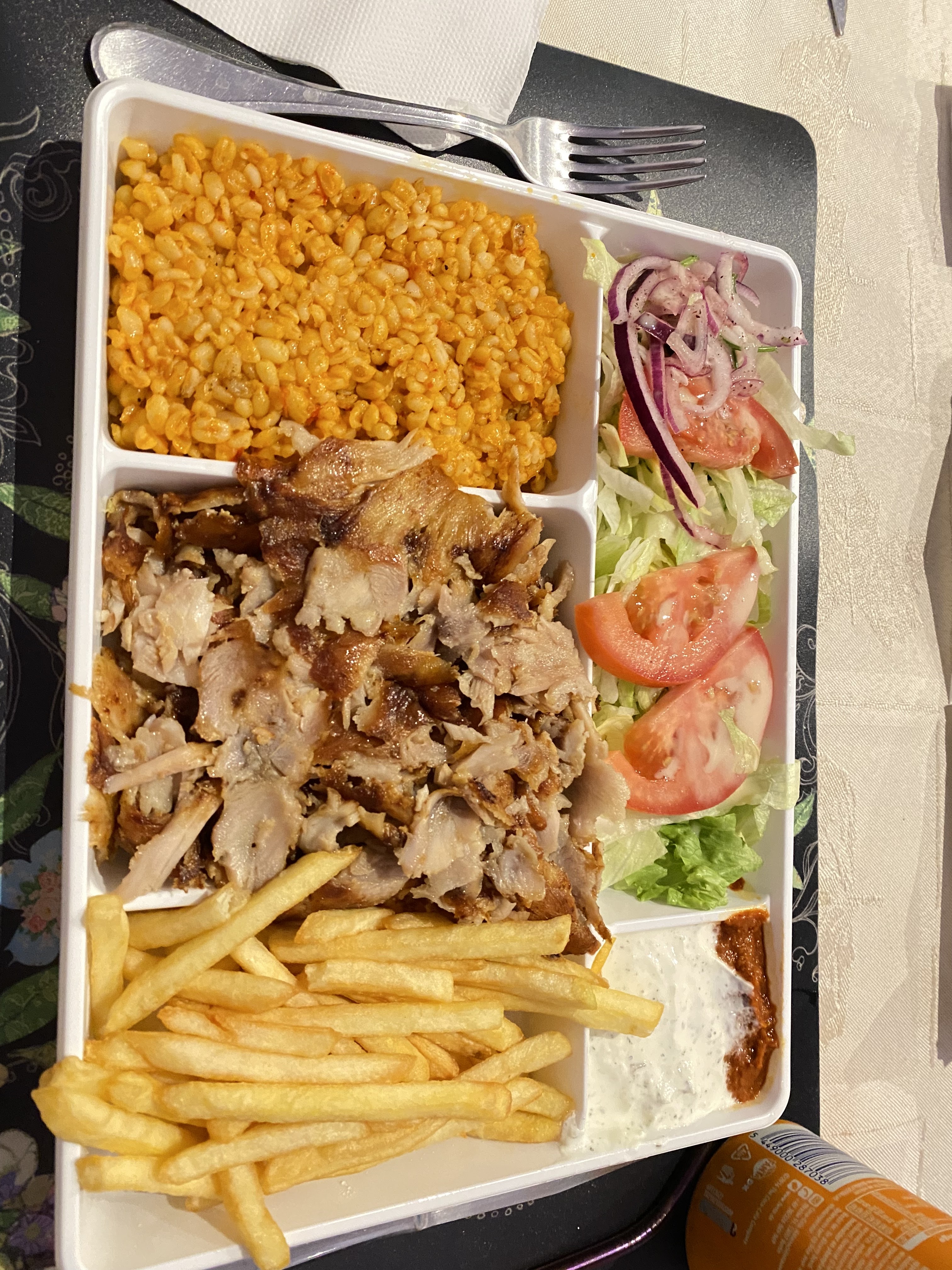 Je conseille ce restaurant personnel aimable respectueux , le patron est très sympa et la nourriture est très bonne . Propose systématiquement aux personnes qui prennent des sandwich à emporter , pendant la préparation , un thé ou un café . Sens de l accueil turc rien à dire !!!