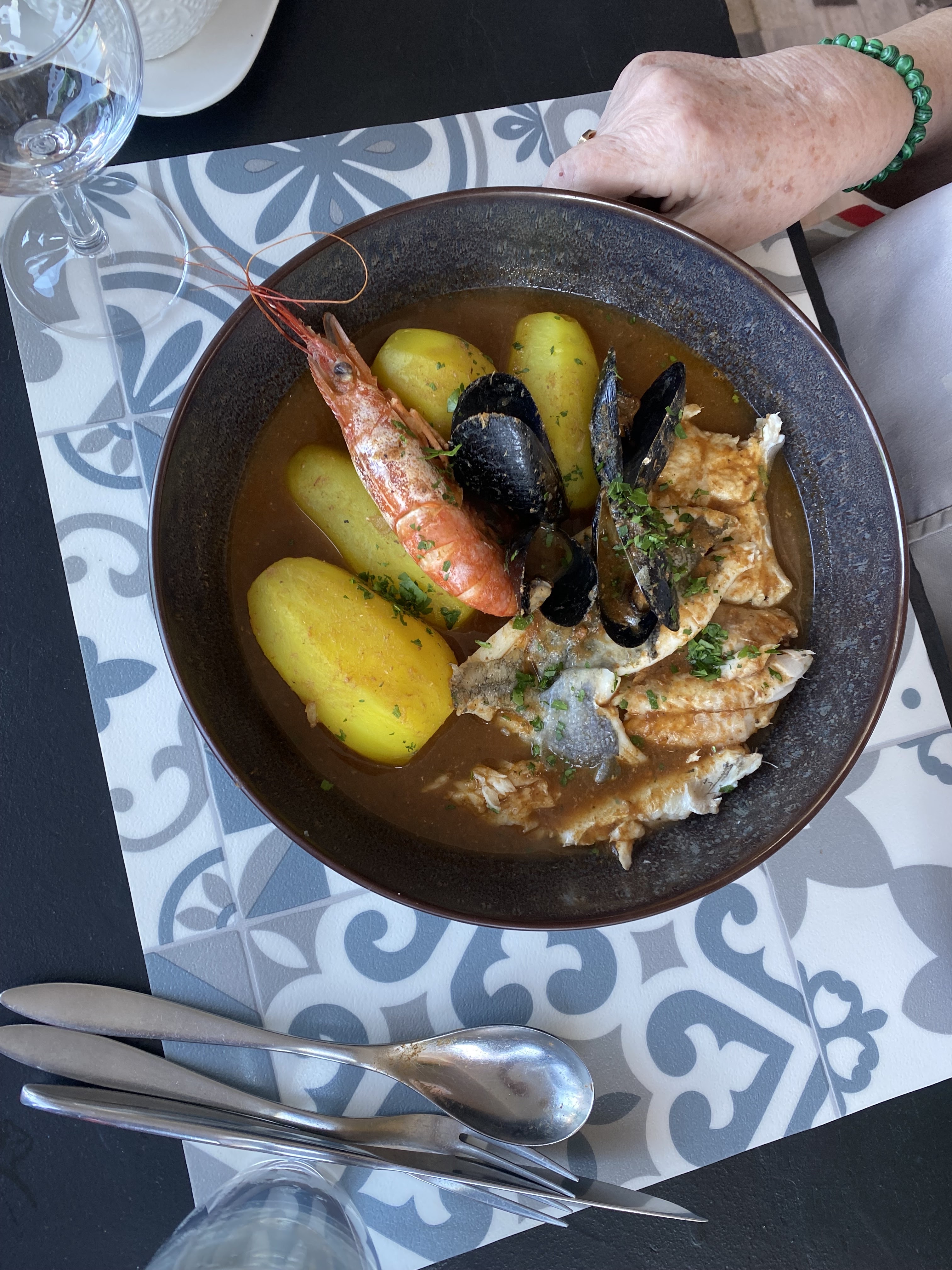 Accueil exécrable. On nous positionne dehors en plein soleil de juillet, nous demandons à aller à l'intérieur, réponse : non pas possible, vous devrez supporter le soleil jusqu'à son coucher ... nous avons supposé qu'elle ne souhaitait pas dresser de table en intérieur mais avons eu la très désagréable surprise en entrant pour payer d'y voir plusieurs tables occupées ! Soupe de poisson insipide, pas de rouille mais une sorte de Mayonnaise colorée, moutardée et sans ail ... des frites surgelées de chez Métro et un service par des enfants entre 11 et 16 ans Hallucinant ! A quel siècle pensent-ils vivre ?. Horriblement cher pour la piètre qualité. A éviter absolument !