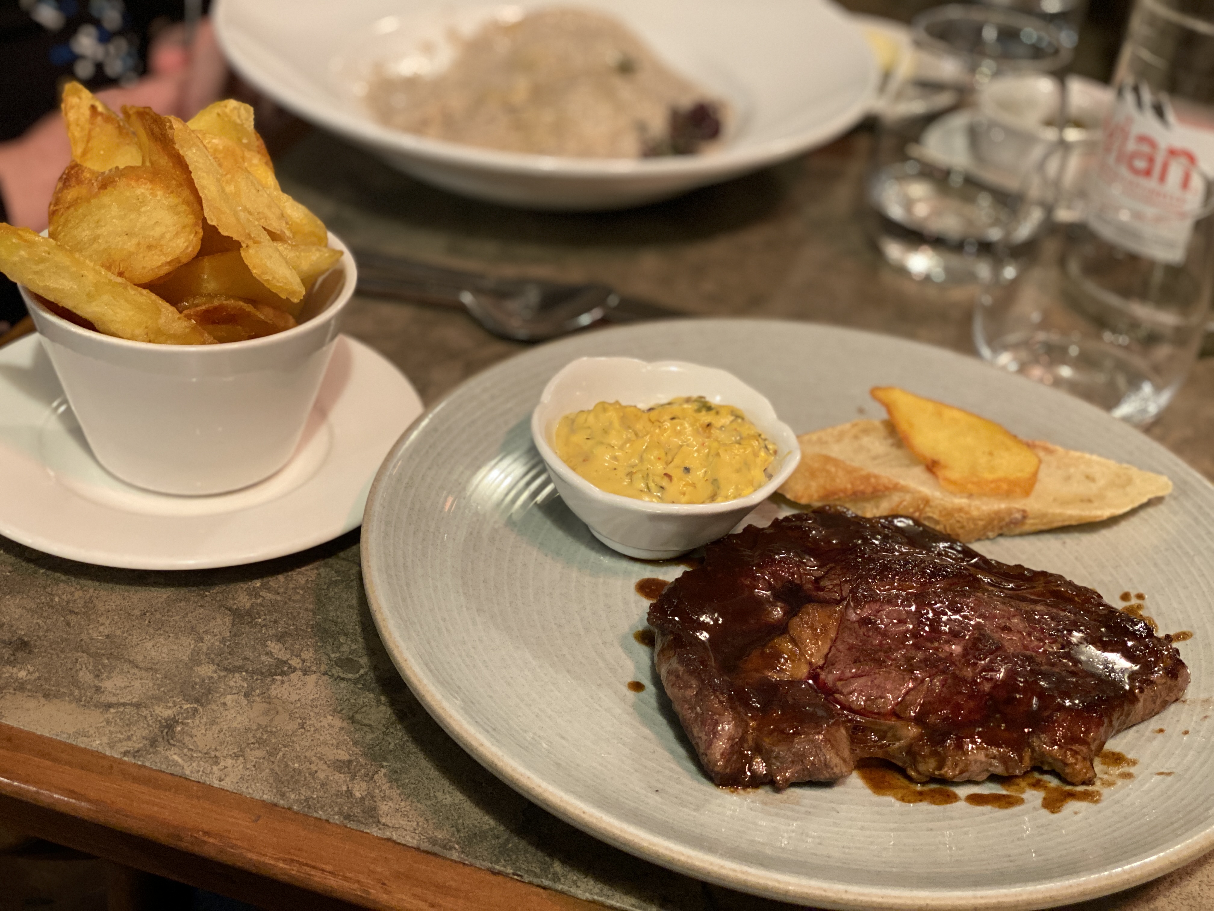 Déçu malgré la bonne note des autres clients de la région, ainsi que par la nourriture qui était simple (pour mon jarret d'agneau, même si j'avais demandé un peu de sauce à la viande supplémentaire) et probablement un endroit très touristique car la soupe à l'oignon était également ratée avec du pain à l'intérieur. i/o pain croûton à l'ail. Tartare rien de spécial, les escargots étaient OK. Les prix sont définitivement surfaits pour ce que vous obtenez. Au moins le service était bon et gentil. Je pourrais aussi dire que le fait d’être placé au milieu du restaurant avec une vue partielle directement dans la cuisine n’a pas aidé non plus, car on voit des choses qu’on ne voudrait pas vraiment voir si on souffre de TOC.