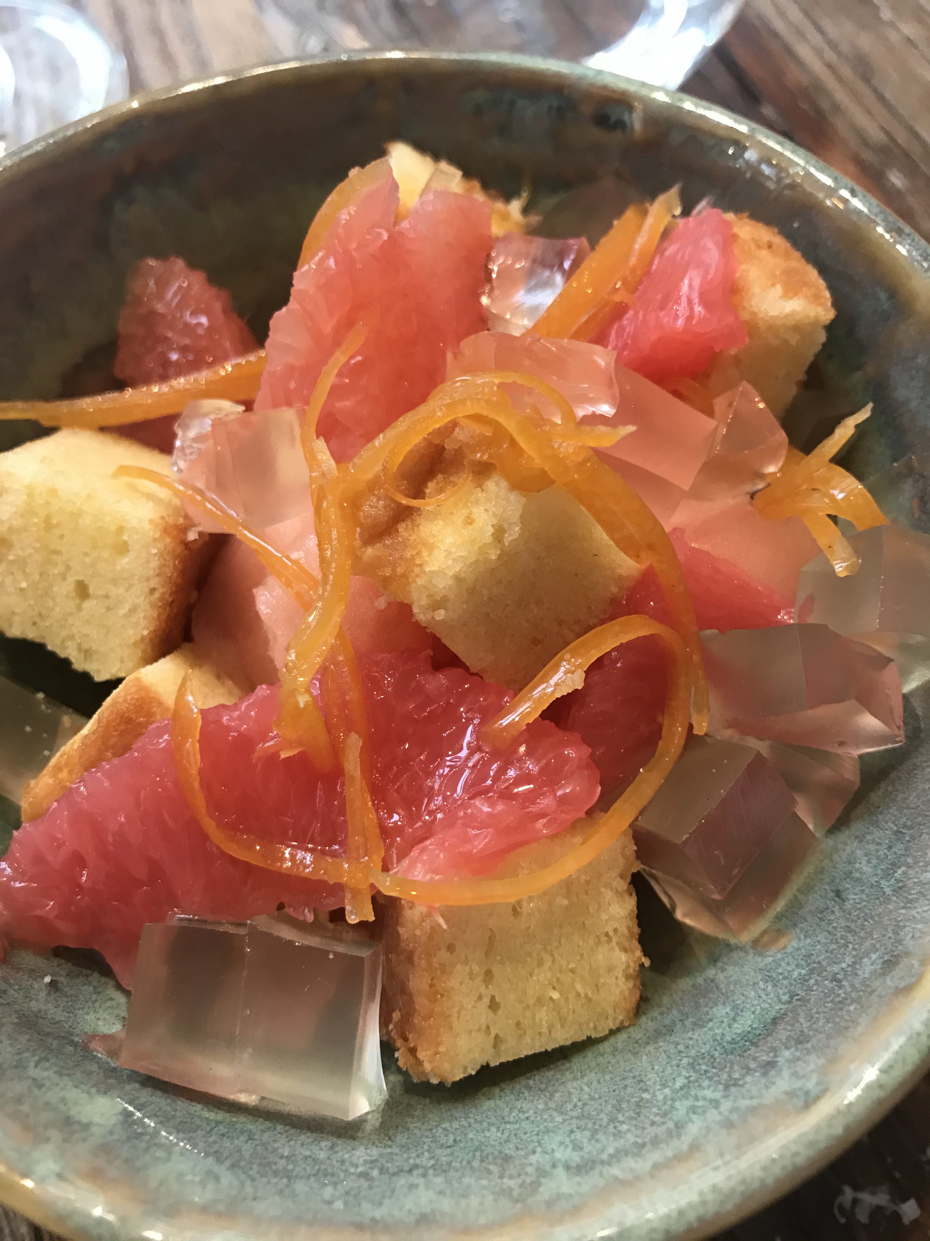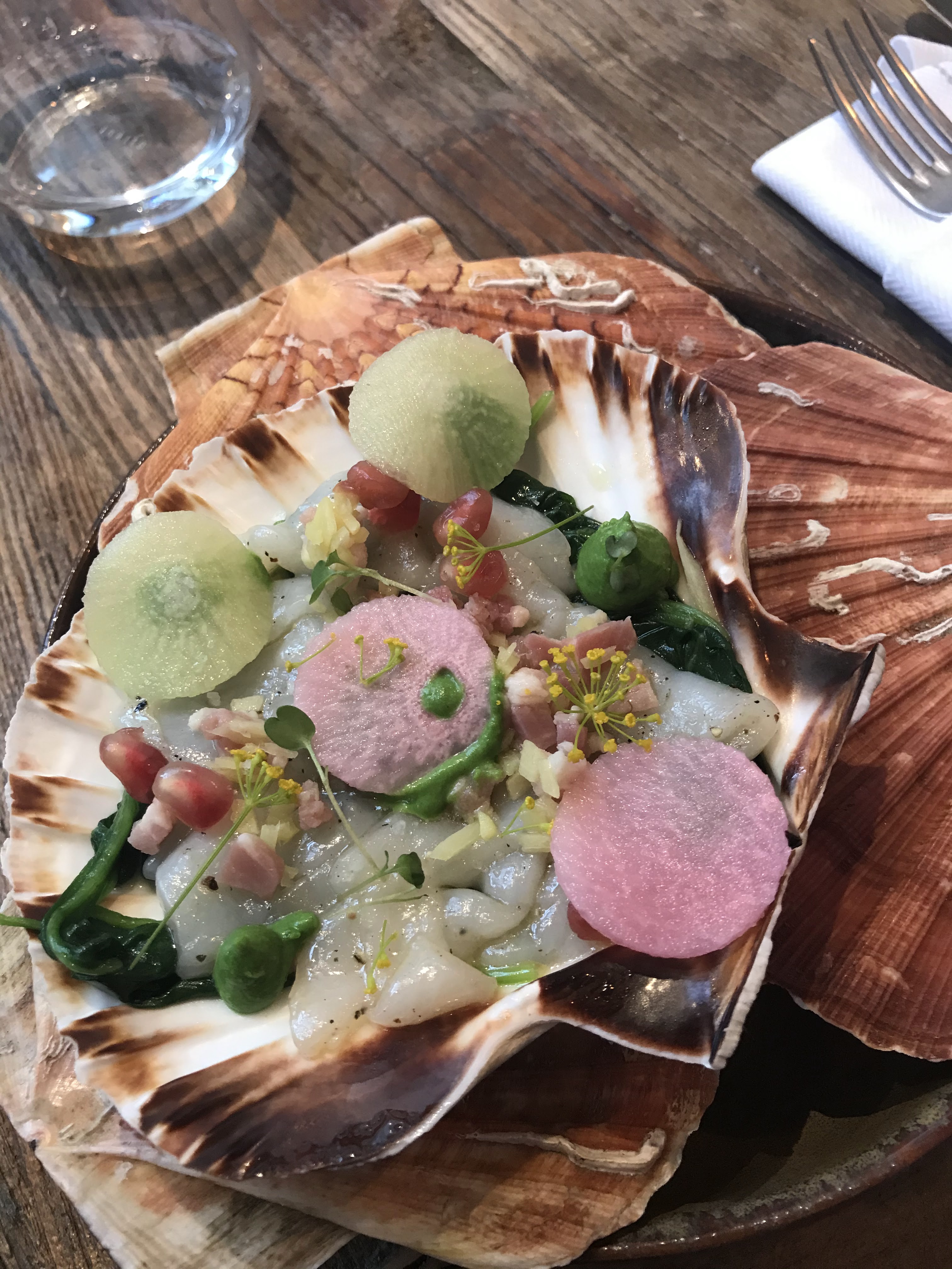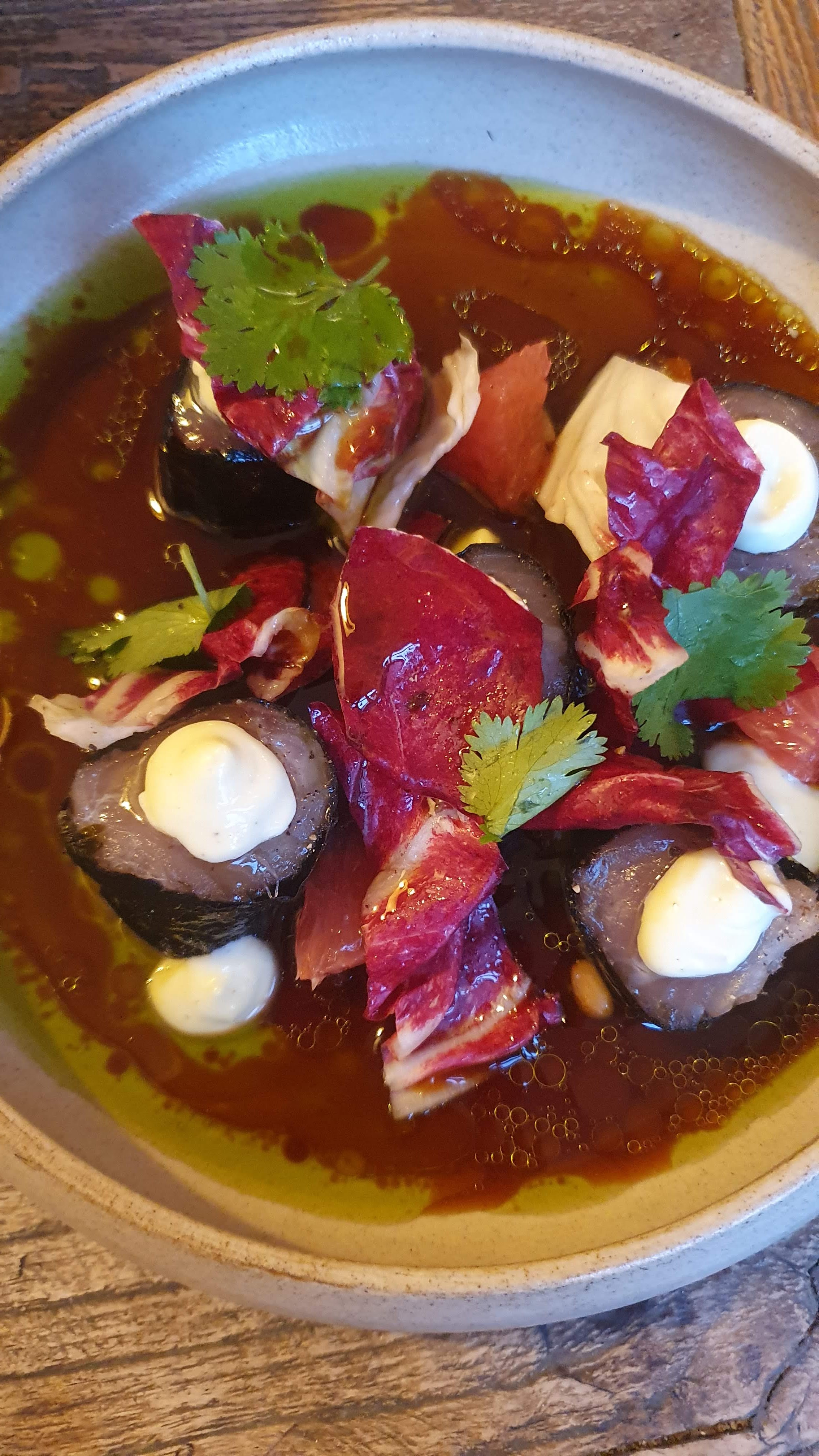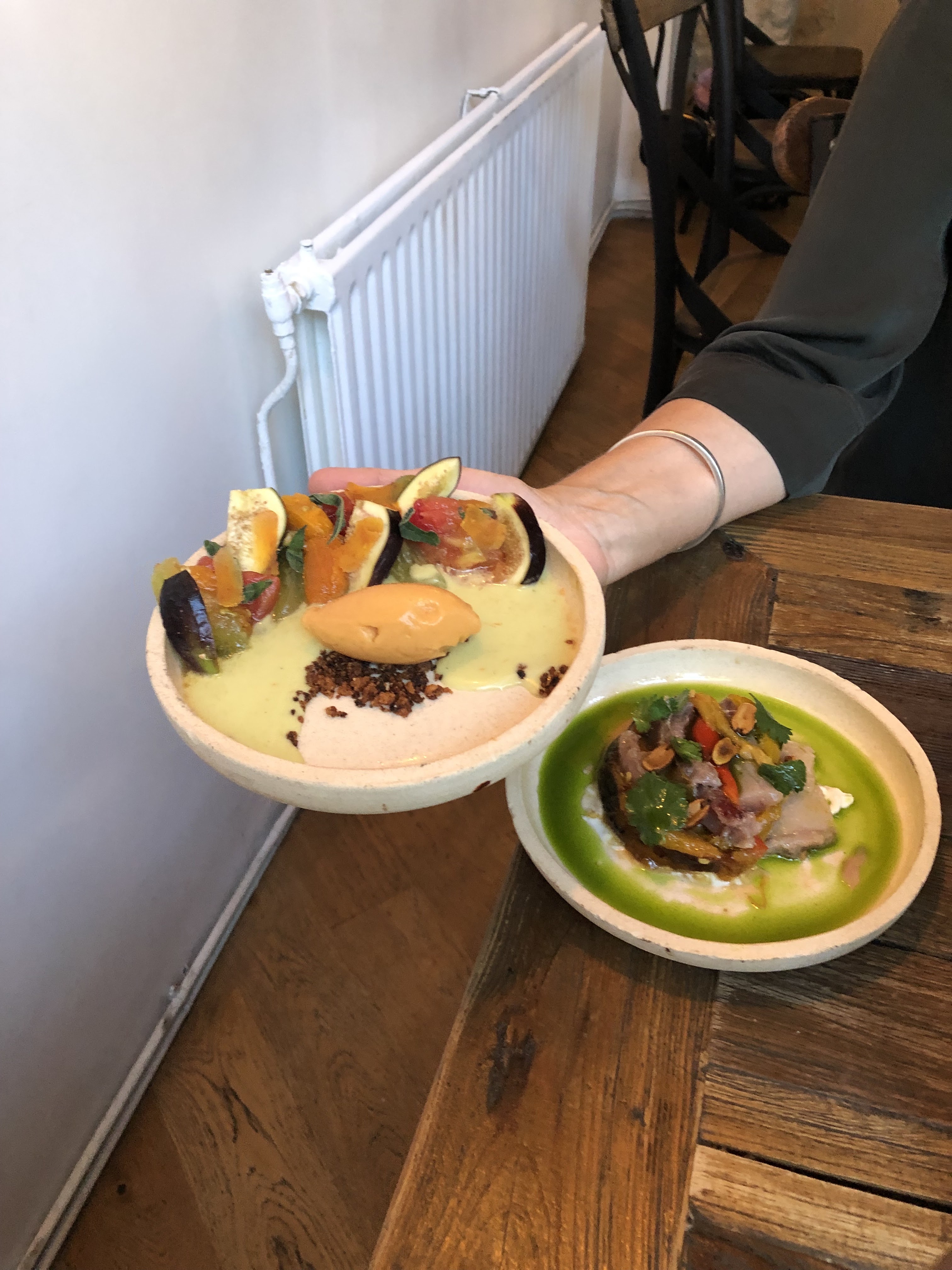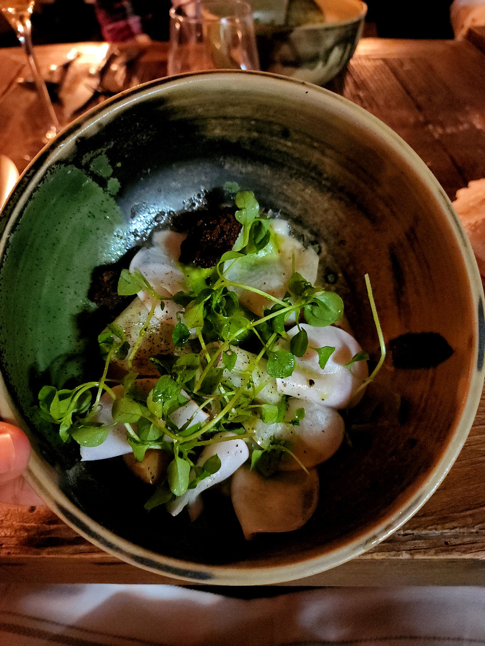 Une très jolie déco, simple, fraiche, et en même temps chaleureuse, tendance nature et sobriété contemporaines. La vaisselle est ravissante et créative. Une cuisine très inventive, qui revisite des classiques avec surprise, talent et grande créativité: la pissaladière gonflée, le lieu jaune cuit à point avec sa peau surgrillée sur braises, des gyosa verdis et farce et bouillon aux coques extrêmement goûteuses.