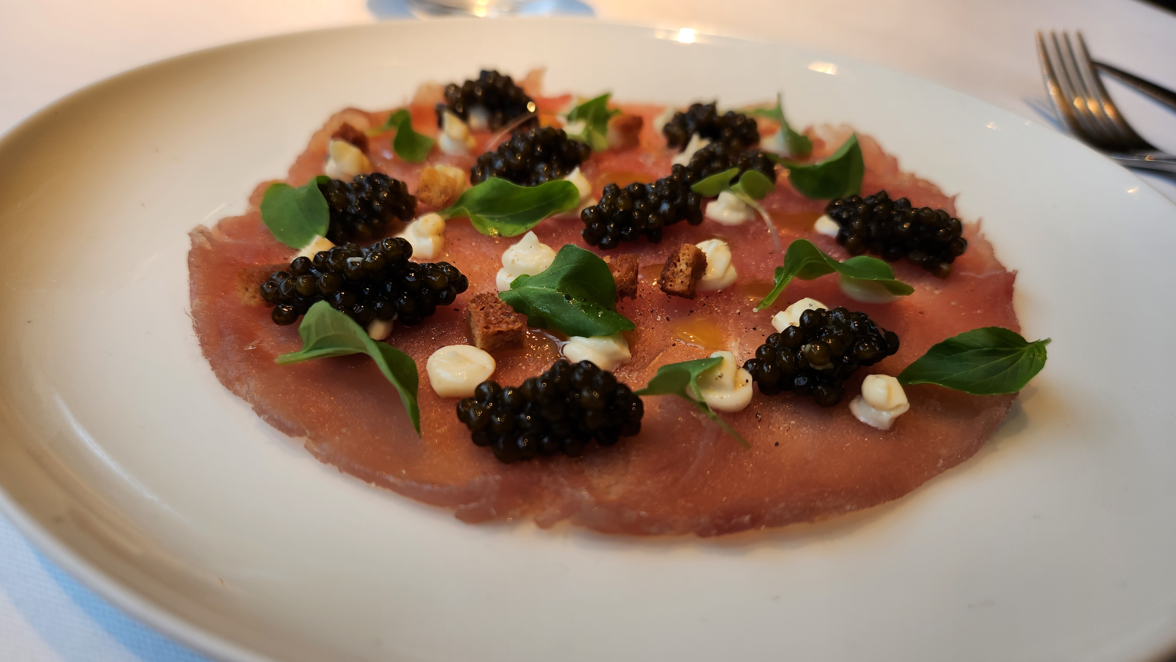 Saumon fumé, tartare de bœuf, tagliatelles le tout servi avec des tas de béluga ! Super cher et super chic