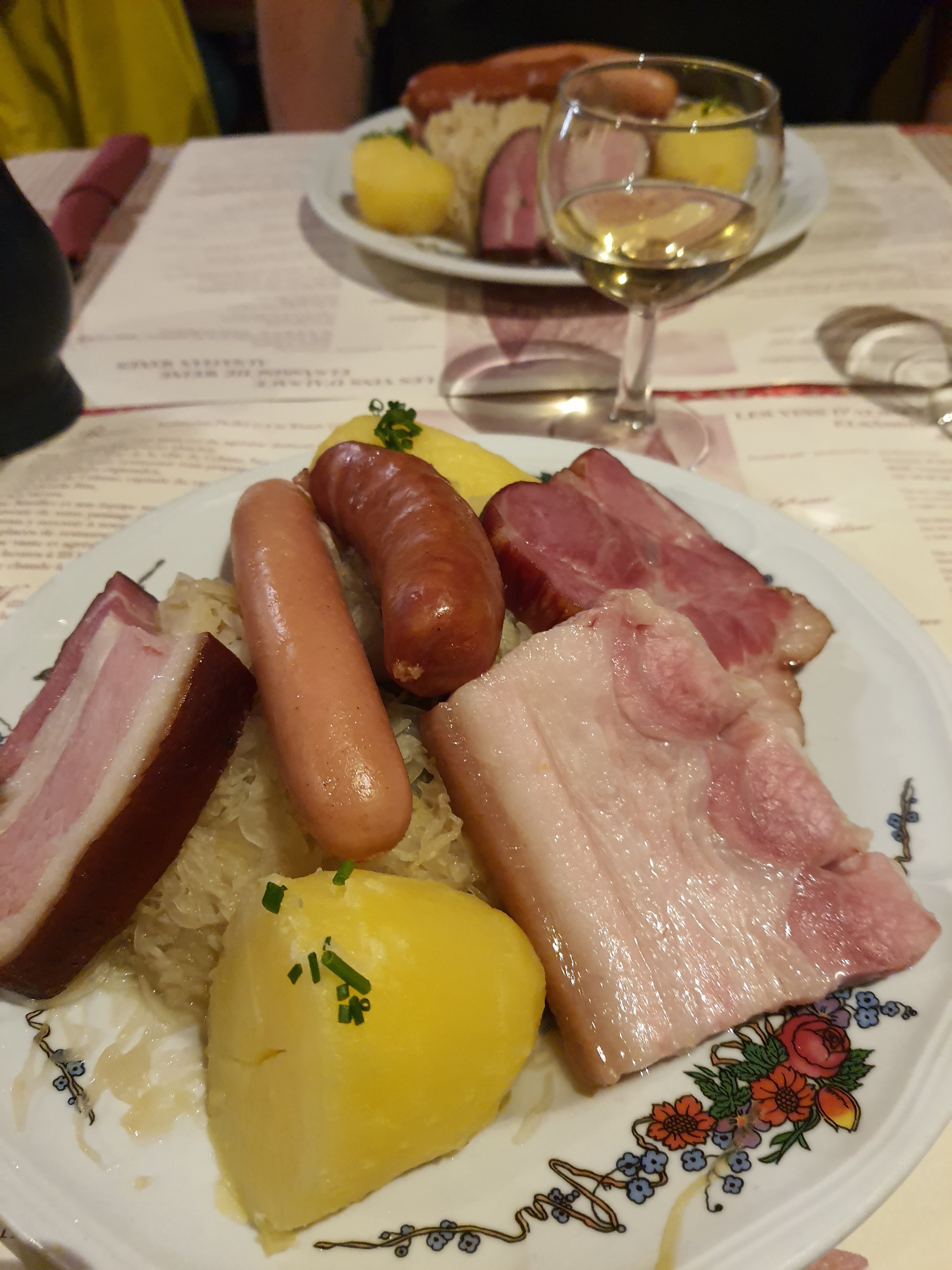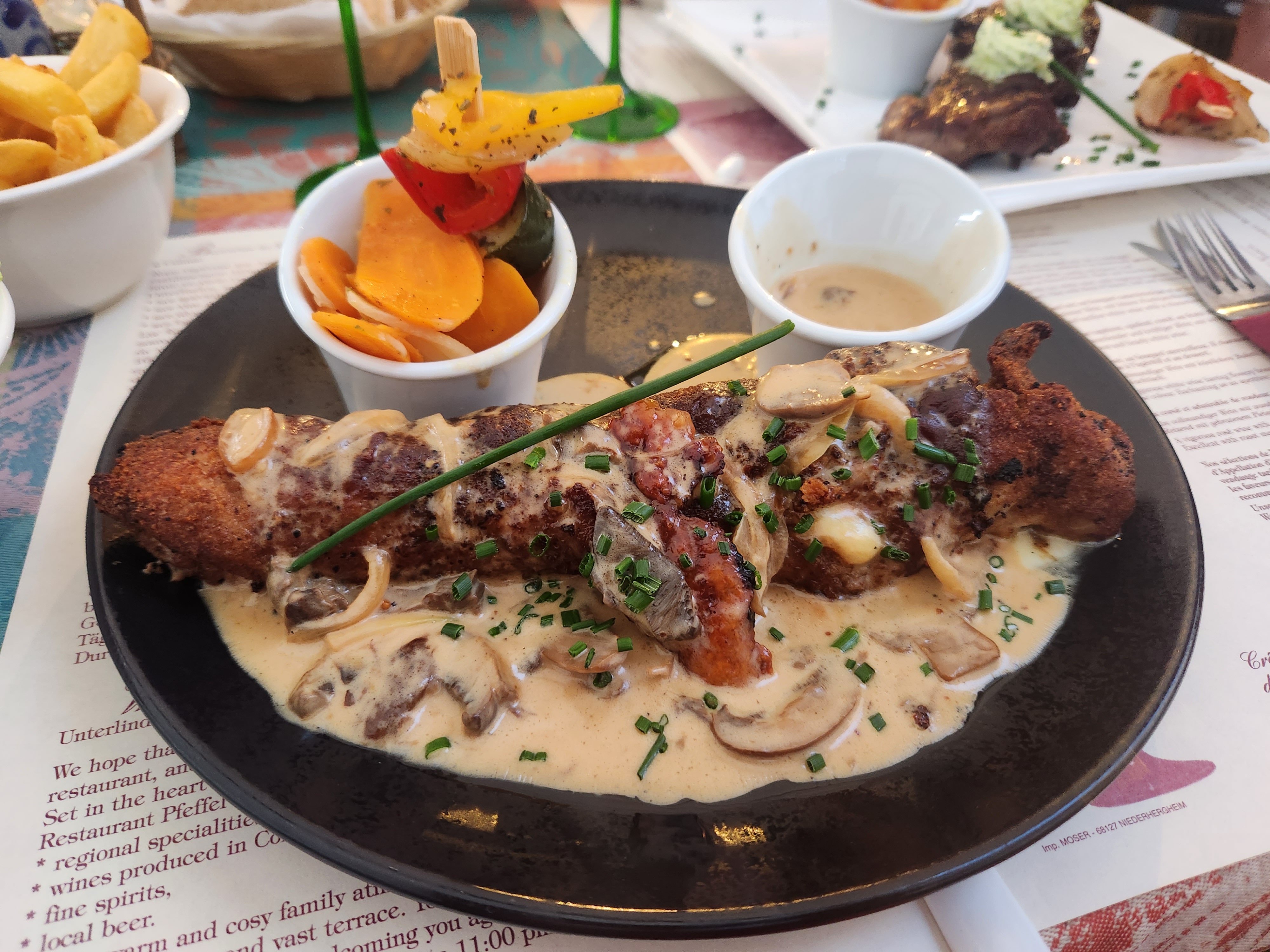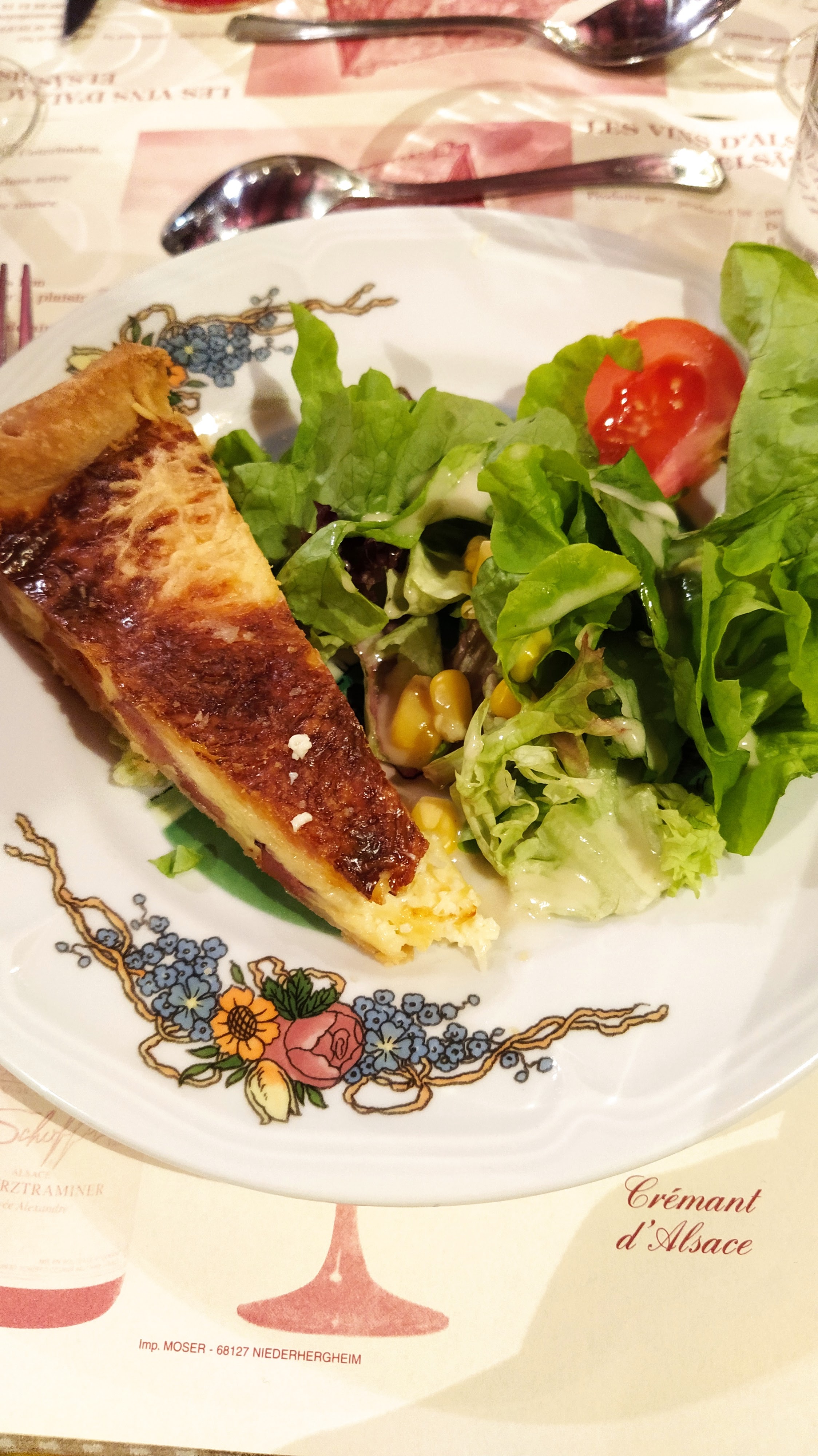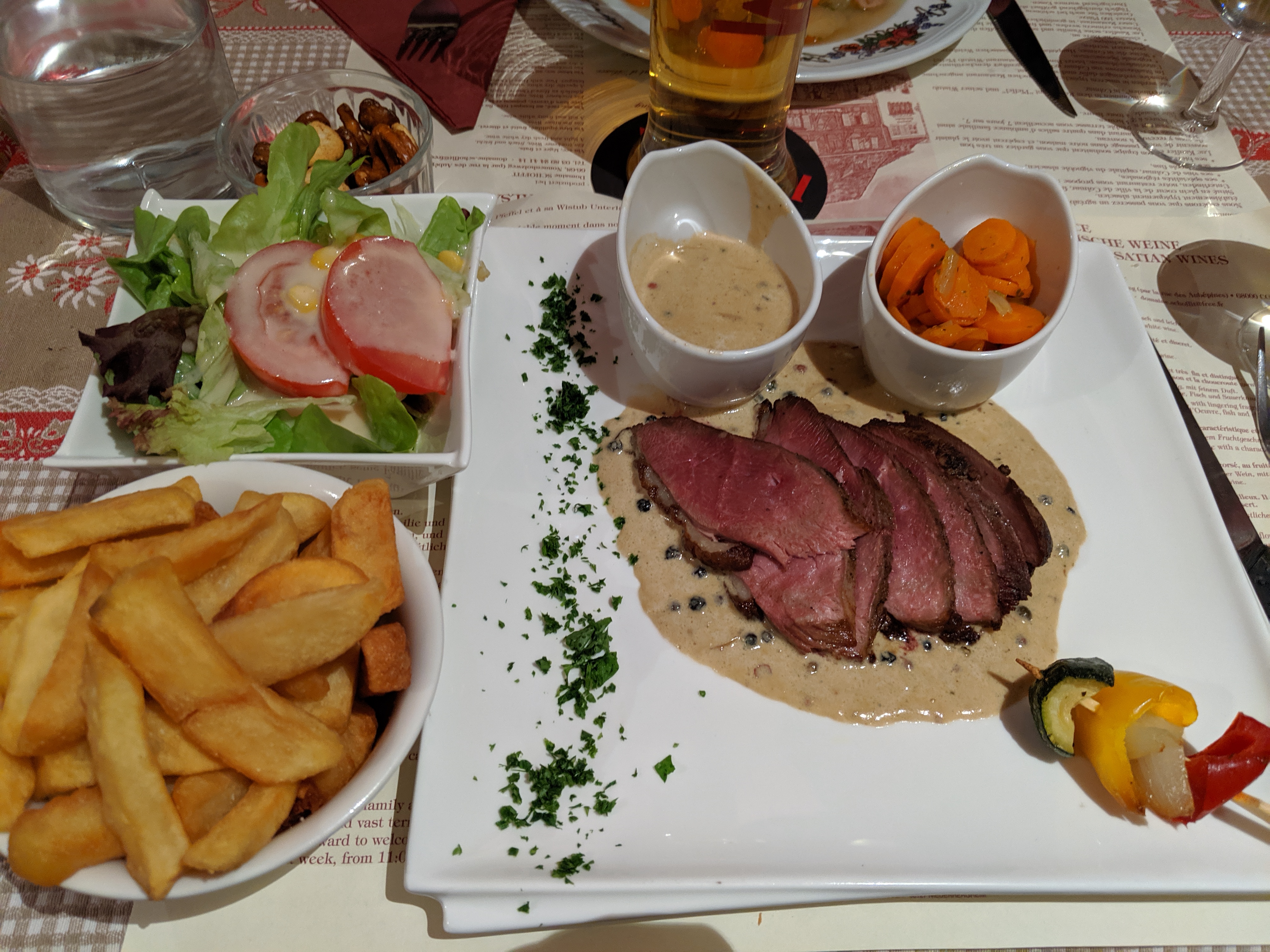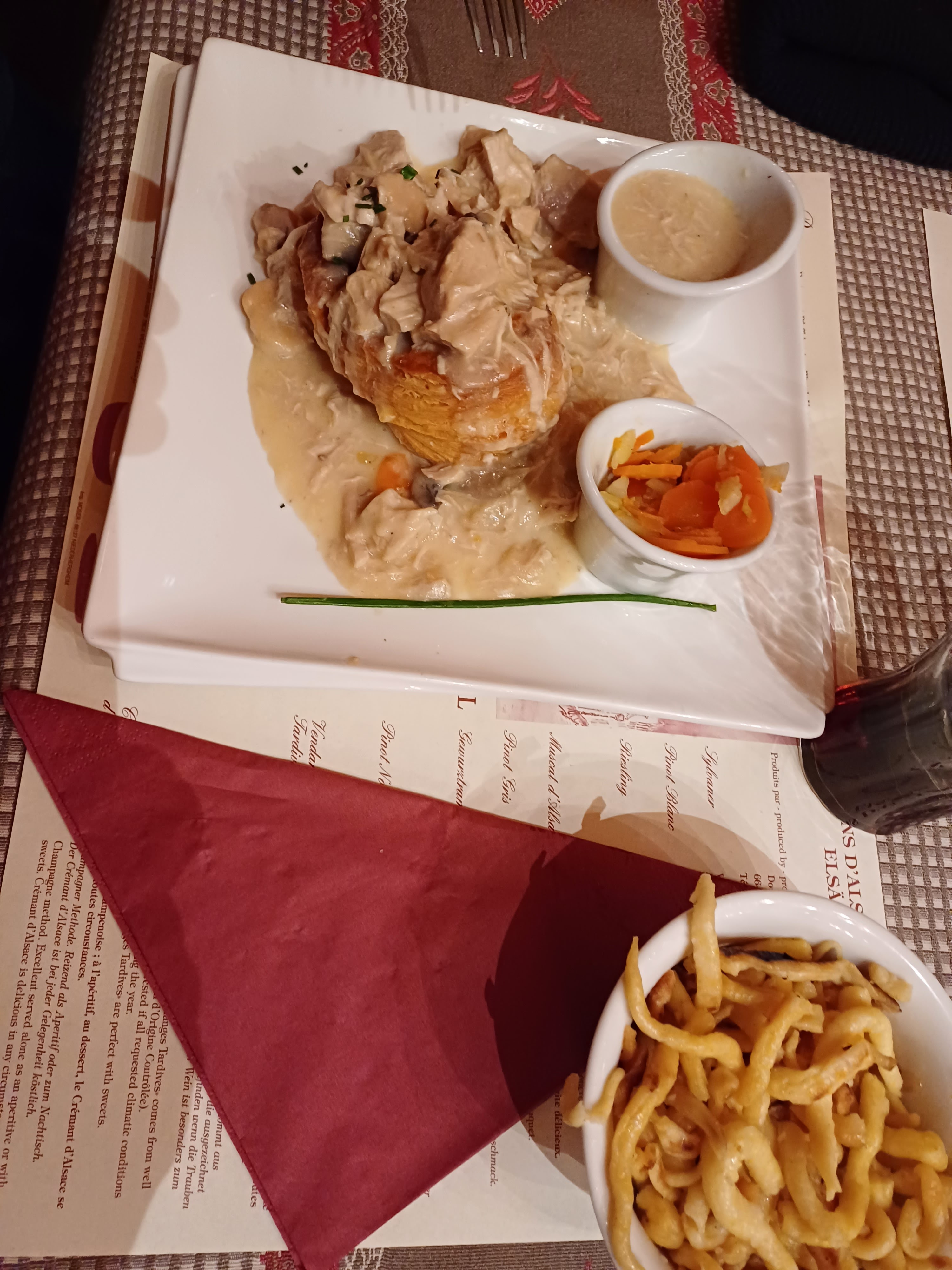 Le personnel à l'entrée est vraiment utile pour les touristes. Vous pouvez y déguster une cuisine française et allemande, par ex. Khuckle de porc braisé, escargots, vol au vent de porc. Je ne recommande pas le steak de surlonge. Du ketchup et un menu anglais sont fournis. Pour les amateurs de vin, vous pouvez essayer le vin local de la région alsacienne française.