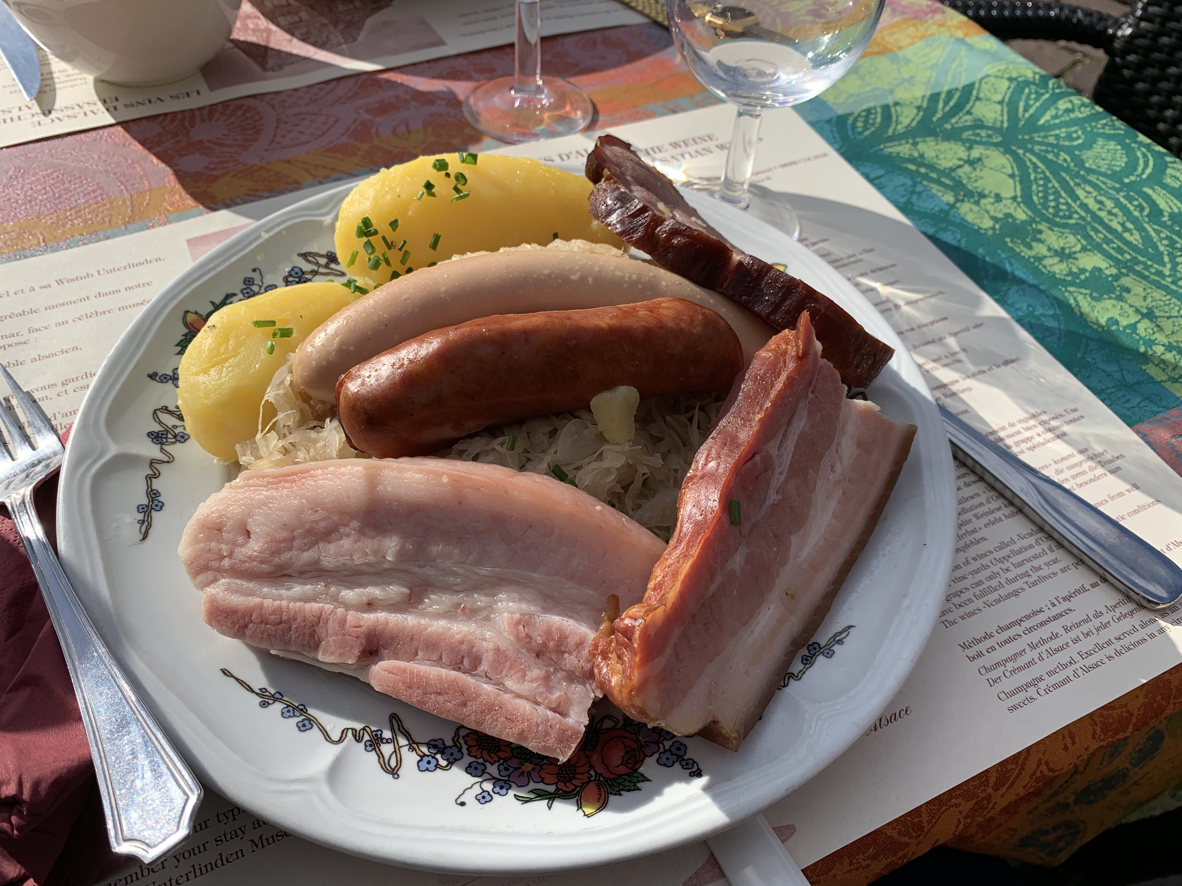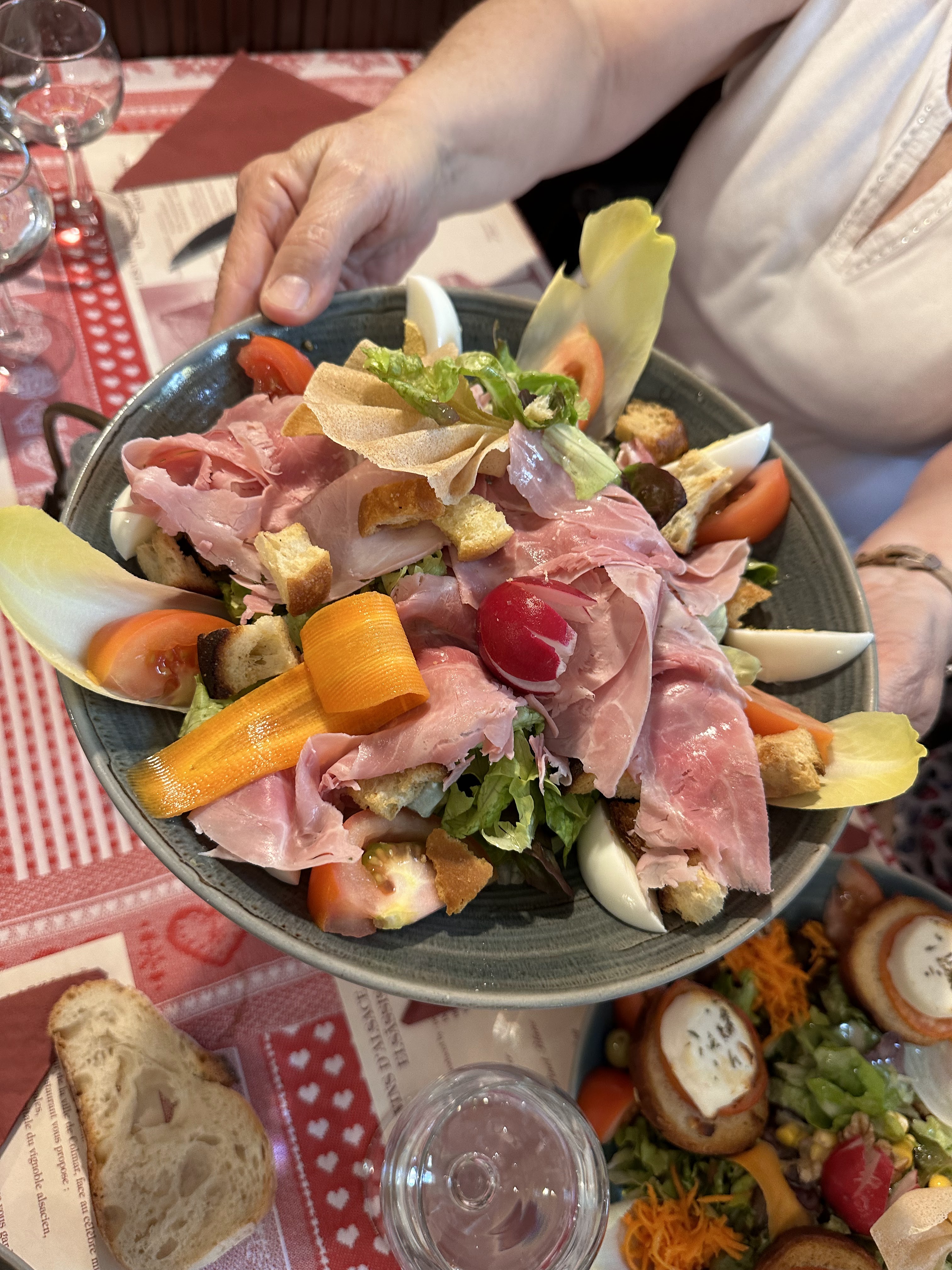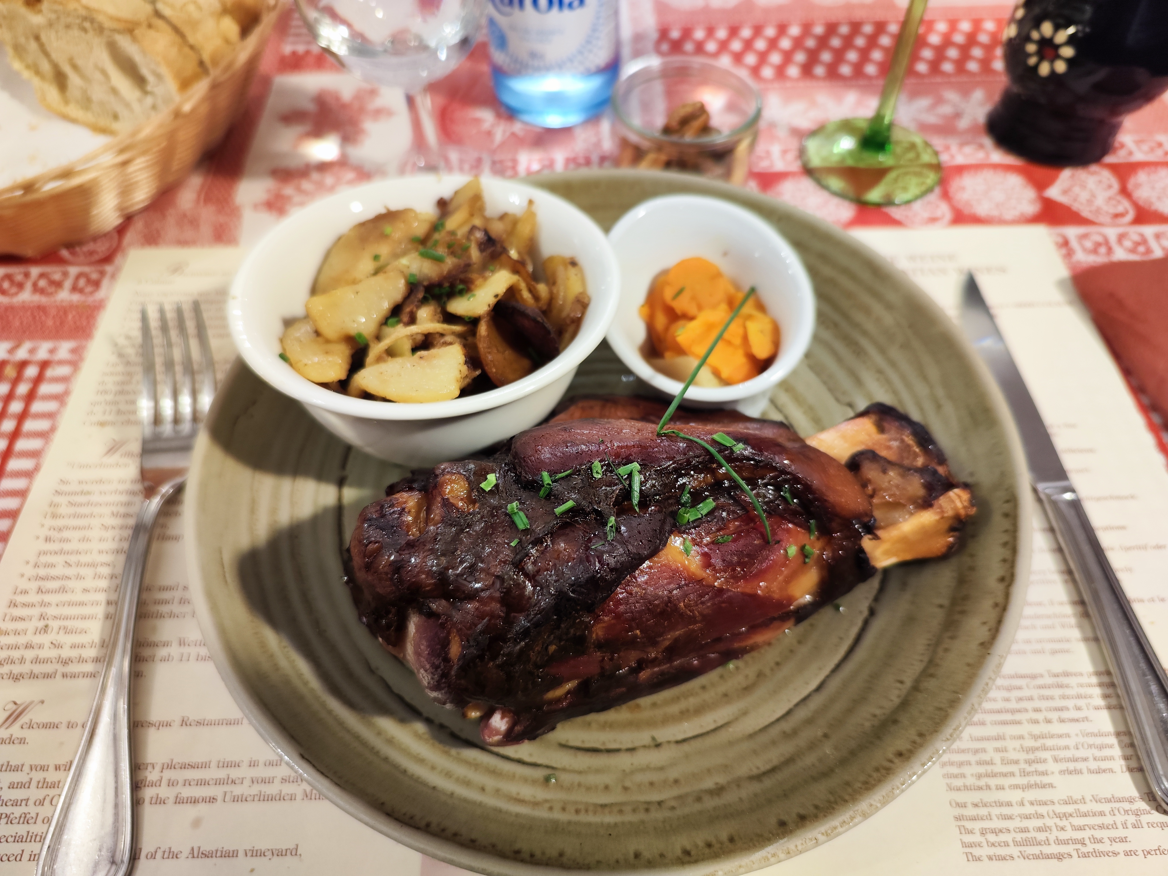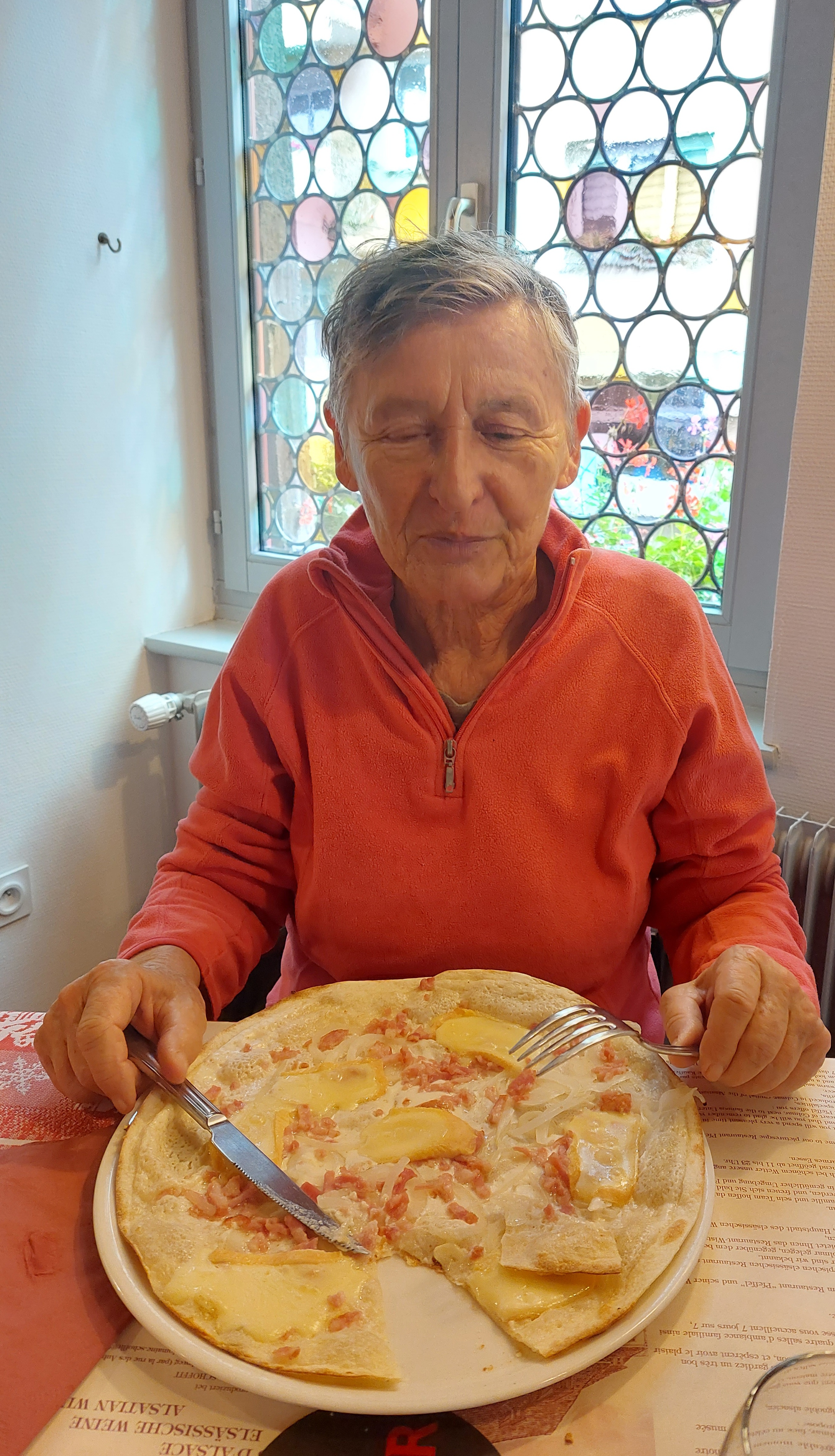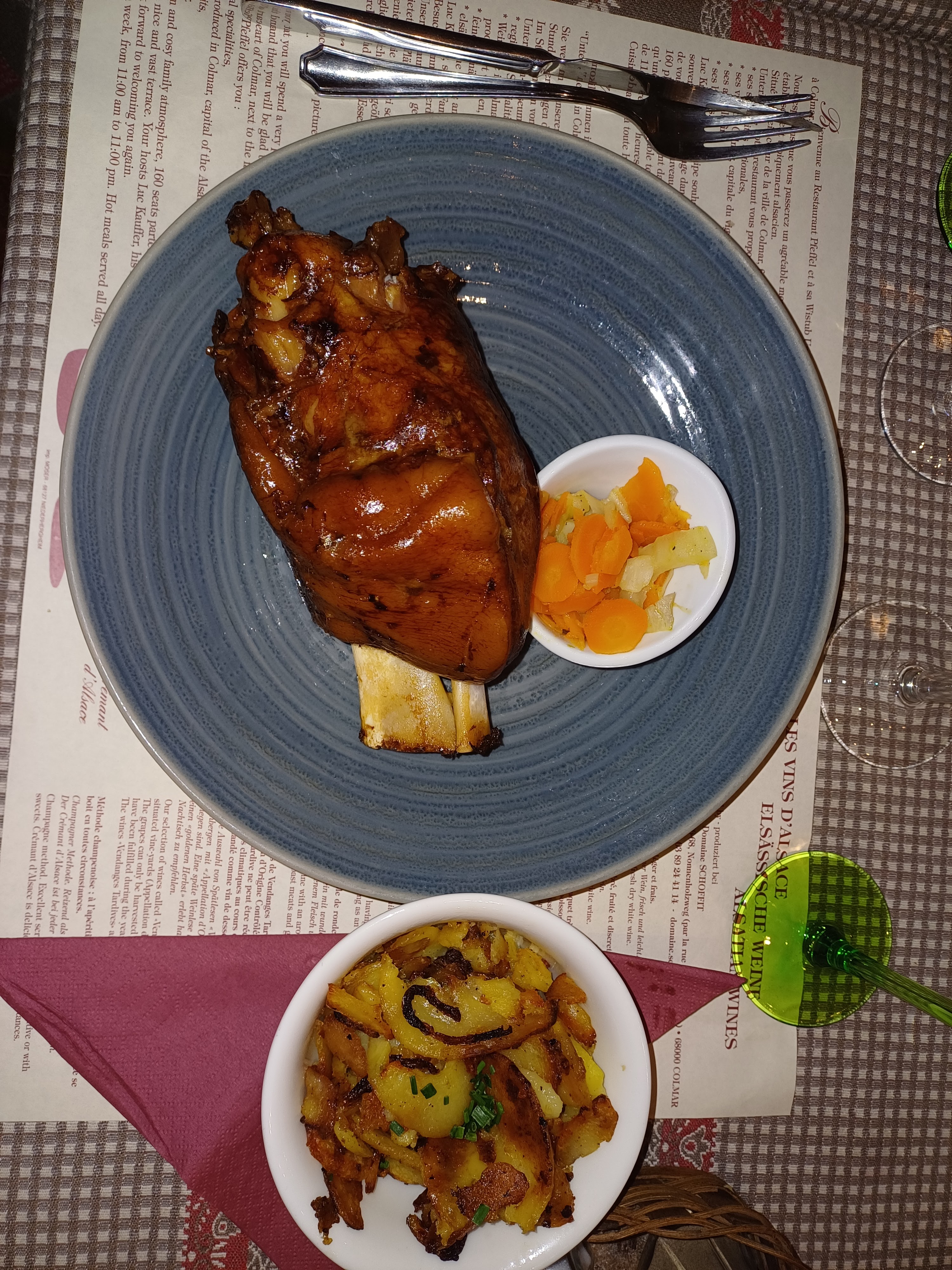 Le personnel à l'entrée est vraiment utile pour les touristes. Vous pouvez y déguster une cuisine française et allemande, par ex. Khuckle de porc braisé, escargots, vol au vent de porc. Je ne recommande pas le steak de surlonge. Du ketchup et un menu anglais sont fournis. Pour les amateurs de vin, vous pouvez essayer le vin local de la région alsacienne française.