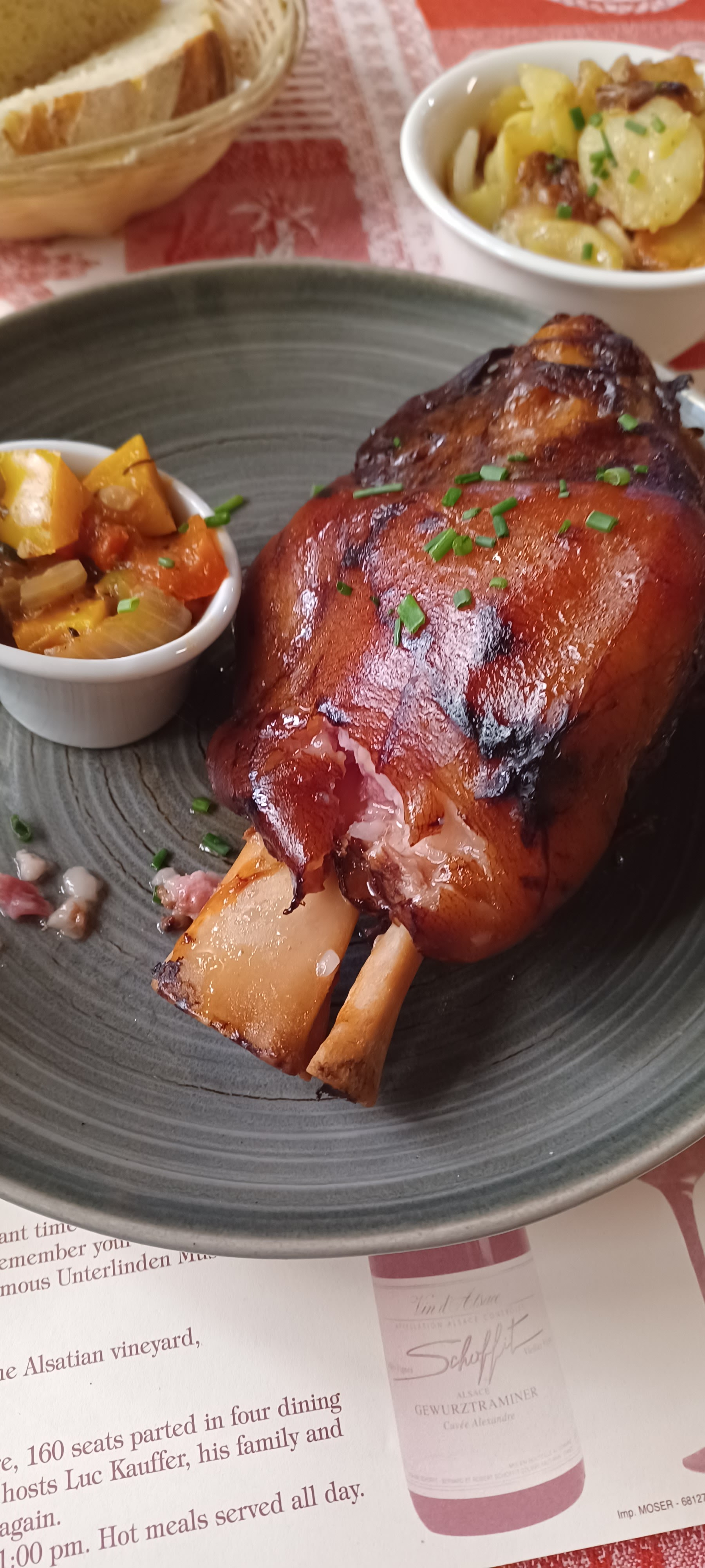 Quel super restaurant cosy qui propose une cuisine locale et un menu anglais ! Soyez prévenu que les portions sont ÉNORMES ici. Nous aurions facilement pu partager le baeckeoffe entre nous deux, si nous l'avions su. Mon mari l'a commandé pour lui-même et j'ai commandé un menu à quatre plats car c'était ma première nuit en France et j'avais hâte de tout essayer. J'ai supposé qu'il s'agirait de petites portions de chaque plat, mais il s'est avéré que c'était des portions régulières - et quatre d'entre elles ! Le prix élevé aurait dû me prévenir, mais nous venions tout juste d'arriver de Suisse et étions habitués à des plats extrêmement chers, donc je n'avais pas réalisé à quel point le repas était cher. Encore une fois, nous aurions facilement pu partager le menu de quatre plats entre nous deux si nous l'avions réalisé. La serveuse a dû penser que nous étions fous de commander autant, mais si elle l'a fait, elle l'a très bien gardé pour elle ! C’est peut-être ainsi que mangent les Alsaciens ! Nous avons fait de notre mieux pour manger autant que possible. Tout était très délicieux et le service était très bon. Bonus : notre serveuse est un sosie total du cousin de mon mari. Elle pensait probablement que j'avais le béguin pour elle avec la façon dont je lui volais constamment des regards !