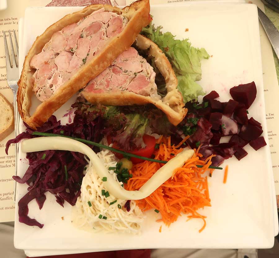 Magnifique sélection traditionnelle. J'ai eu la tarte à l'oignon et un verre de vin. Ils comprenaient une salade de légumes coupés. Merveilleux! Repas en plein air avec une superbe vue sur le quartier historique.
