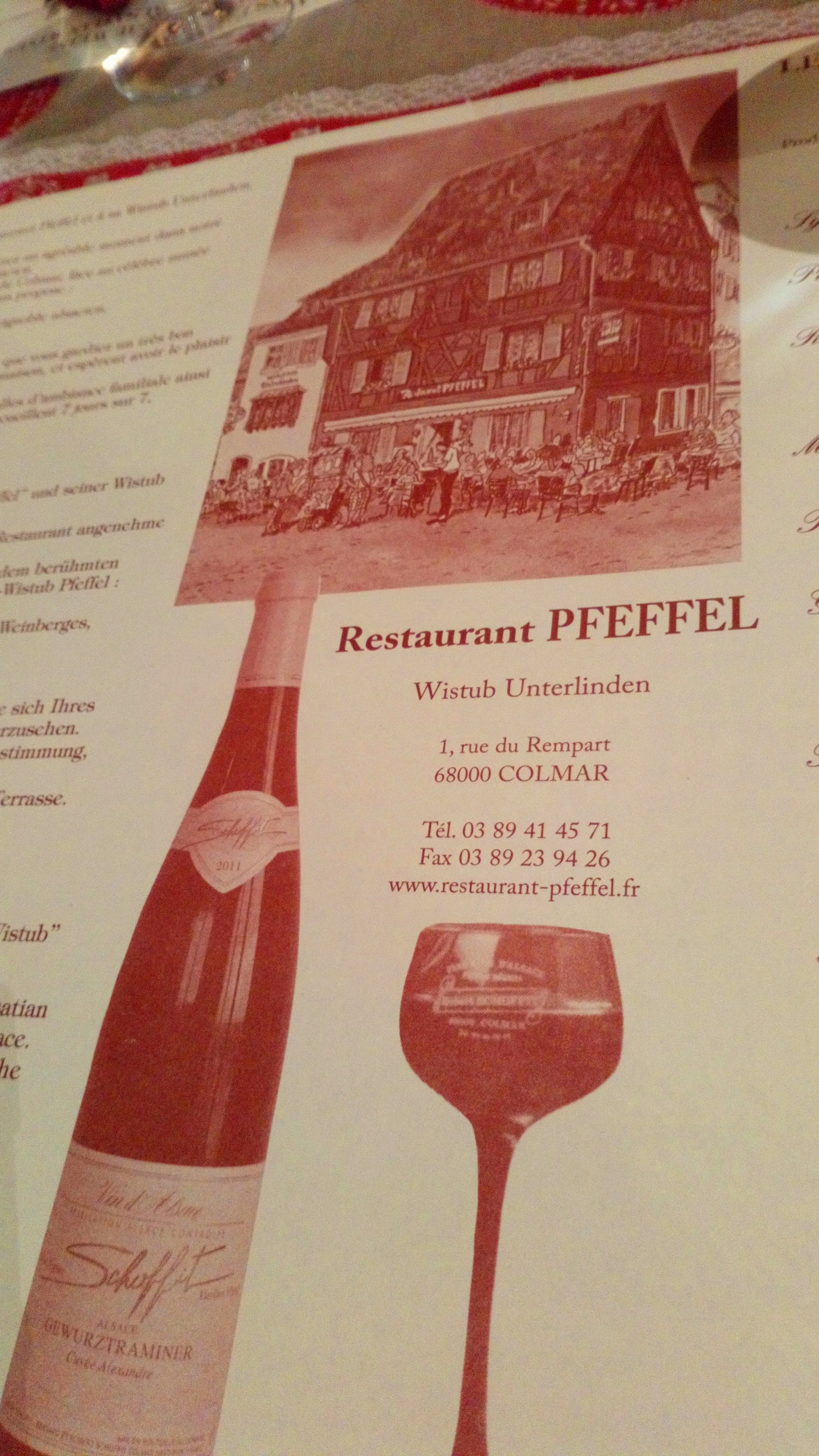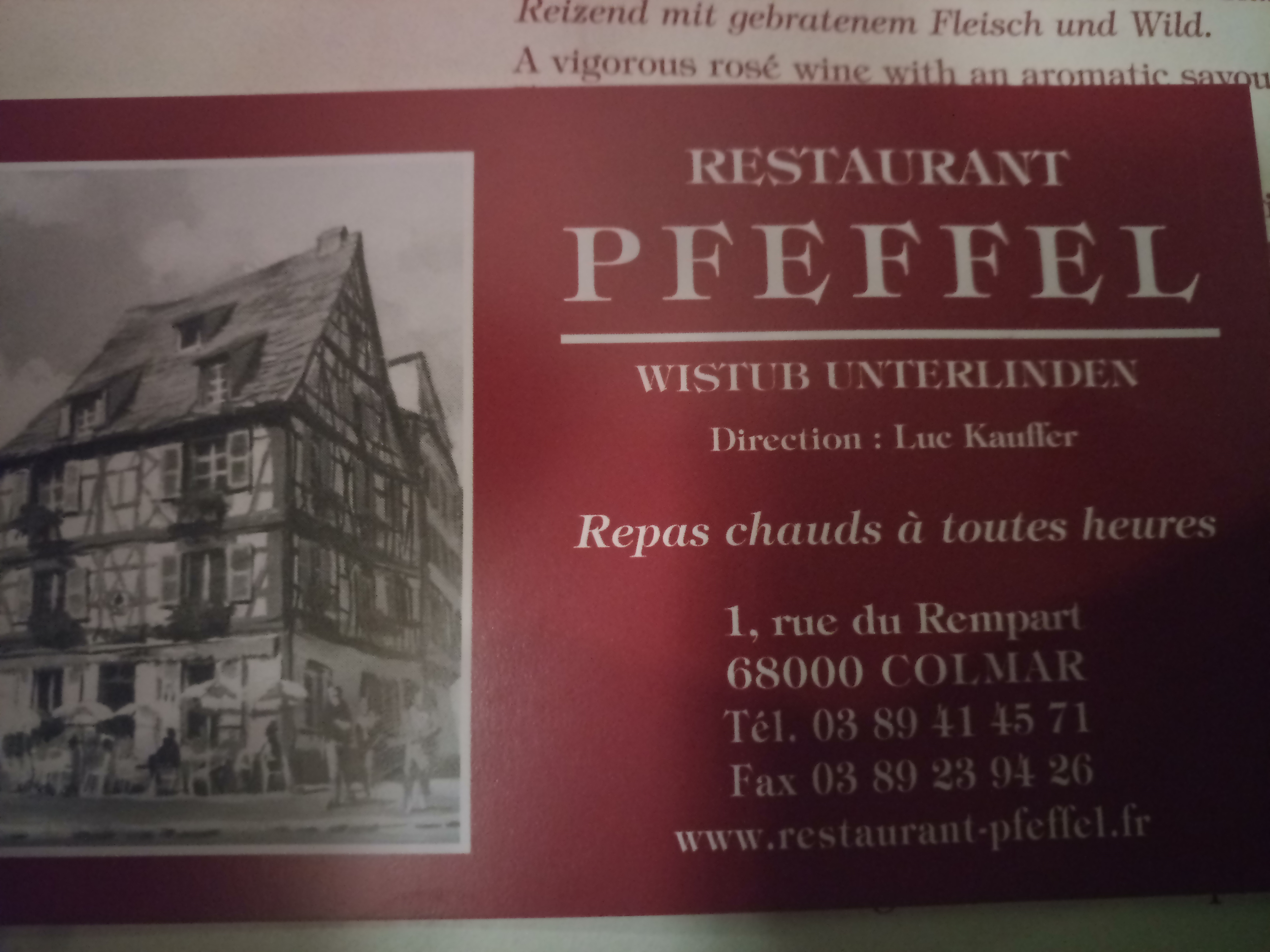 Dans une des plus belles villes de France (voire du monde !), sur une place magnifique, le restaurant présenté une carte de spécialités typique mais aussi des plats plus moderne. Une très belle vue sur le musée Unterlinden, 3 salles et une terrasse à l'ombre des tilleuls font du Pfeffel un endroit incontournable. Allez y sans hésiter, personnes ne ressort déçu.