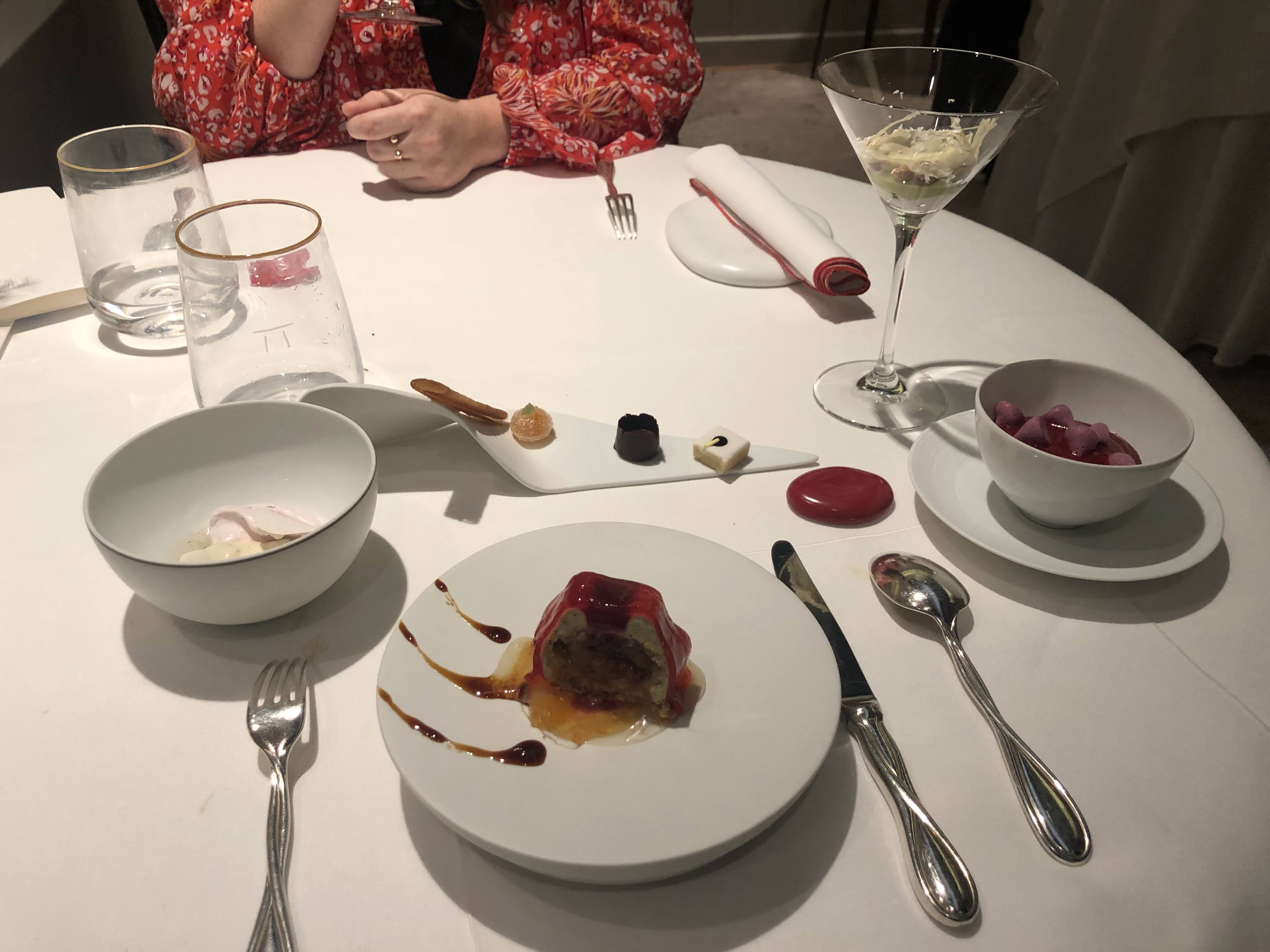 Quelques plats du menu déjeuner de très belle facture. Des mets exceptionnels (les mises en bouche, le fera, l’huître tiède et fruits de mer, le rouget, le canard, et les desserts). Mention spéciale à la palette de saveurs en dessert - un monde de découvertes et de surprises. Le plat le plus surprenant de ce tasting. Bon rapport qualité prix au déjeuner. Seul bémol : nous sommes très habitués des grandes tables et avons été surpris par un service assez éloigné du rapport humain, très sur la réserve, trop sur l’attention de tous les instants qui laisse peu de place à l’émotion et la spontanéité. Ce que nous venons chercher à la table des chefs en nom propre est justement ce supplément d’âme que nous n’avons pas ressenti ici. Aucune petite attention - pas de menu au départ, pas le mini boxing chocolat/friandise, pas de petit geste clin d’œil qui pose une signature sur le souvenir, pas une seule touche d’expérience client pour fidéliser la clientèle. Expérience à vivre cependant, que nous recommandons pour qui est curieux de l’univers culinaire d’un maître. Mais une légère déception face à l’expérience à laquelle le chef Gagnaire nous avait habitués à ses autres tables.