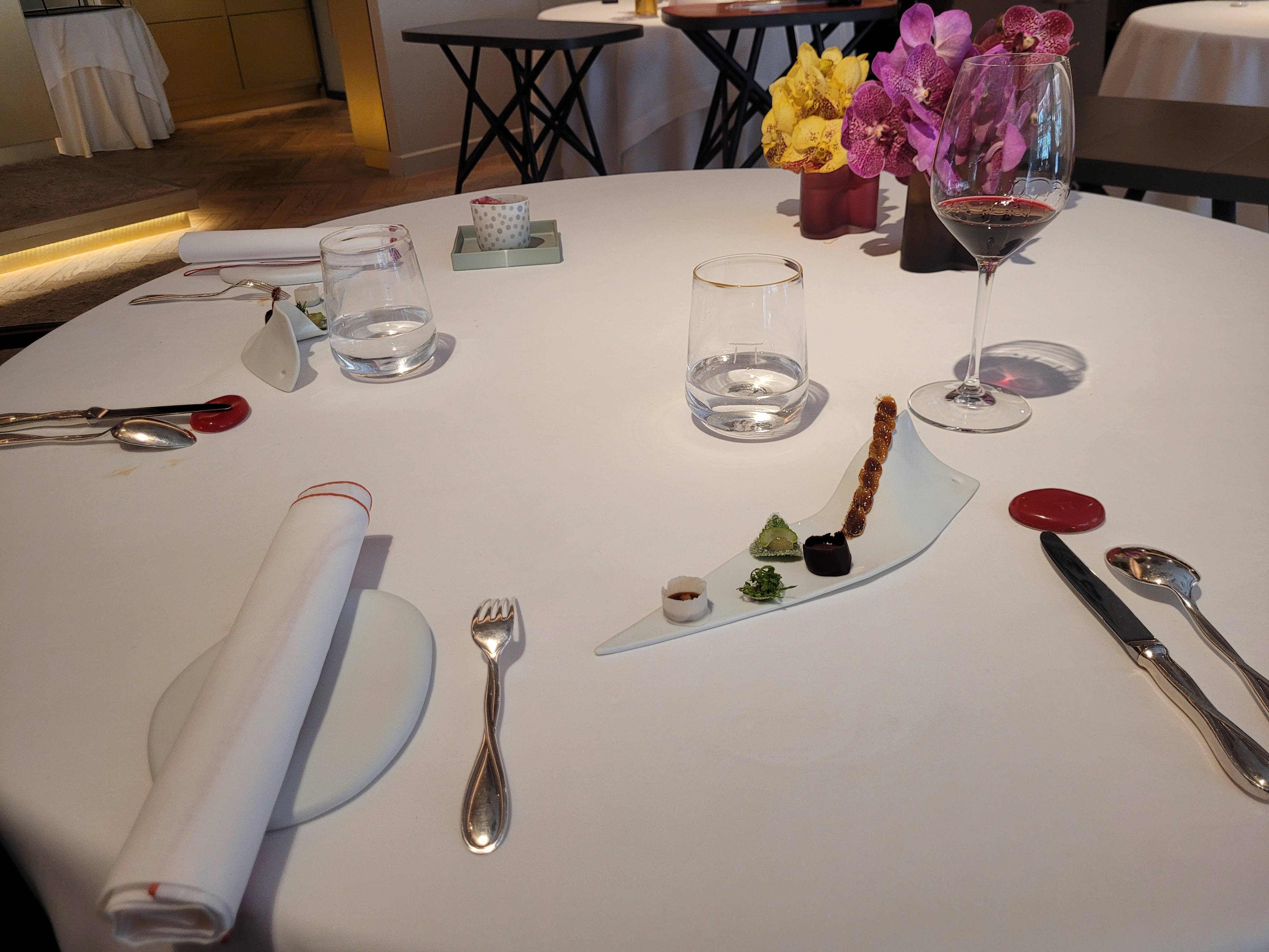 Une soirée tellement delicieuse, de la cuisine exceptionnelle, un service irréprochable 4h00 de pur bonheur. Merci MONSIEUR Gagnaire, de l'art a l'etat pur.