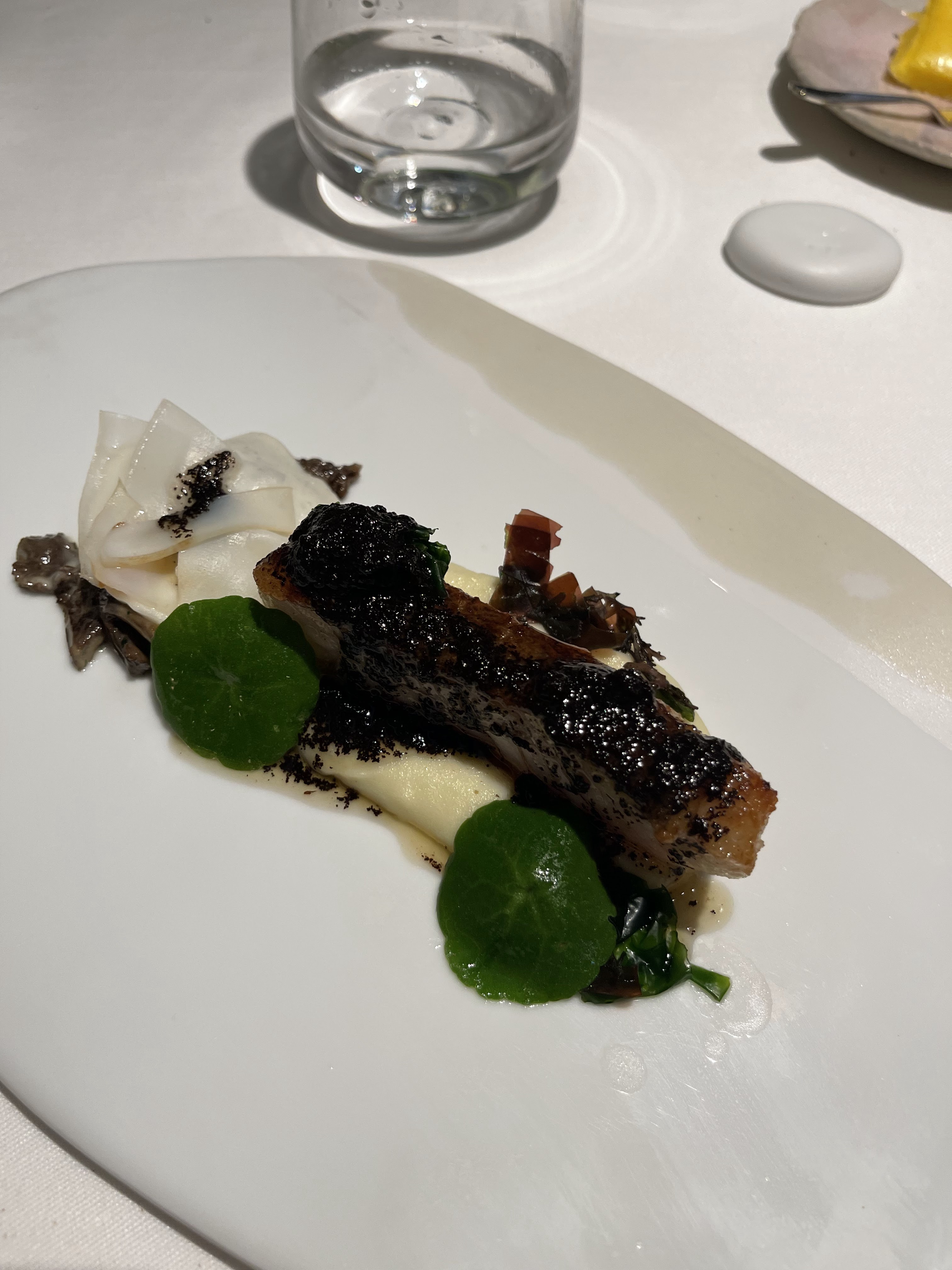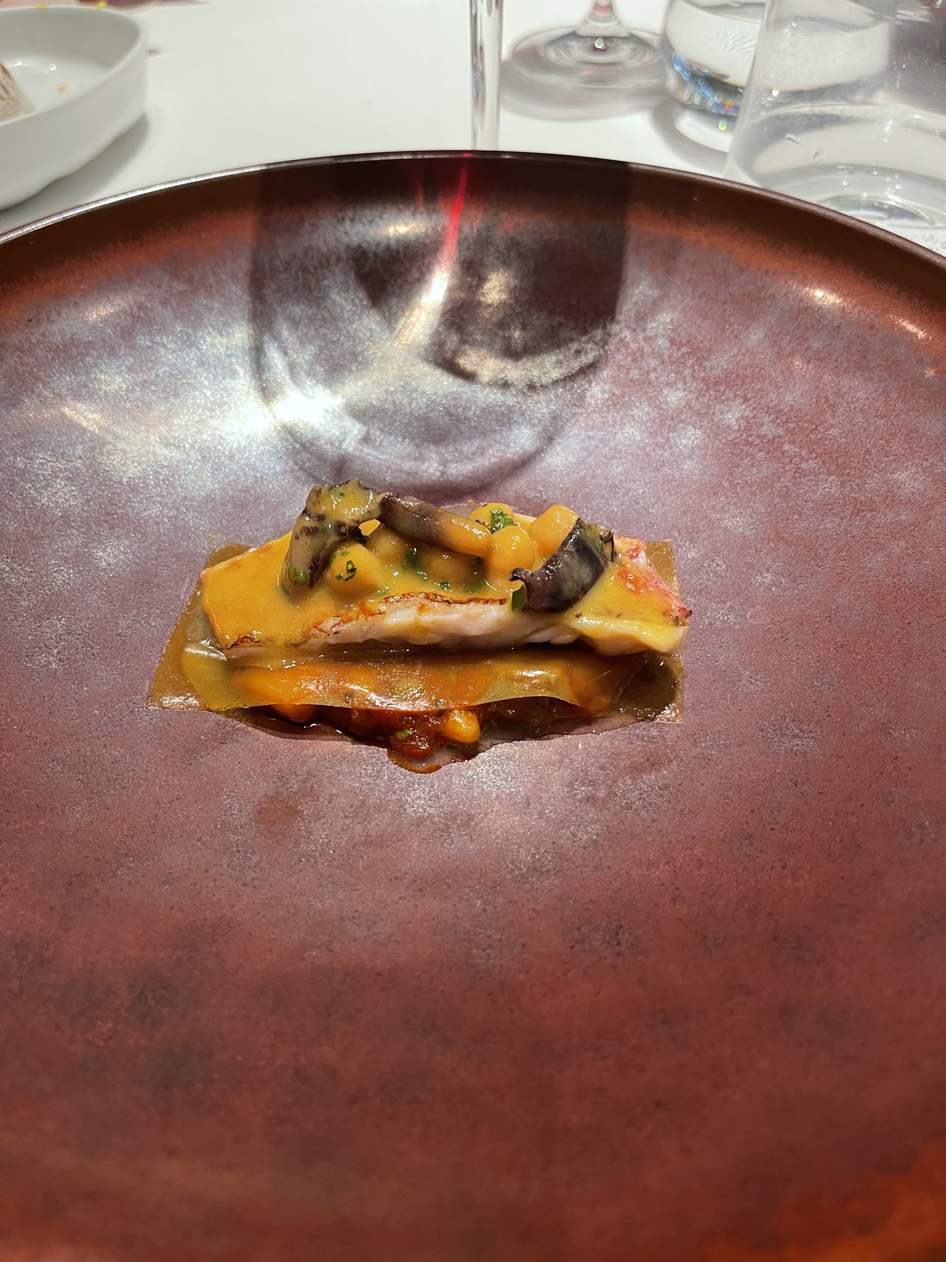 Très bonne exécution technique et cuisine innovante très élaborée. Belle présentation. Ambiance charmante, décoration excellente et service professionnel. En termes de goût et d'équilibre, ce n'est peut-être pas le restaurant 3 étoiles le plus impressionnant (peut-être à cause de trop de saveurs des plats d'accompagnement de la taille d'une mignardise) mais je crois que Monsieur Gagnaire n'était pas dans la cuisine et la dispersion des notes peut refléter cela, ou peut-être que je suis juste plus prédisposé. à la cuisine traditionnelle française. Cela reste une très bonne expérience dans l'ensemble.