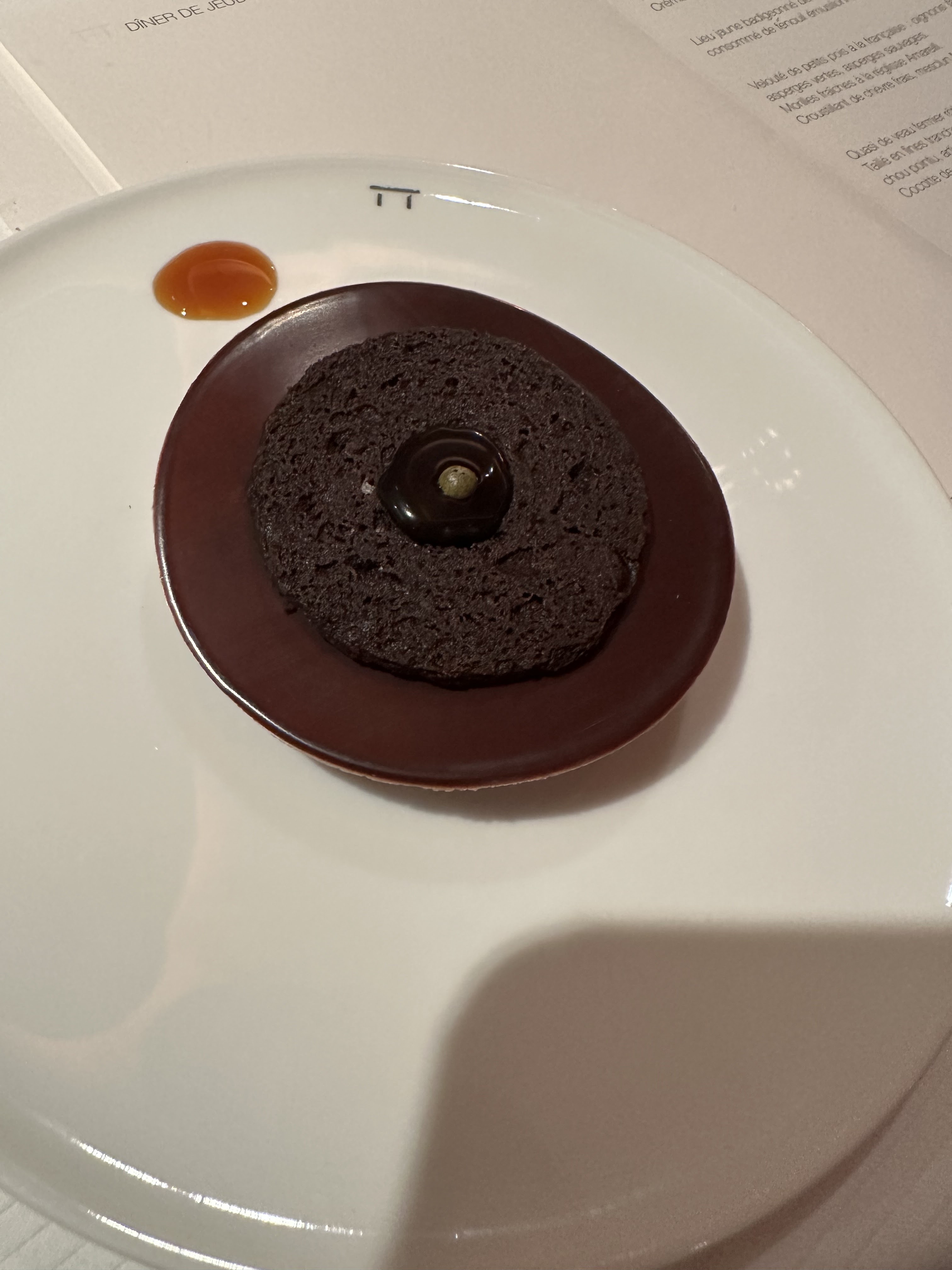 Comprenez un temple 3* de la gastronomie française. Mais les options de menu du menu Dégustation composé principalement de crustacés, du menu Truffes, du menu Gibier et de la carte sont folles pour la cuisine et le client. Nous avons opté pour l'option à la carte qui s'est soldée par des entrées de 5 à 6 bouchées suivies d'un plat principal avec 5 assiettes différentes suivi d'un plat principal avec 3 à 4 assiettes et d'un dessert car 9 assiettes, c'est ridicule, qui peut manger tout ça. nourriture ? Ayant séjourné dans la plupart des établissements 3* de Paris pendant plusieurs années, cela devrait être l'expérience la moins agréable de toutes et une déception pour une fête d'anniversaire spéciale. Pour couronner le tout, une maigre couche de chocolat sur une assiette avec une bougie d'anniversaire perchée dessus 🤷🏻♂️