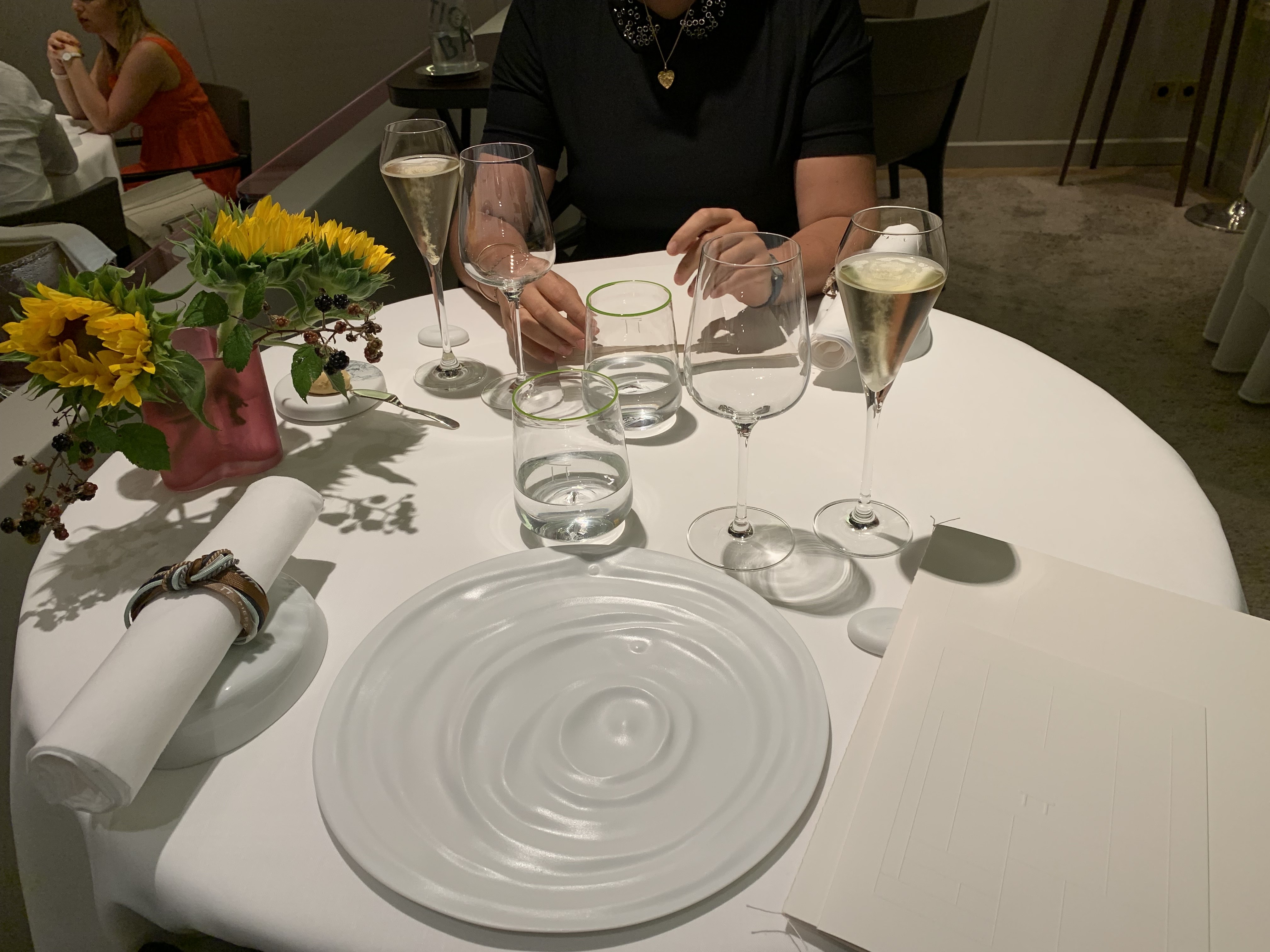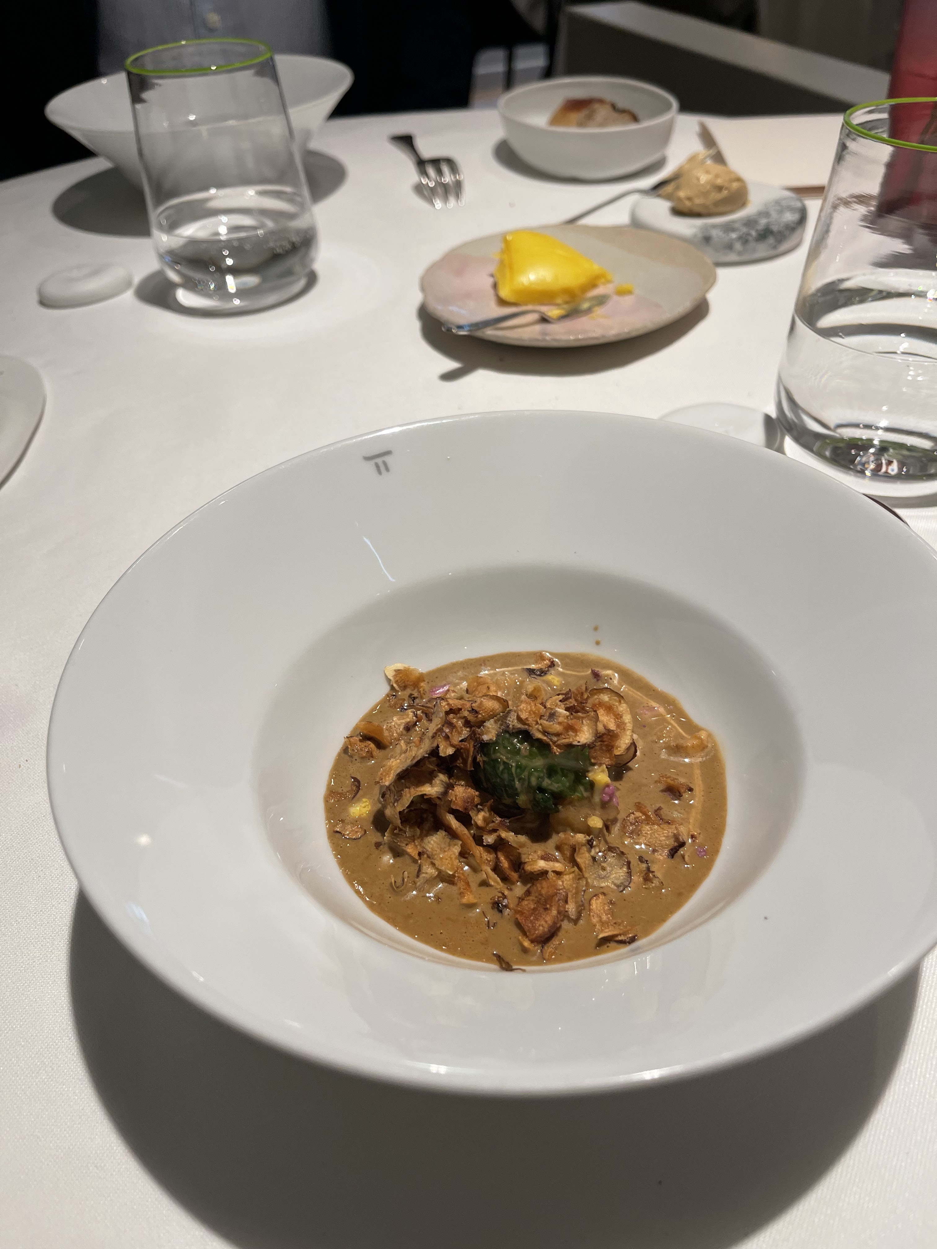 Premièrement, le personnel. Les serveurs étaient incroyables. Poli, compétent. Le sommelier, pas insistant du tout. Les serveurs ont fait tout ce qu'ils pouvaient pour contourner l'allergie aux noix de ma petite amie. À l'écoute, professionnel, heureux. Dès l'instant où nous sommes entrés. Le restaurant en lui-même est magnifique. Beaucoup de belle touche artistique dans toute la salle à manger. Un étage un peu surélevé, petite touche amusante. Plantes et fleurs magnifiques. Bien éclairé mais pas dur. La nourriture, évidemment, était incroyable. Tout était bon, avec quelques petits plats difficiles ajoutés au mélange, comme un dessert à base de curcuma. Nous avons mangé de l'agneau pour le déjeuner et cela a changé notre vie. Mais là encore, chaque plat l’était aussi. Avec un menu déjeuner à 90 euros, ou environ 120 euros avec vin et café, c'est une expérience étoilée Michelin incroyablement accessible.