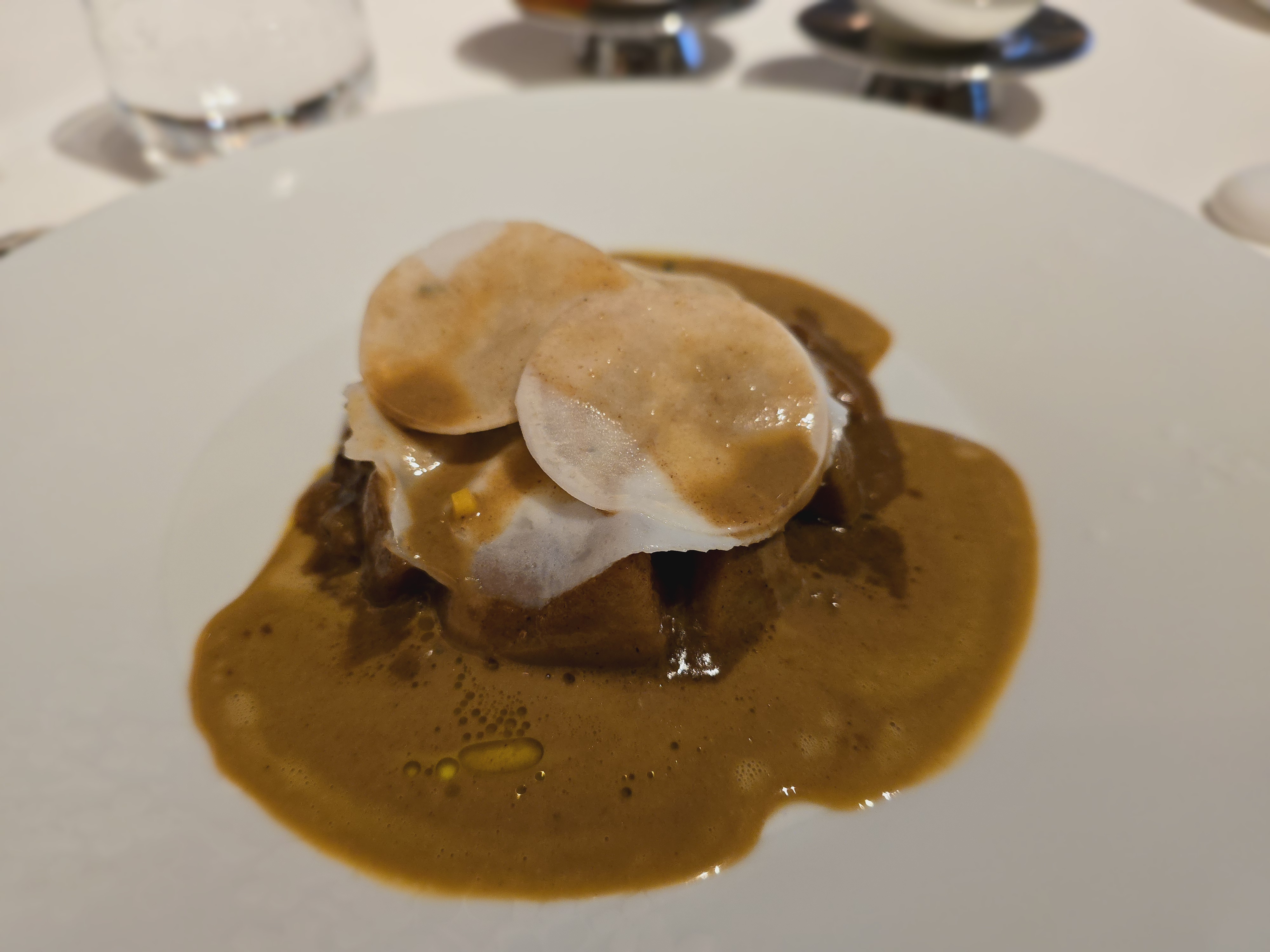 J'ai déjeuné ici avec ma fiancée, nous avons eu le menu du déjeuner à 180 par personne accompagné de deux thés. La nourriture était bien présentée et ma fiancée l'a appréciée comme l'une de ses premières fois dans un restaurant gastronomique. Personnellement, je n'ai pas particulièrement apprécié les saveurs des plats servis et j'en ai été un peu déçu compte tenu du prix, mais je suis heureuse qu'elle ait aimé la nourriture. Le service dans son ensemble était bon, mais pendant que j'étais aux toilettes, l'un des serveurs s'est approché de ma fiancée et lui a demandé d'où elle venait. Le café était correct pour l'Europe, mais il y avait de l'eau sur l'assiette et au fond de mon verre à expresso qui s'est ensuite répandue sur ma chemise pendant que je le buvais. La moquette des escaliers était détachée, j'ai failli trébucher dessus et j'ai vu l'un des serveurs faire de même. Nous avons également vu un autre client tomber à un autre endroit et des couverts laissés tomber par terre par un serveur. Les serveurs étaient tous très jeunes, ce qui est bien, mais certains d'entre eux ont clairement besoin d'une formation complémentaire et de professionnalisme, sinon le service était bon.