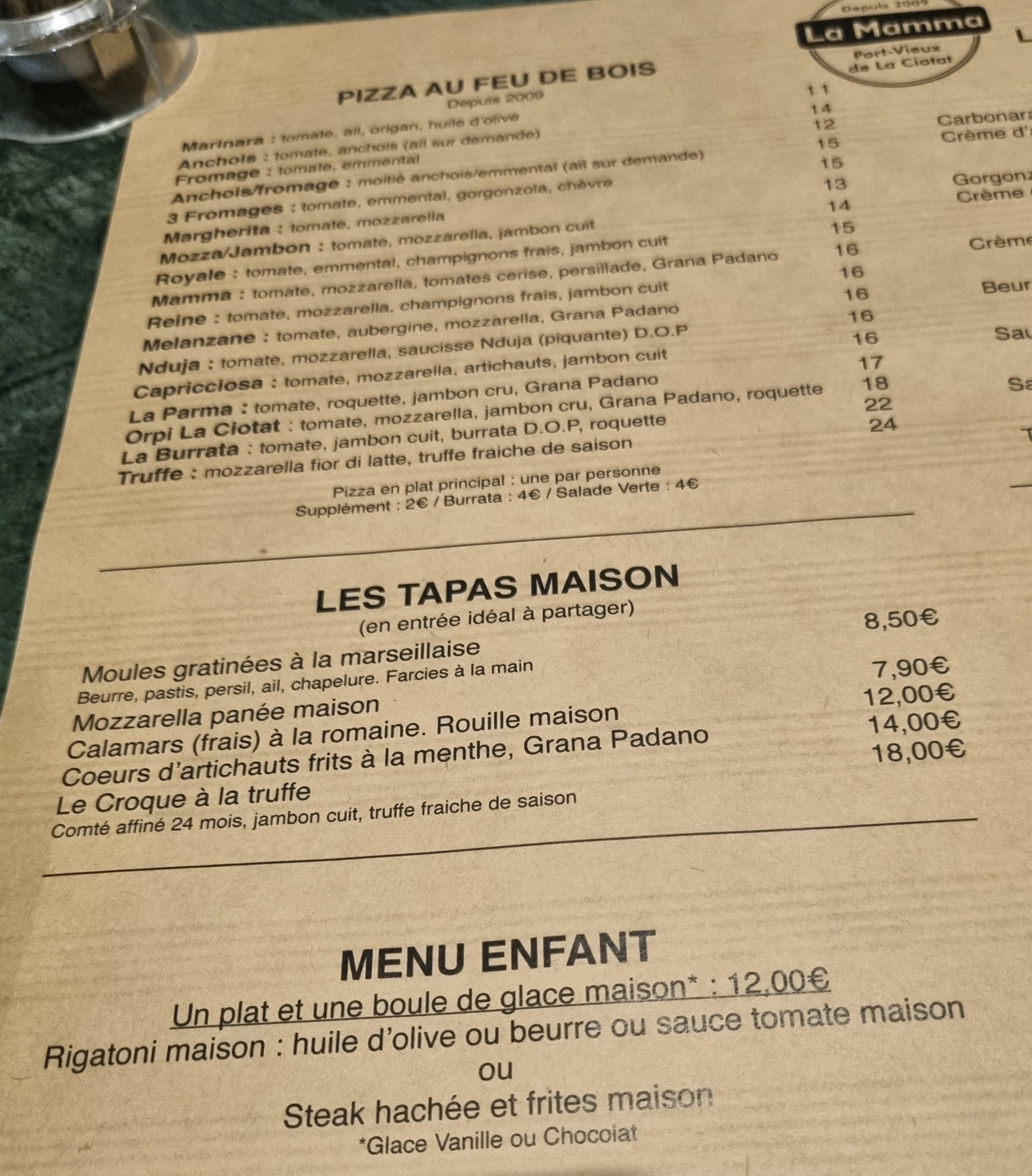 Rien d’Italien et je parle en connaissance de cause, repas pris le dimanche 30 juillet 2023 au soir 22h . 3 personnes, 2 pizzas et une salade et une assiette de croquetas . La salade baignée dans l’huile d’olive rien d’extraordinaire, quand aux pizzas une capricciosa et une reine ni goûteuse et sans saveur , une pâte épaisseur d’une feuille de papier, la sauce tomate sans goût, la cuisson nulle , le type au fourneau n’a pas la bonne recette de la pâte à pain et ne sait pas se servir de son four à pain, pizza trop cuite sur les bords et pas gonflée. Les croquettes trop dures , trop de chapelure la purée sans goût un vrai loupé. Bref … emplacement au port mais piège à touriste les stickers Gault et Millau ont été collé par erreur !!!! Du coup on a abrégé notre repas pas de dessert . Sur la carte du restau pas de véritables plats Italiens osso bucco, pâtes à la sauce, spaghetti ( linguines al vongole) ( au bord de mer !!!), pas de Lambrusco .... bref vous m'avez compris Alors 2 étoiles que je justifie, une pour le serveur à lunettes et cheveux mi longs qui est attentionné et l’autre pour l’emplacement. Mes origines Italiennes ont parlé et je cuisine italien avec saveur et goût à la bouche . Photo de ma pizza entamée à la mama et une photo d’une vraie pizza .