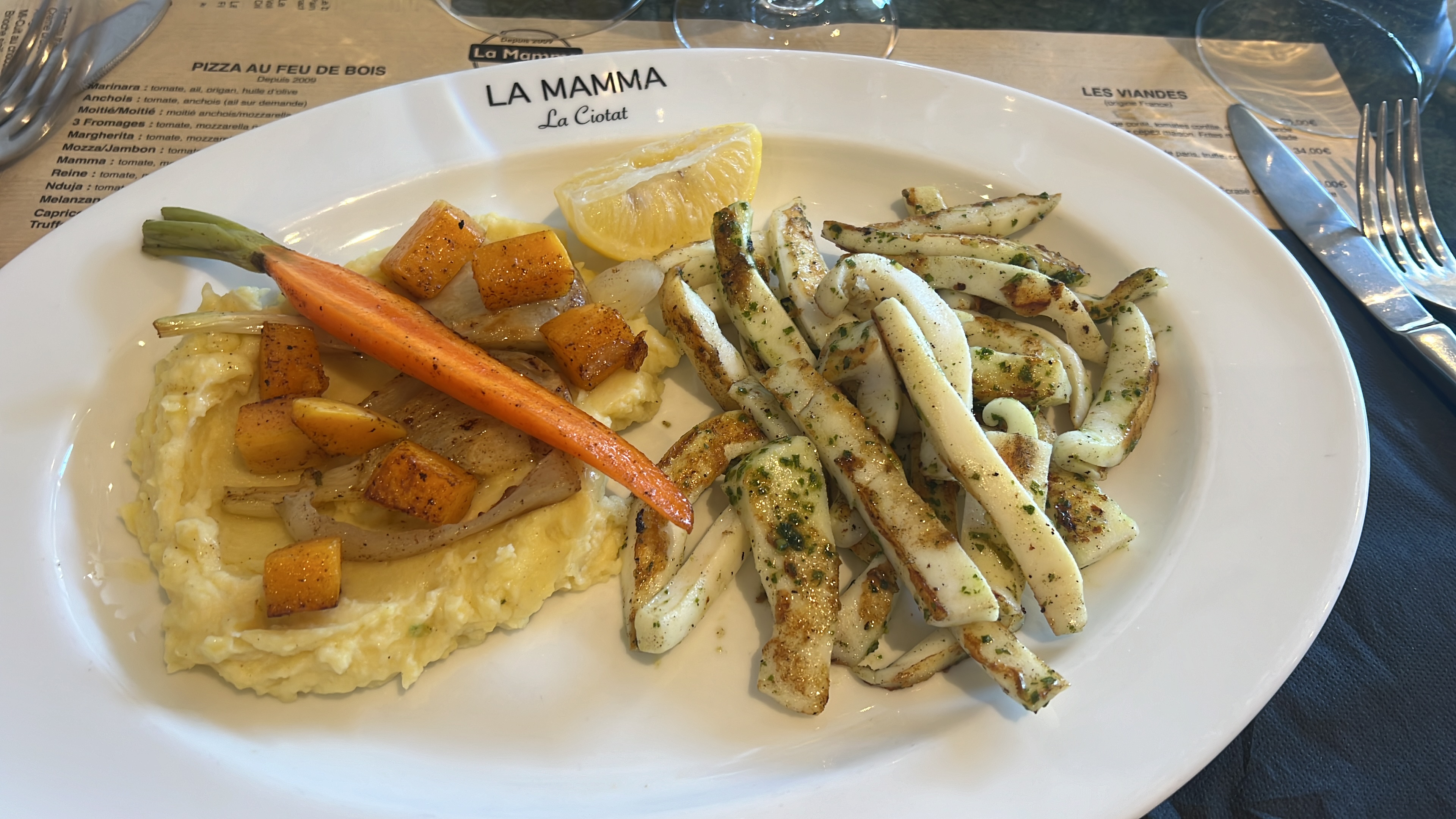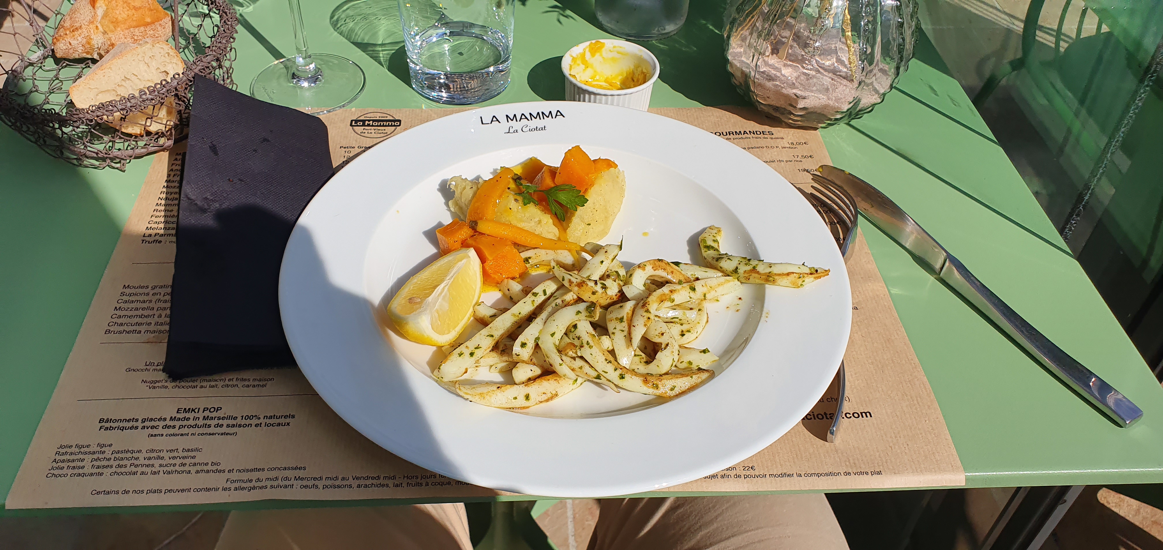 Une adresse incontournable du port de la Ciotat et l'un des meilleurs restaurants. Allez y les yeux fermés. Oui en effet certains plat en suggestions sont onéreux mais ils valent le detours. Pour les photos ci dessous il s'agit des plats / menu entrée + plat = 19e