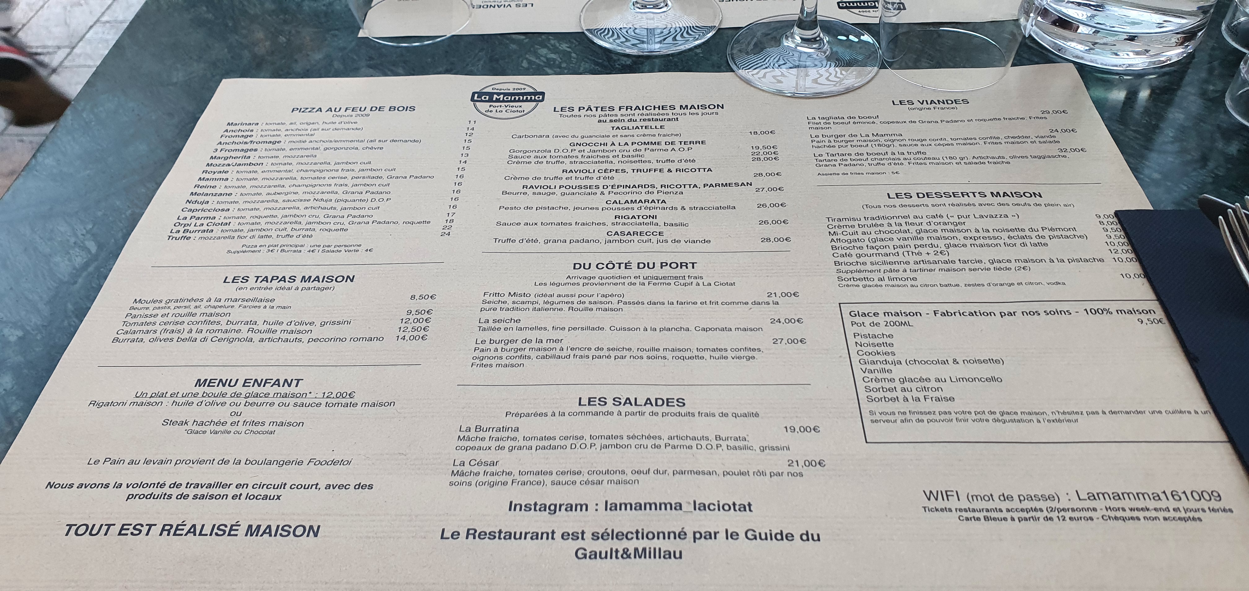 Heureusement aujourd'hui la Mamma était ouverte. Très bonne adresse,service impeccable et très sympathique. La Burratina est à recommander par cette chaleur. Les glaces maison sont merveilleuses,il faudrait juste avoir en plus le choix de 2 parfums qui conbine, pistache noisette ou citron fraise par exemple.