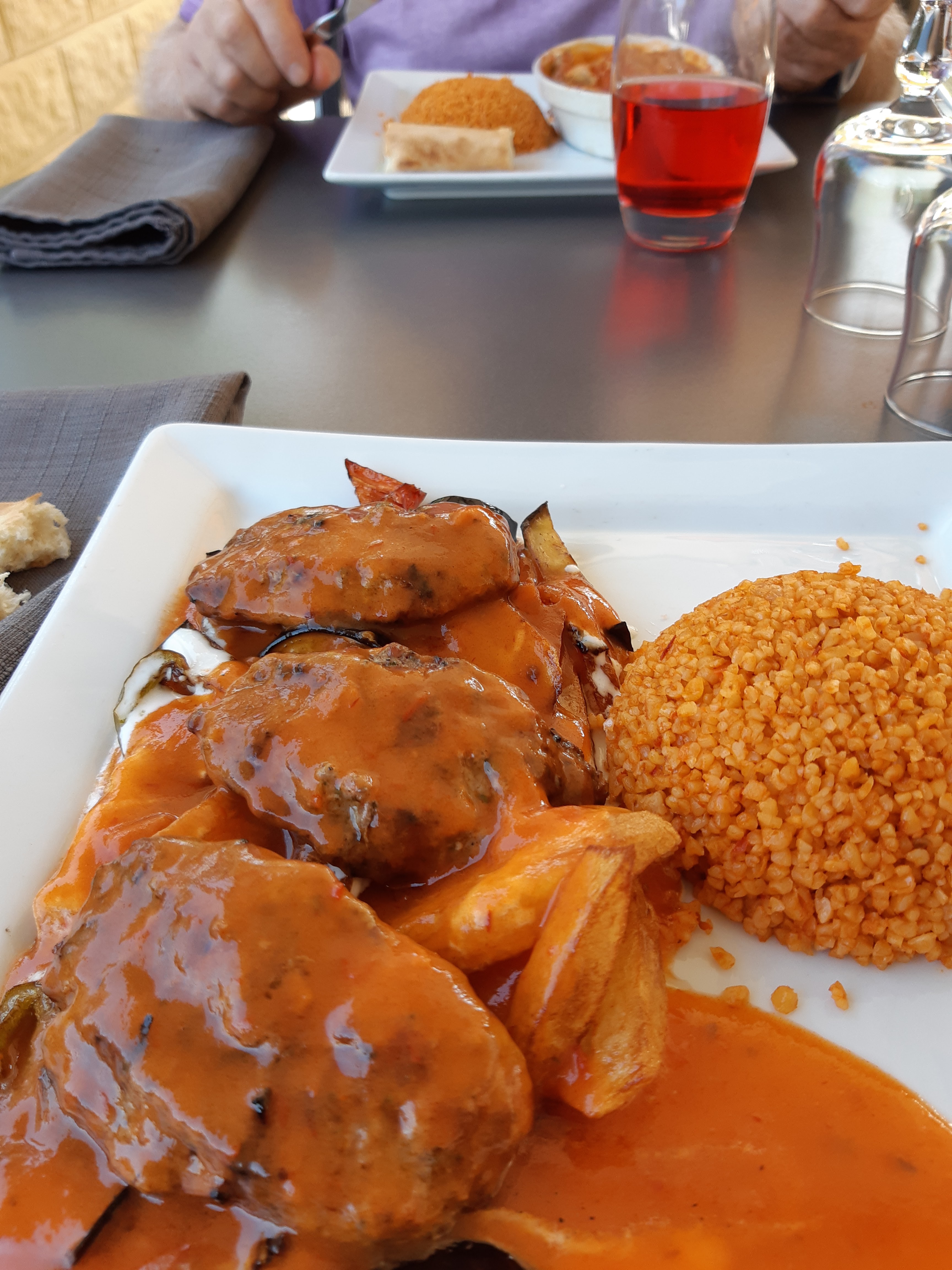 Alors on nous propose une carte fournie, mais on nous annonce que pas de pizza, pas de pide, donc à l‘arrivée un donner sur assiette avec 3 feuilles de salades et un peu de carottes une viande sèche pour une note salée