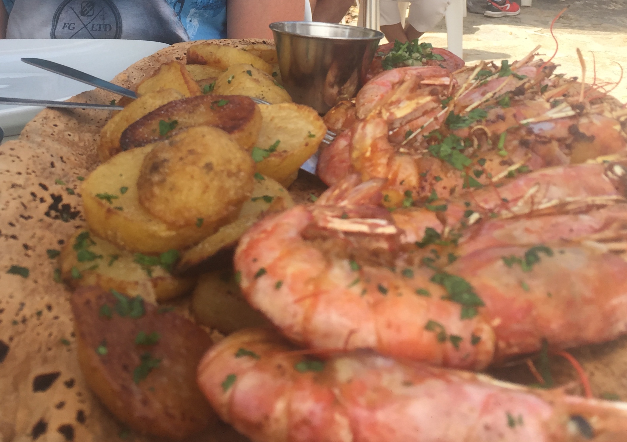 Alors que le mistral faisait voltiger les parasols des plages du littoral, dans cette petite anse, bien à l'abri, installé sur l'eau, façon Guinguette bleue et blanche. C'est simple, c'est bon. En tous les cas mes gambas étaient bien bonnes. Le tout servis par un personnel aguerri ET souriant malgré la chaleur et l'effervescence.