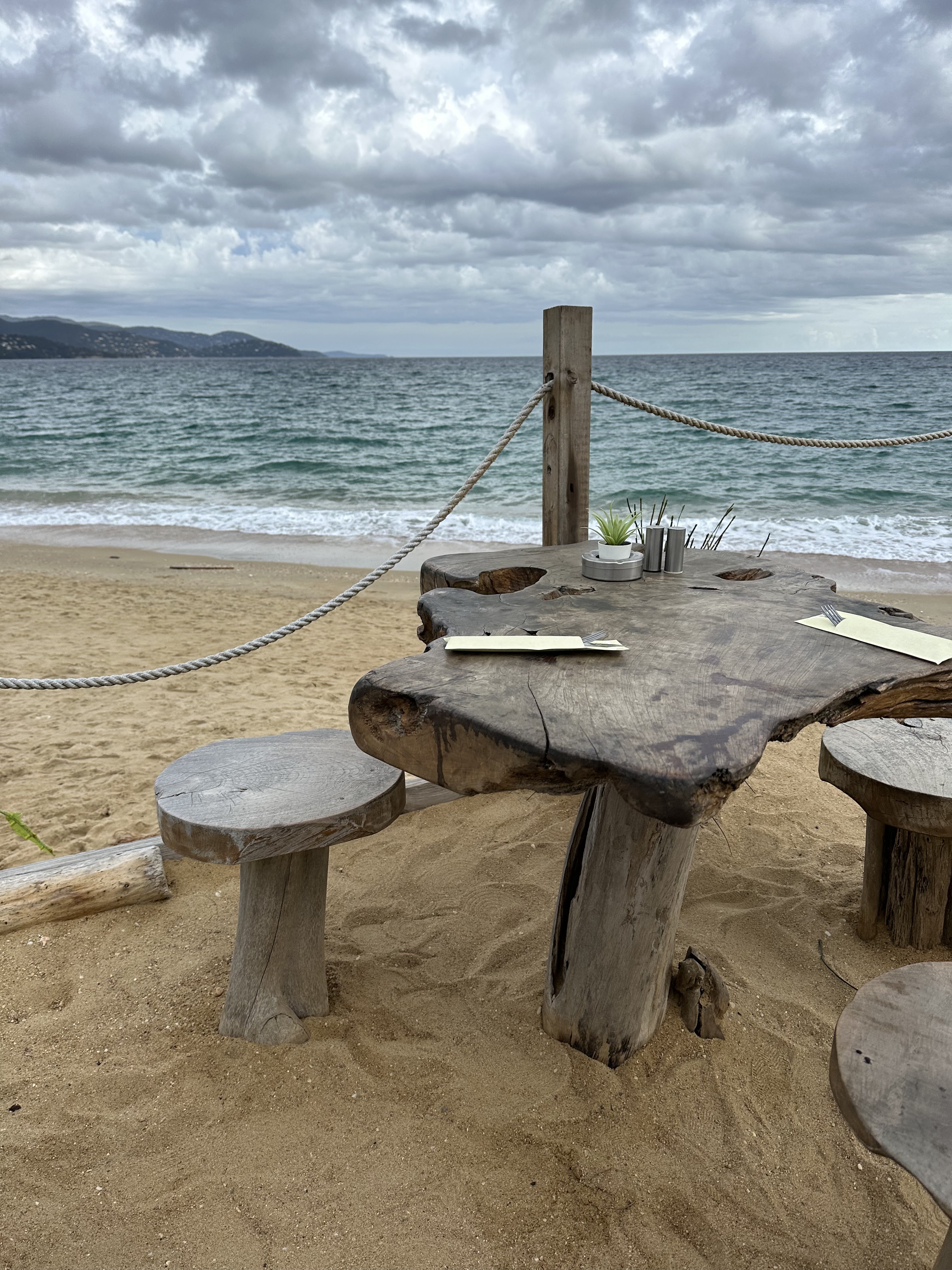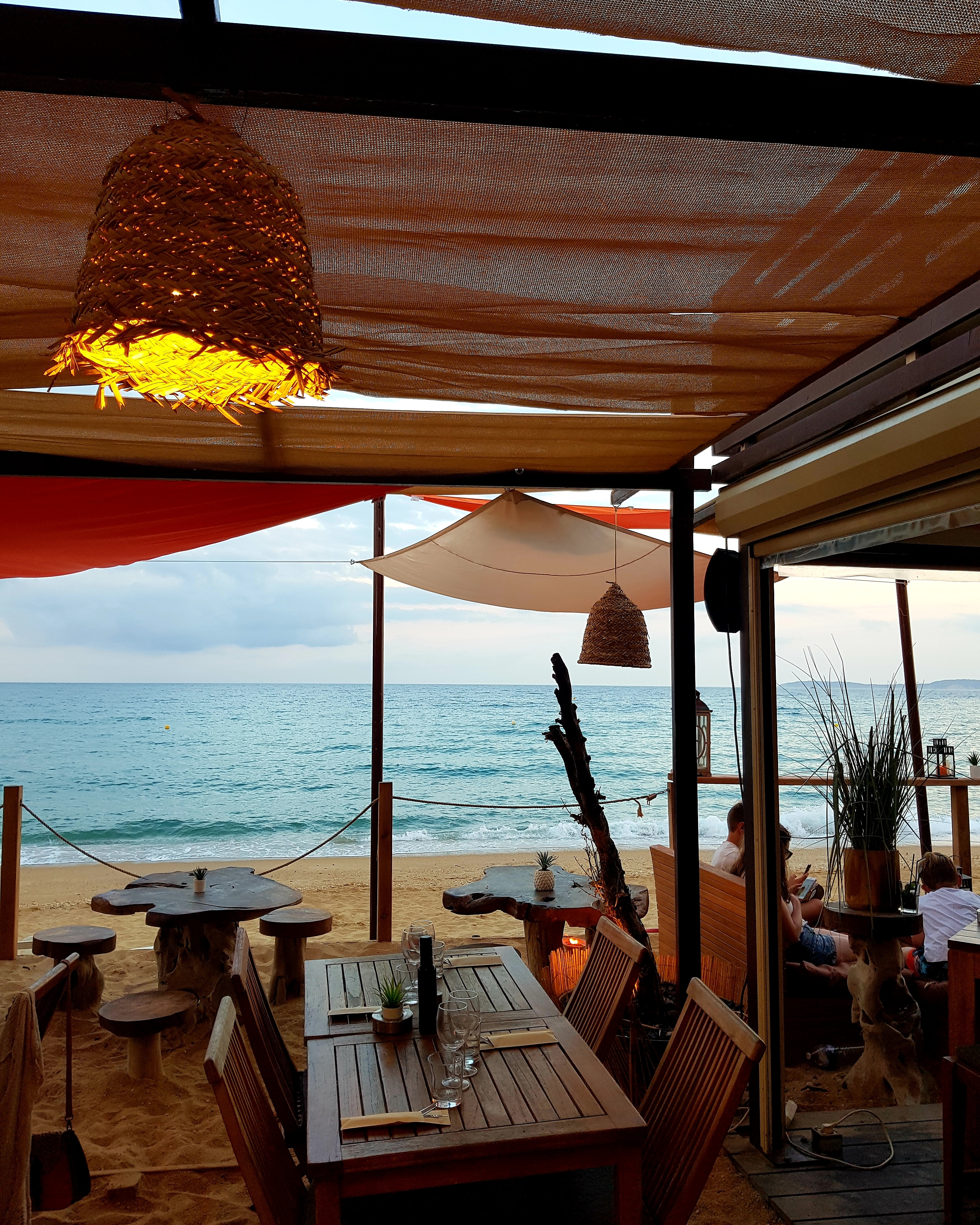 Restaurant de plage bien sympathique au bord d une mer méditerranéenne assez déchaînée... en automne les plages du Lavandou se reduisent considérablement... le resto est presque les pieds dans l eau... encore une u 2 décennies et i faudra mettre des pilotis. :-