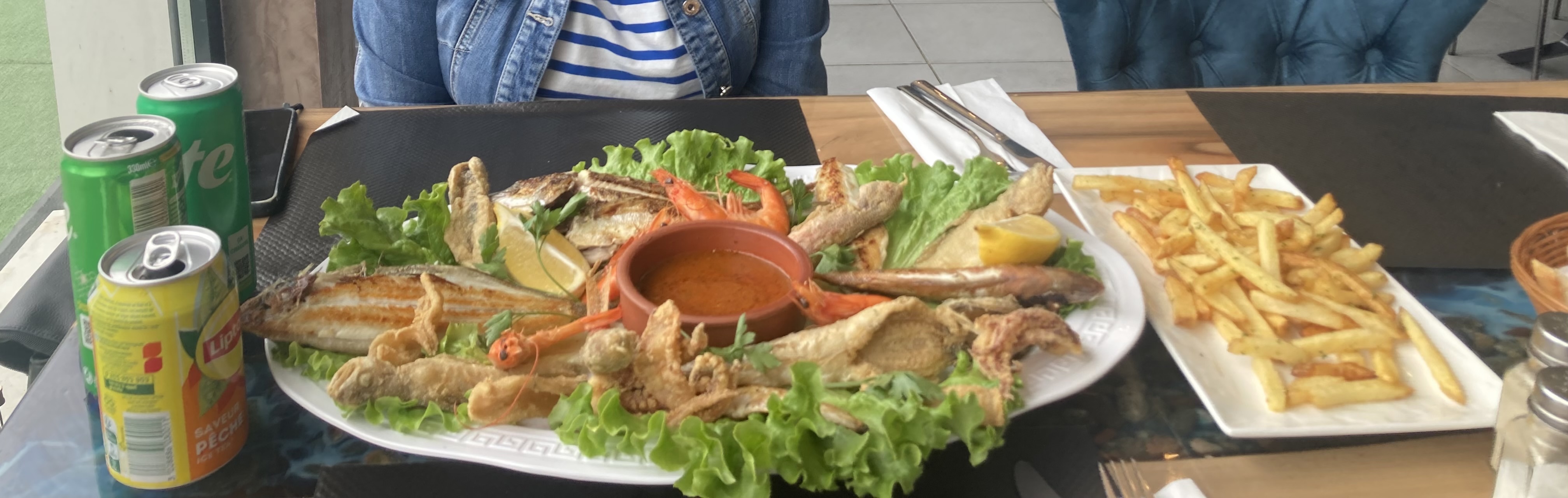 Venus en famille, où savons tous passer un agréable moment Thé à la menthe pour commencer , Beignets de gambas sauvage Salade fruit de mer Ailes de raies /frites maison Tartare avocat saumon/ frites maison Menu enfant : poulet pané, frites En dessert : brownie et tiramisu oréo Vous pouvez venir les yeux fermés, ce restaurznt connaît le poisson et le cuisine divinement bien !! Si vous voulez du bon poisson , c’est une bonne maison !! Très bon accueil, le service est un peu long mais c’est tout à fait normal car ils travaillent le poisson frais ! Tout était très bon , nous nous sommes vraiment régaler