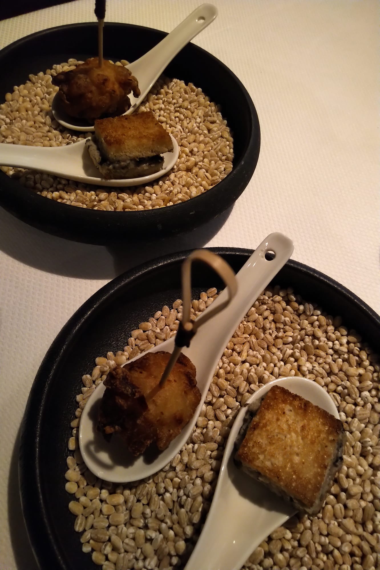 Notre repas a commencé par deux amuses bouches légers et qualitatifs. Habituellement il est plutôt difficile de trouver une bonne entrée au thon cru mais celle que nous avons mangé fut très bonne, la combinaison de thon cru, olives et sorbet de poivron rouge est impressionnante.