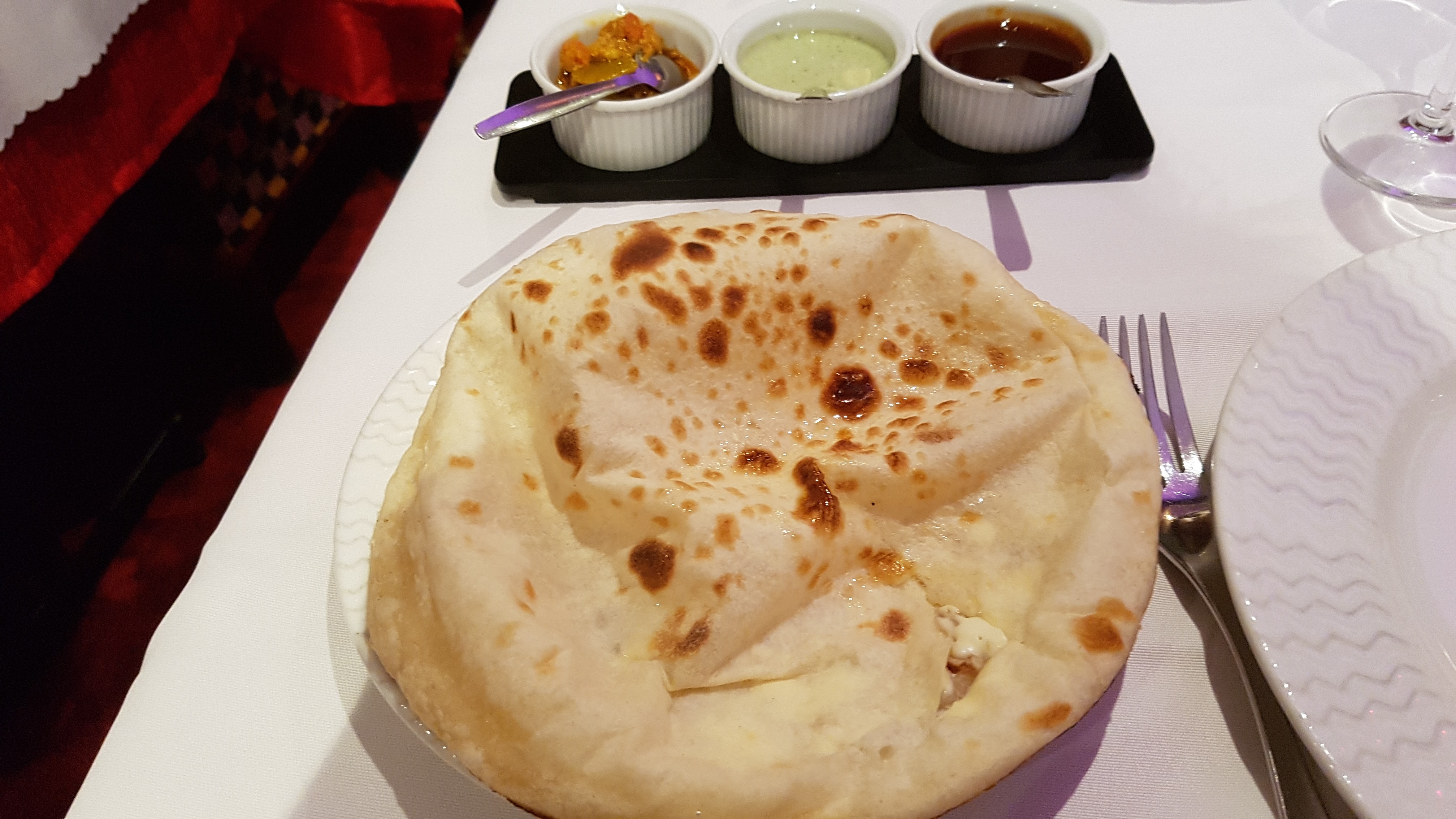Première dans un restau indien. Copieux mais sans avoir mal au ventre en sortant bizarrement. Repas super bon, en bonne quantité. Tarif: apero-entrée-nan(pain)-plat-dessert environ 45€.