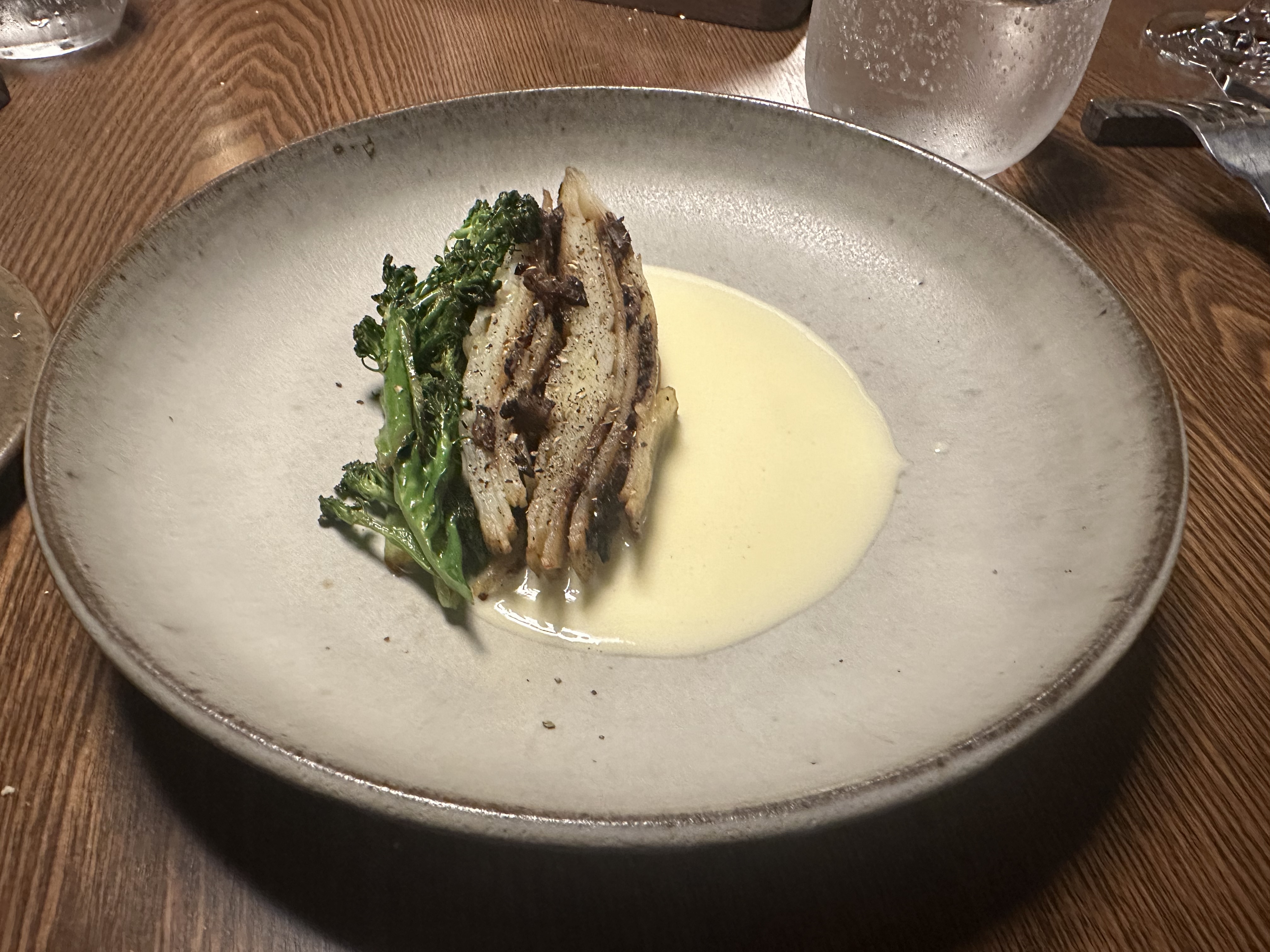 Service parfait - Plats très axés sur le végétal, avec des belles sauces / jus ou infusions. Tout est léger et délicieux. Excellent conseil sur le vin, particulièrement charmé par un vin orange nature très surprenant. Mention spéciale pour un plat divin a l’orge cuisinée façon risotto (proposé à la place du cochon pour mon menu sans viande). Attention, menu unique - pas de carte.