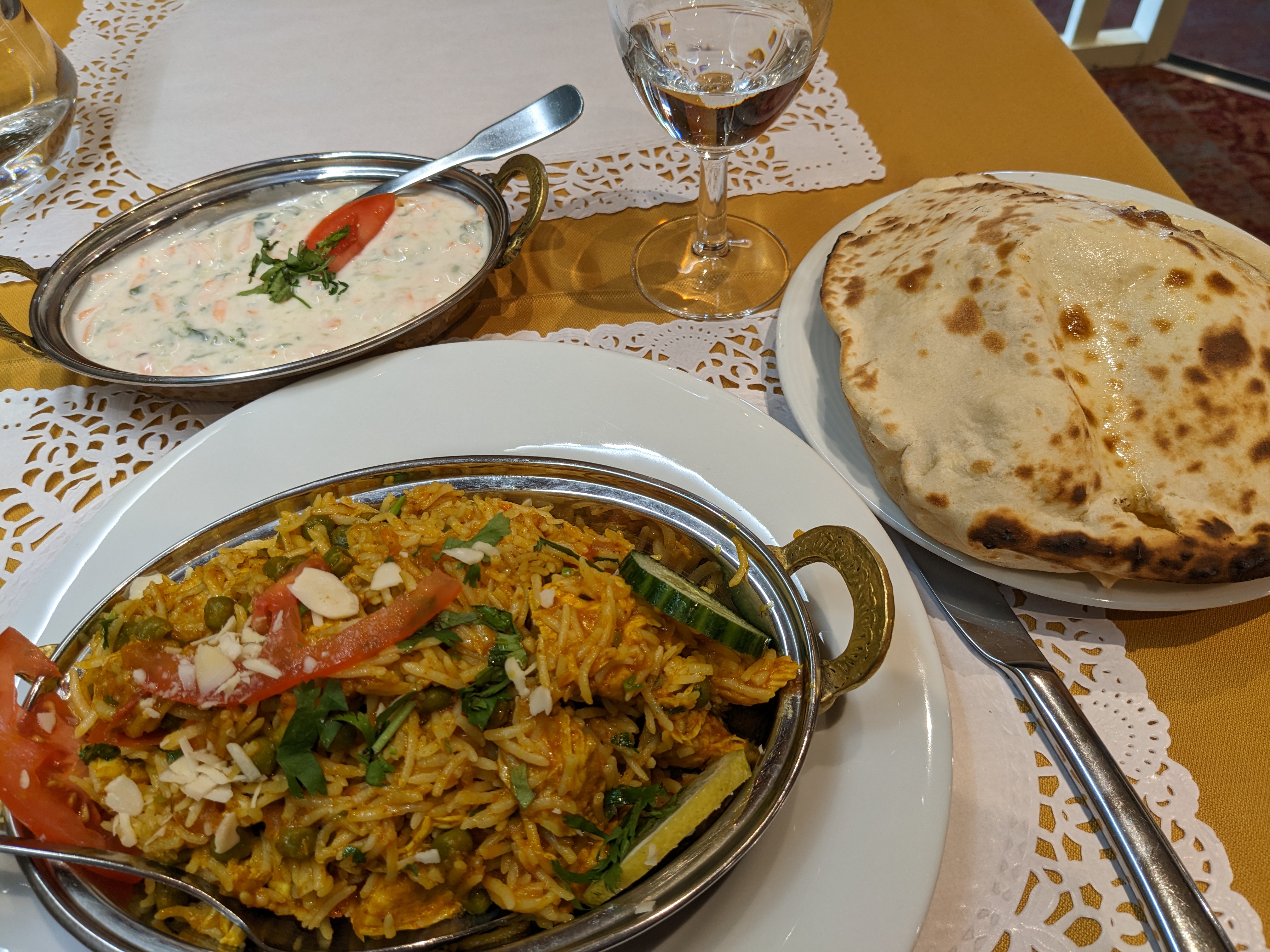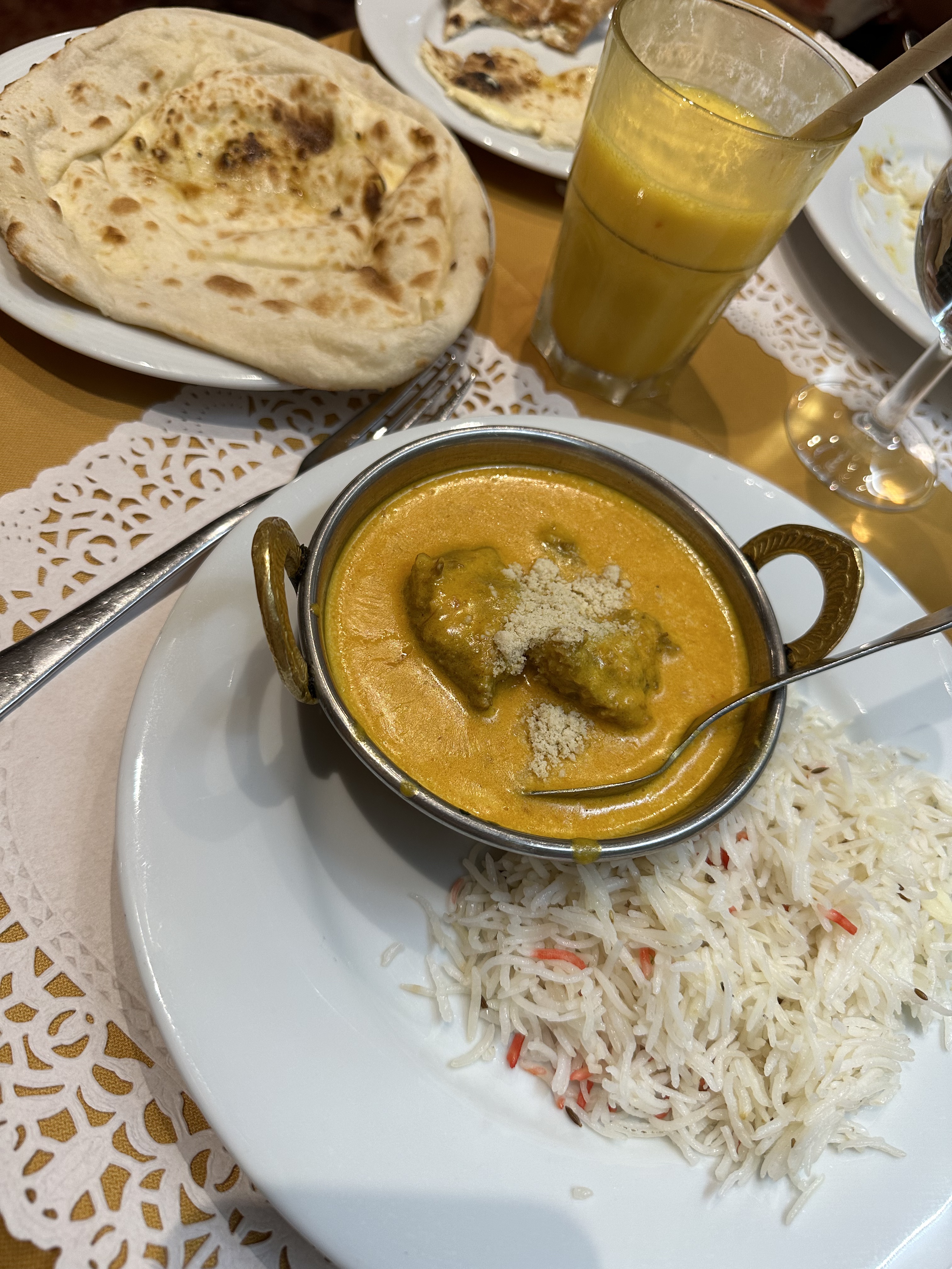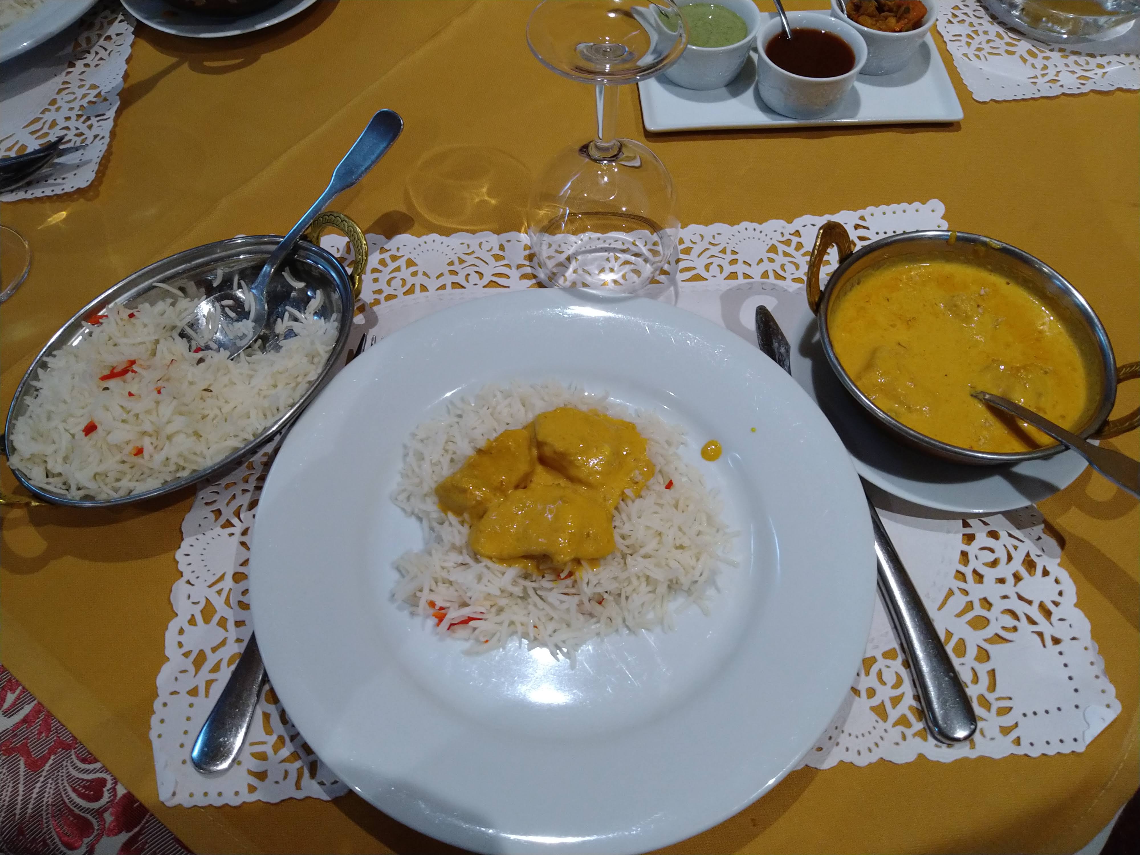 Grand (par la taille) restaurant indien. Déco sympa, on voyage un peu en Inde. En entrée, des sortes de samoussas, plutôt bon. En plat, du poulet curry assez classique. Riz correct tout comme le curry. En dessert, un petit riz au lait, parfumé aux épices. Attention, on aime ou on aime pas : moi j'ai aimé mais mon collègue n'en a mangé qu'une cuillère. C'est un restaurant sans prétention au bon rapport qualité prix, comptez environ 20€ pour la formule du midi avec une boisson et un naan en supplément (très bon)