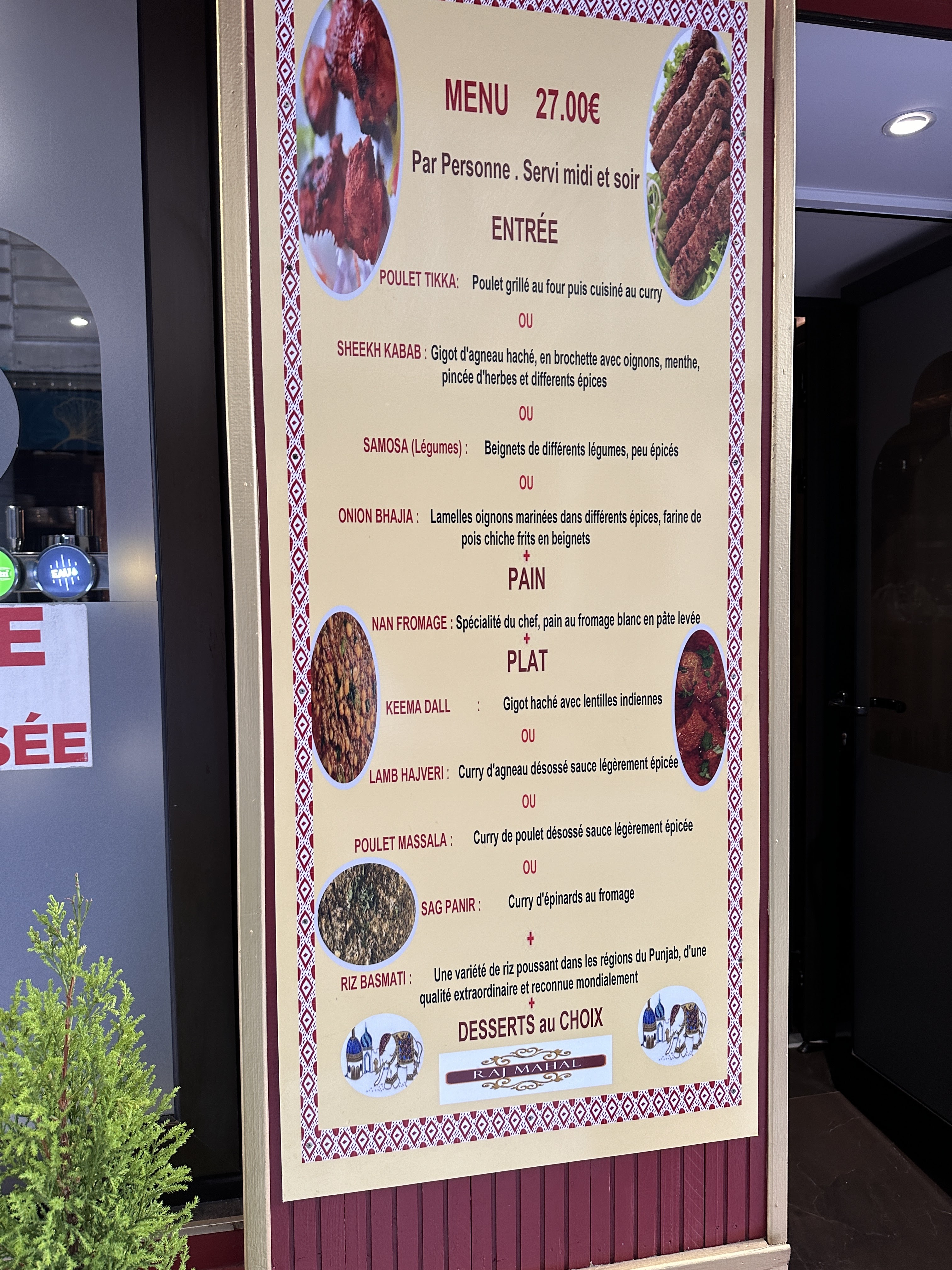 Le hasard fait bien les choses. Nous avons déjeuné ce midi dans ce beau restaurant. Nous avons pris le menu à 14 euros du midi entrée , plat, nam , dessert. Excellent et un lassi délicieux à la rose Service impeccable et attentionné. Serveur très agréable et serviable. Prix très intéressant et raisonnable. Je recommande vraiment ce restaurant. Nous y retournerons avec grand plaisir encore merci