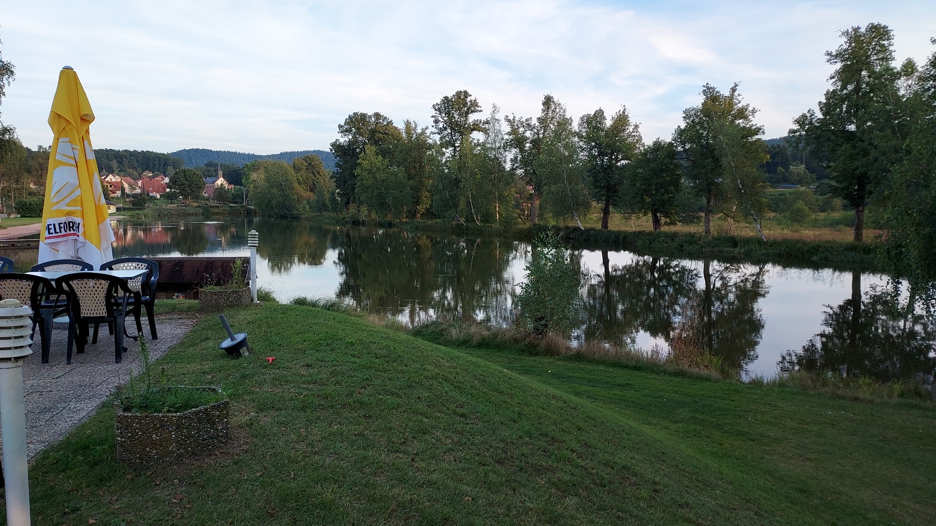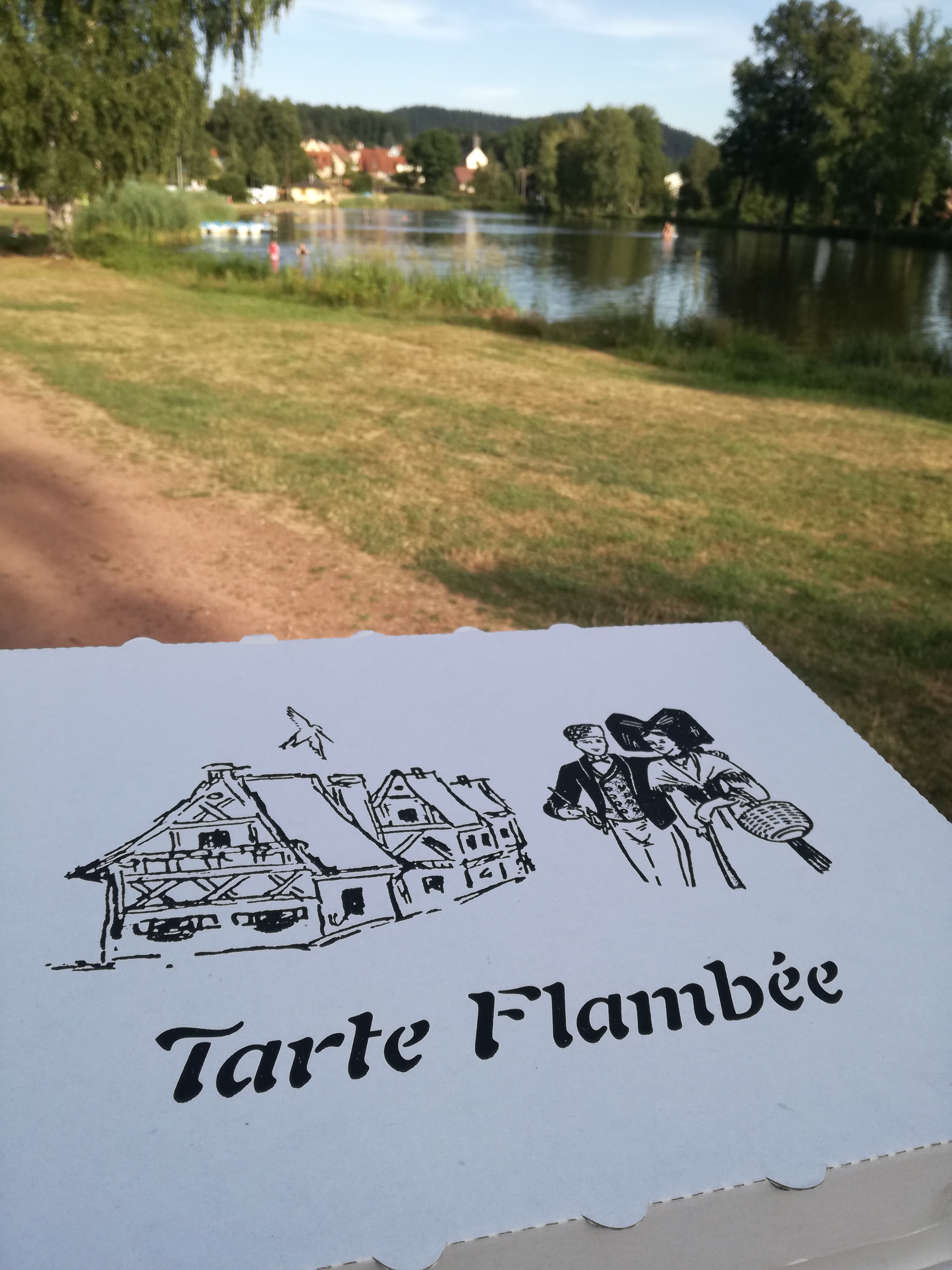 La terrasse du restaurant avec vue sur l'Etang est vraiment magnifique. J'y étais 3 fois. 1x juste apéritif, 2x avec de la nourriture. Le service est très sympathique et arrangeant. Même si tu veux juste boire quelque chose. Tarte flambée et pizza commandées sur 2 jours. Après une courte attente, la nourriture fut servie. Délicieux. Tout comme une tarte flambée devrait avoir le goût. Nous serions ravis de revenir