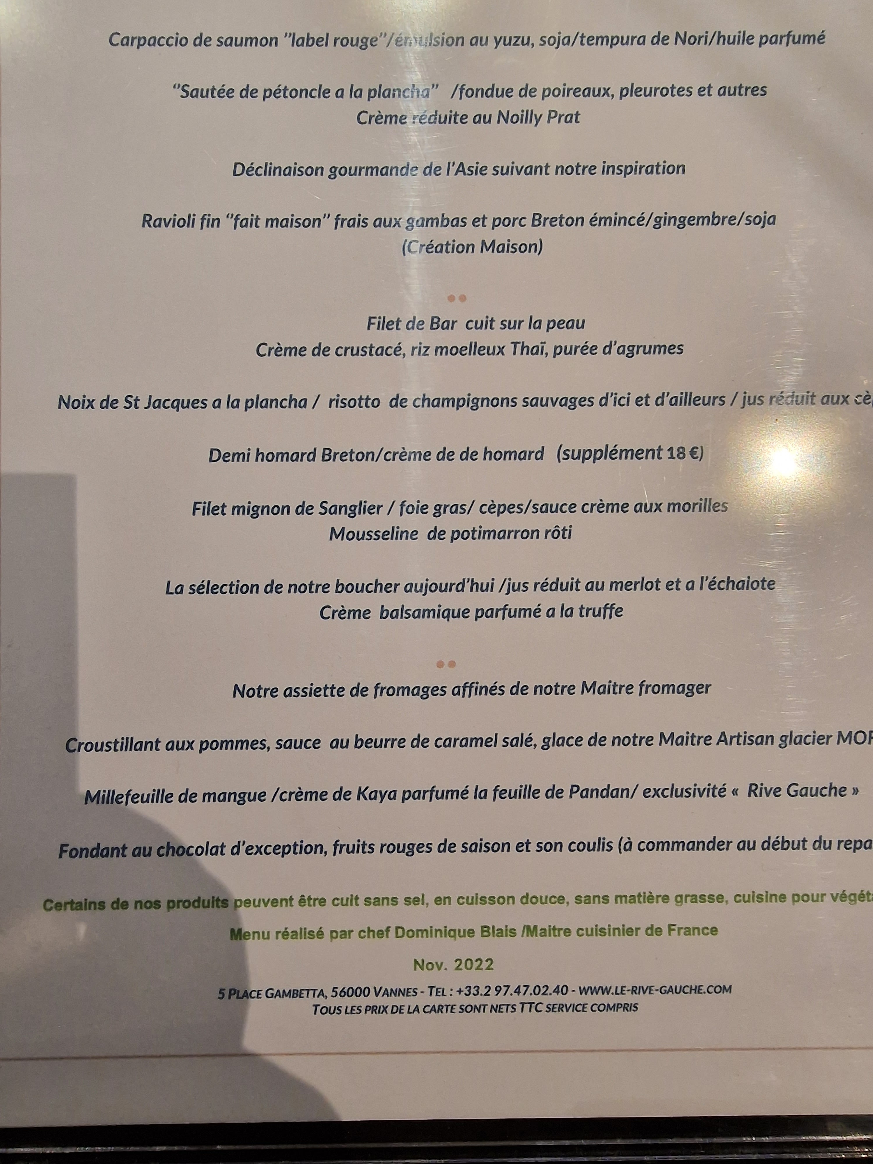 Très bien mangé, j'ai passé un très bon moment. Une cuisine raffinée et dépaysante, un service délicat et discret sur le port de Vannes. Menu E/P/D à 28 euros et vins aux alentours de 35/40 euros la bouteille. Une adresse plaisir.