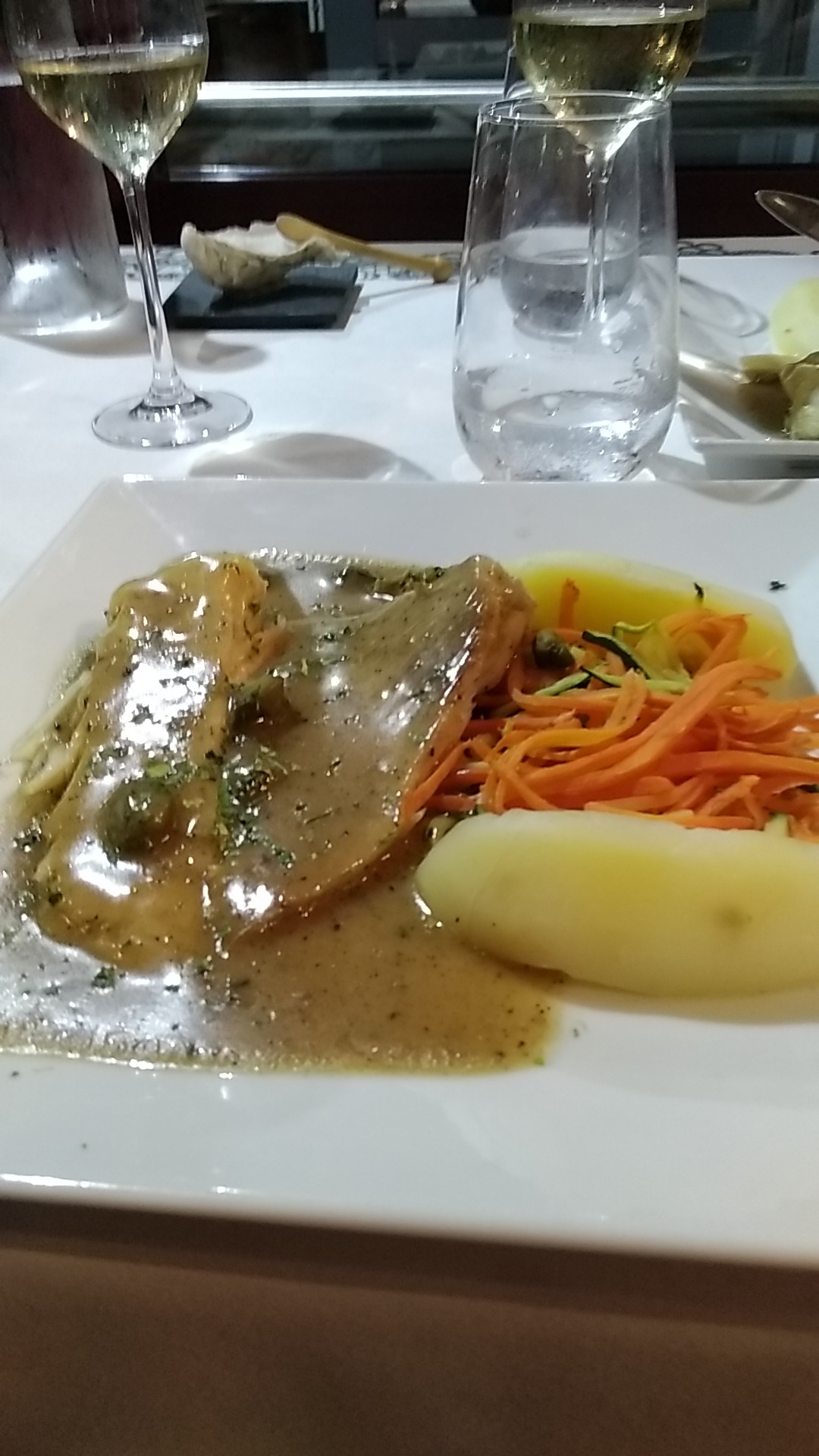 Pour résumer, la déception a grandi au fur et à mesure de l'arrivée des plats. Très bonne petite mise en bouche à la sardine mais soupe de poisson émulsionnée avec trop de crème ; pain de poisson un peu sec, trop salé mais excellente sauce cocktail. Ça s'est vraiment gâté avec la raie, la sauce était ratée, trop citronnée, pas salée, assez fade, on se consolait comme on pouvait avec les pommes de terre en accompagnement. Quant au bavarois aux fruits de saison, on les cherche toujours, le filet de coulis était bon mais sans plus et il a fallu réclamer les petites cuillères. Aucun reproche, à cela près, sur le service et la vue sur le port.