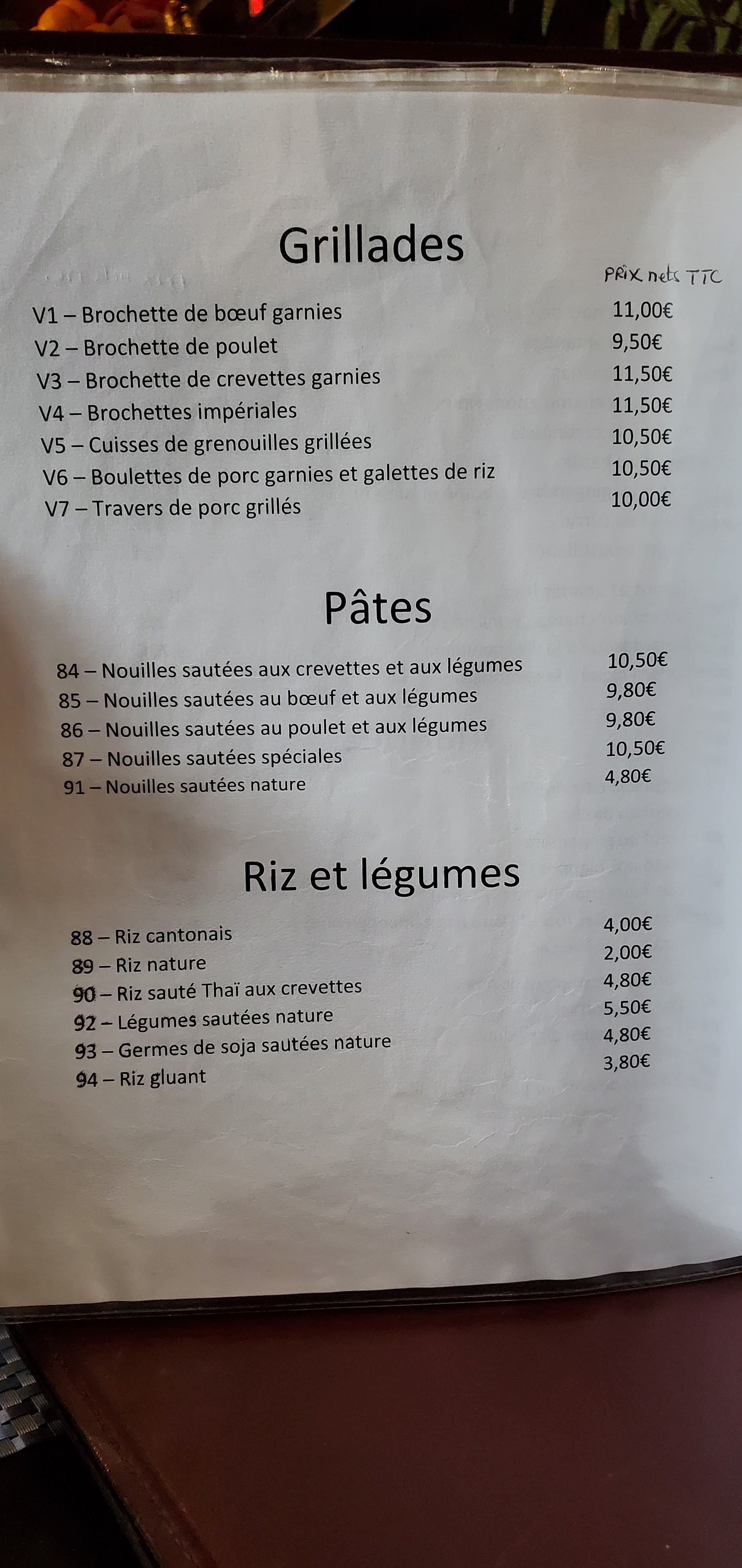 Excellent restaurant qui ne paye pas de mine Très bon rapport qualité prix Tous les plats sont faits maison et sont délicieux. Je recommande les nems, les rouleaux de printemps, les raviolis crevettes vapeur, le boeuf et riz loc lac, le boeuf au saté (avec riz rouge ou cantonais) En dessert la banane flambée est succulente Chapeau