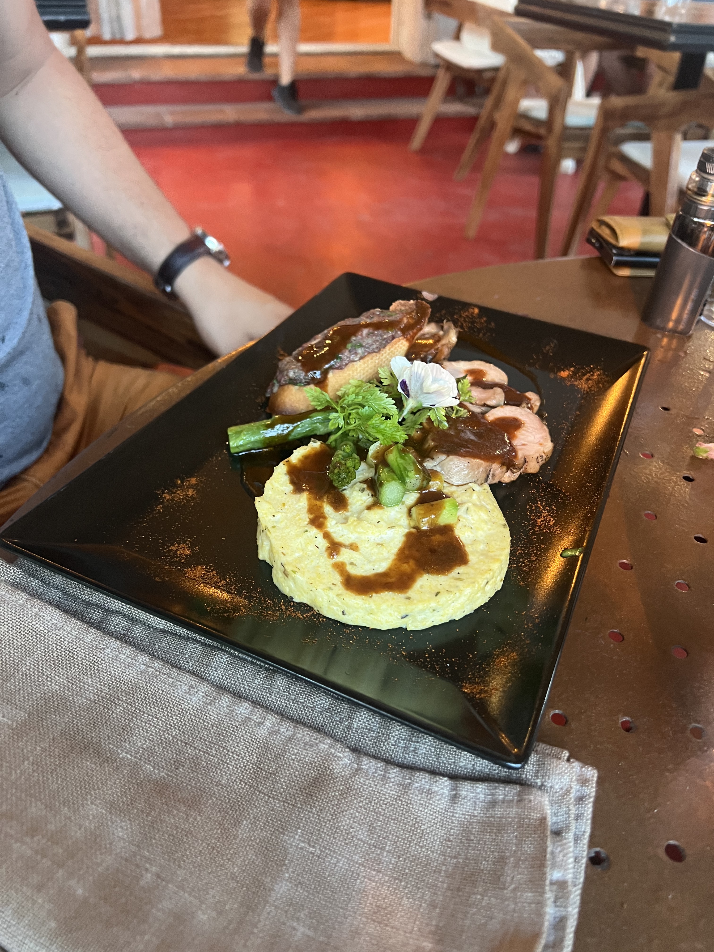 Nous avons passé un bon repas, au rythme lent, style vacances ! Nourriture vraiment délicieuse, accueil chaleureux, tartare de dorado, crevettes parfaitement frites sur asperges blanches rasées et plat de poisson animé, fromage et dessert avec un cocktail de Maison, vin et café. Un repas COMPLET ! Fantastique !!