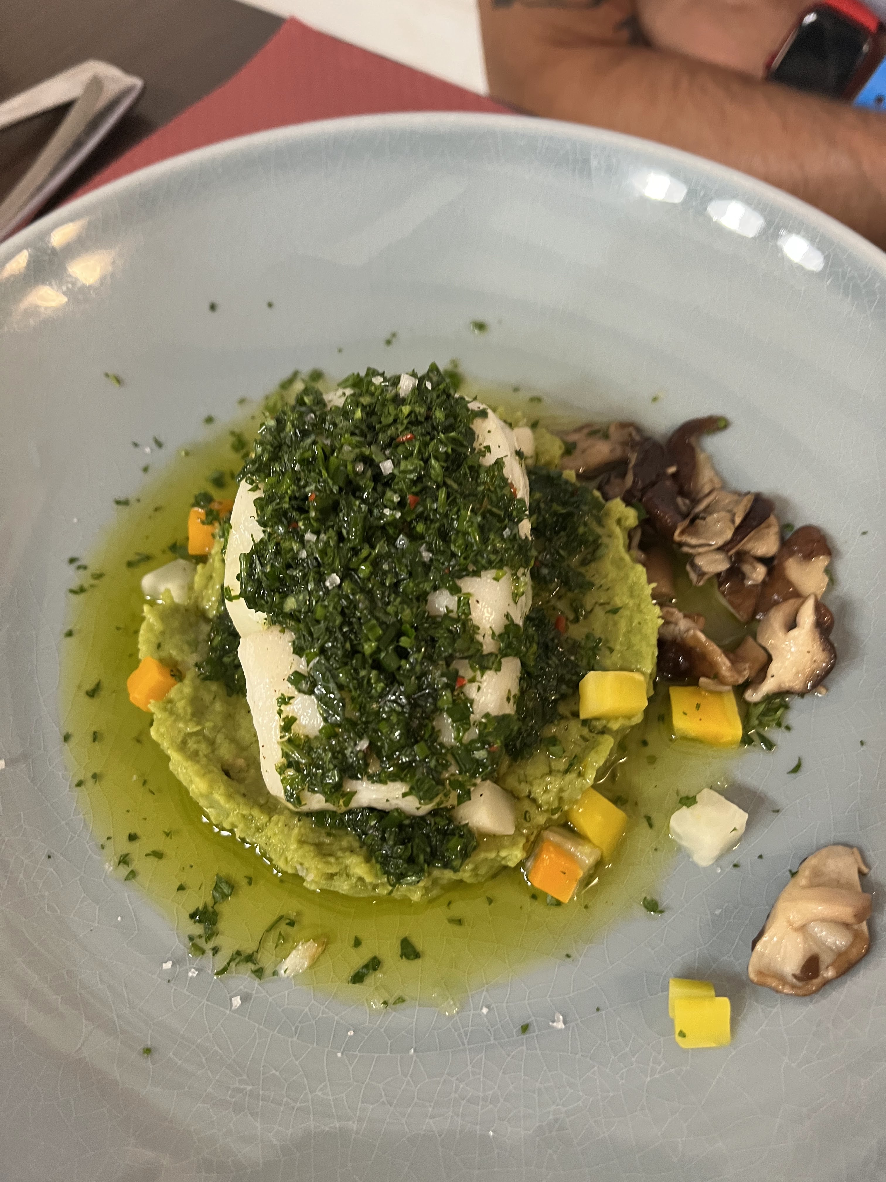 Assiette salade saveurs qui ne donne nullement l’appétit, servie avec toasts de pain rassis et fruits de mer douteux, idem pour la salade cesar, digne d’une préparation et présentation enfantine. Dos de lieu sur crumble de chorizo froid et pas frais, brochettes de bœuf cramée. Nous sommes repartis dégoûtés