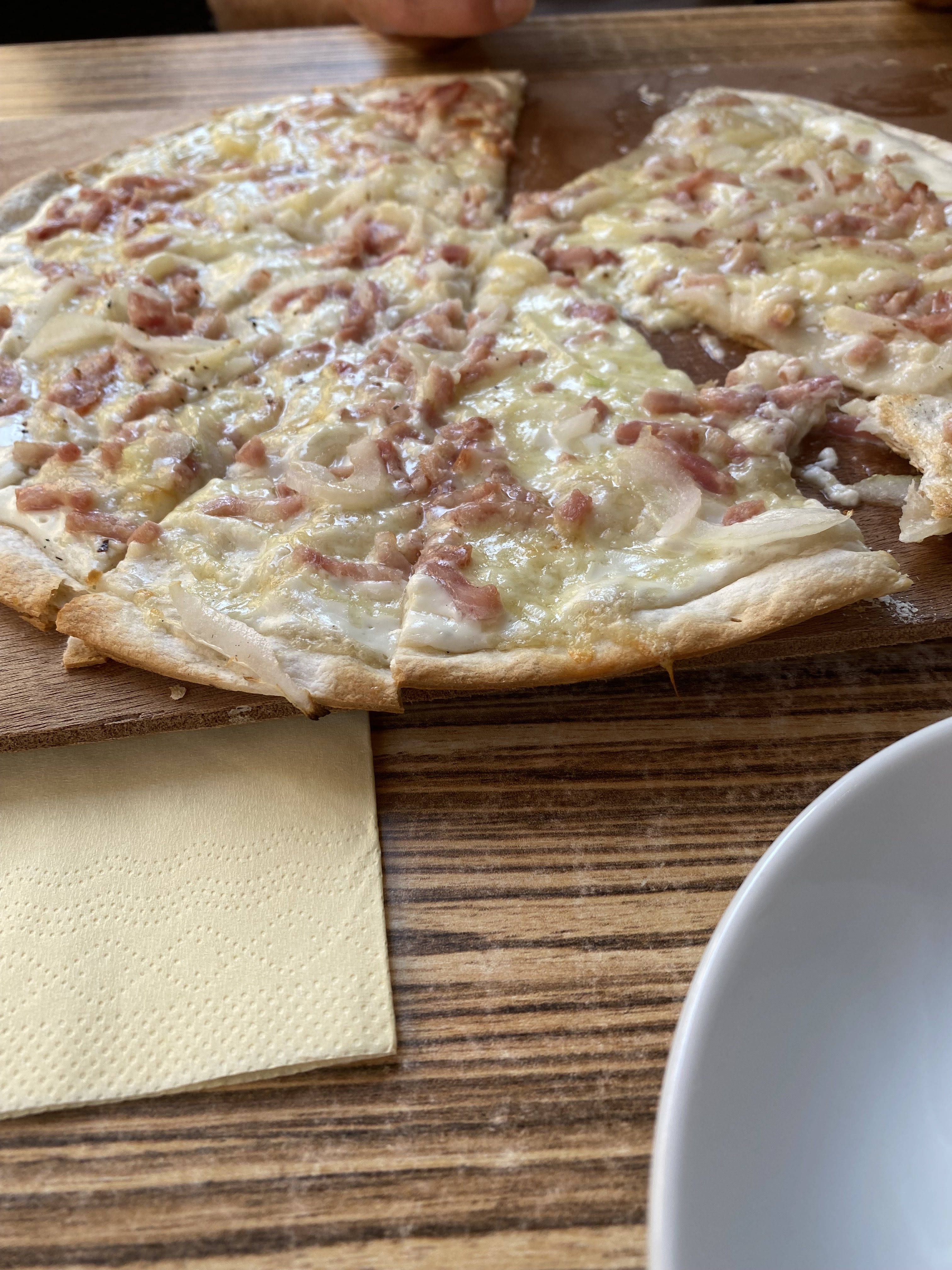 Nous avons mangé deux flammenkuch ; saumon et Munster. Elles étaient très bonnes.