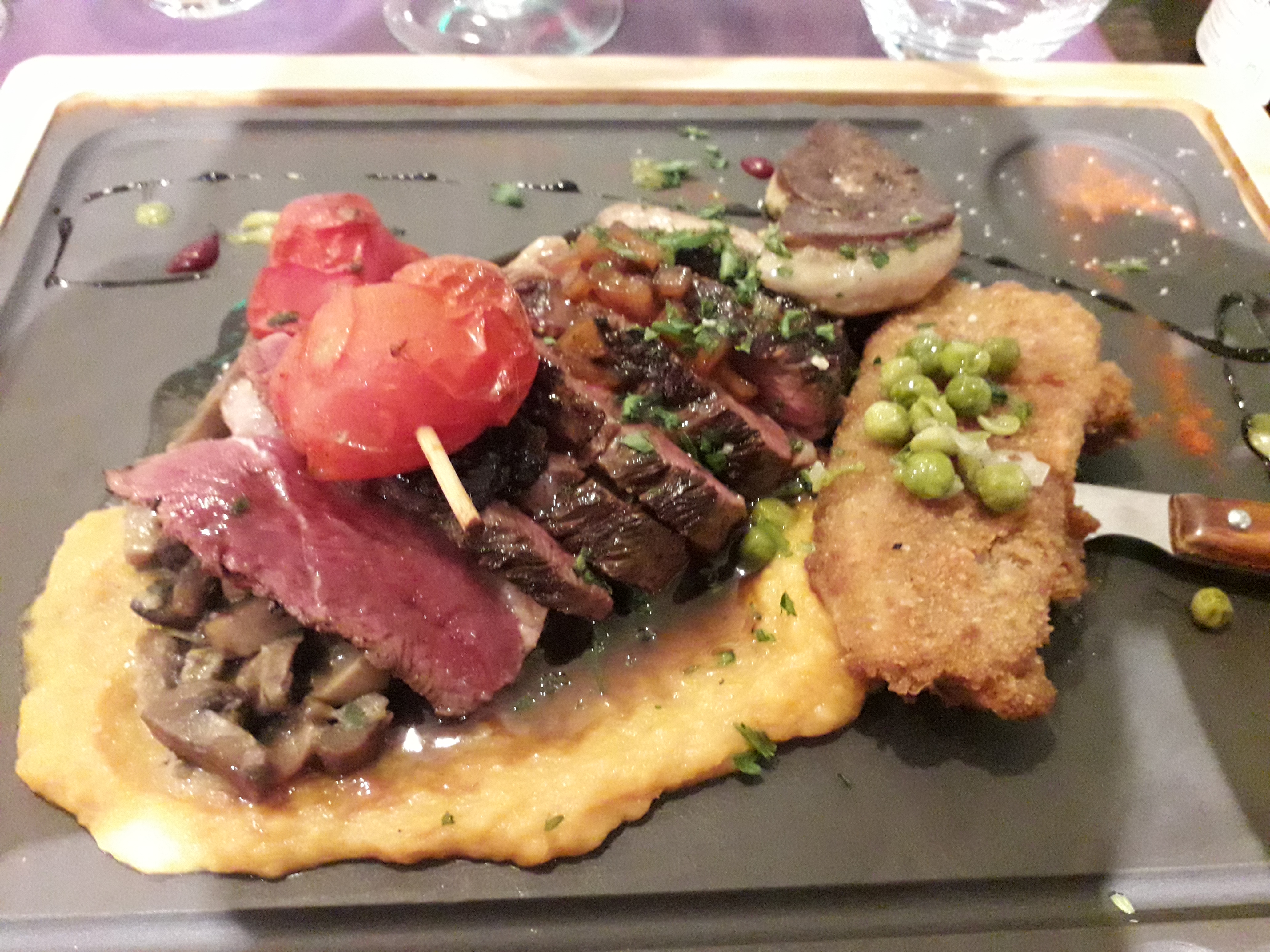 Personnel sympathique bémol une sorte de pané indéfinissable qui fait tâche dans une assiette magret de canard et foie gras