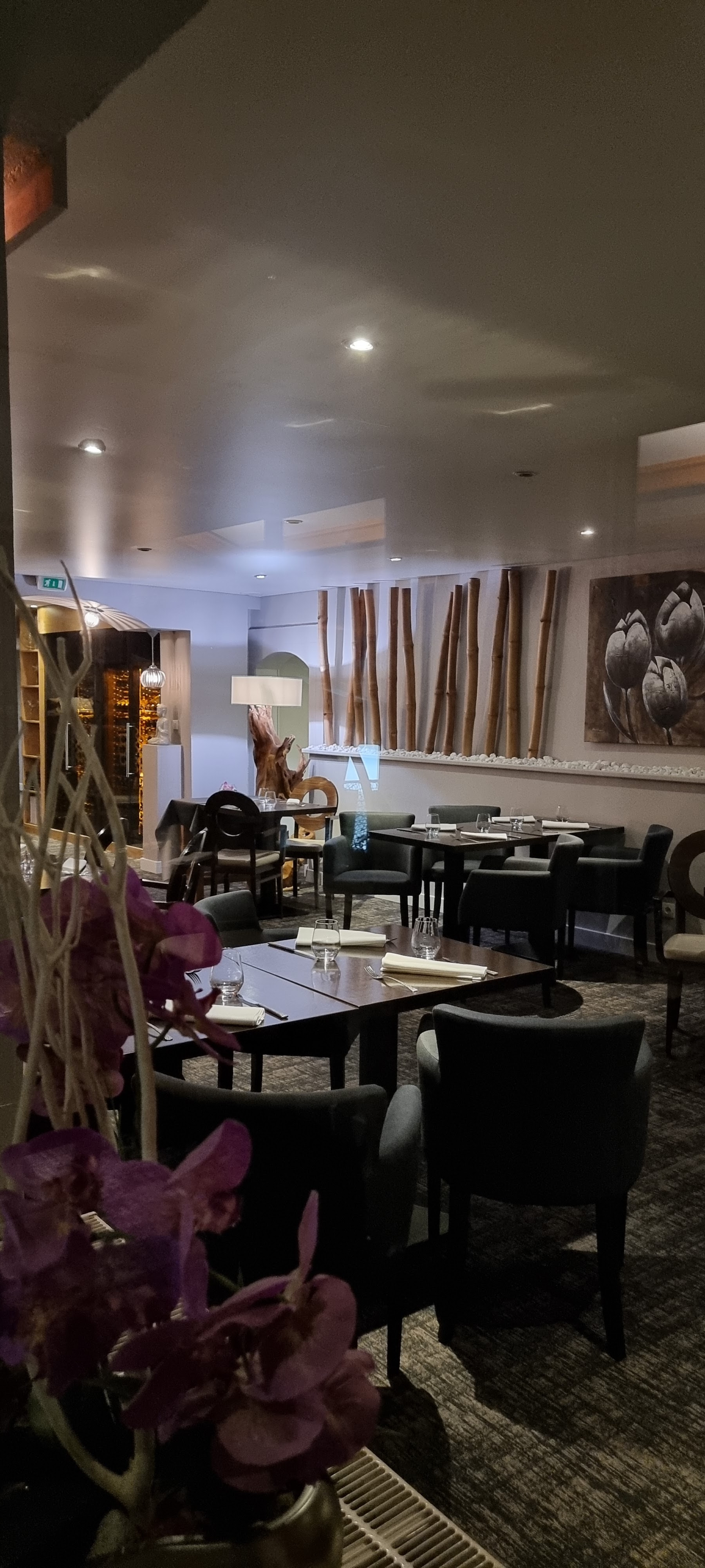 Accueil agréable. Ambiance feutrée, espaces des tables corrects. Musique contemporaine, décoration asiatique (Bouddhas, bambous) Nous sommes au fond , table pour 2. Assises sur des chaises sur lesquelles je ne me sens pas a l'aise et manque de hauteur par rapport à la table. Table ou des couverts sont posés a même dessus, un peu froid a mon goût. Nous prenons un menu a 52 et 65 euros . 1 cocktail 12 euros (Sangria blanche, un peu cher pour quelques cl de vin blanc) et 1 coupe de champagne 10 euros, correct, accompagnés de petit morceaux de pain grillés a tremper dans de l'houmous ou betterave (j'ai bien aimé) petite mise en bouche (potage carottes épicée sous une émulsion... Bof) menu a 52 avec suprême de volaille (cher pour manger du poulet, (tendre mais présentation basique) et larmes du tigre (tranches de de boeuf marinées, je n'ai pas trop aimé la sauce, cependant le riz était une tuerie) carafe d'eau (j'ai adorée les contenants en ardoise, grès) assiette de fromages du Jura (3 parts) et un feuilleté. Déçue pour un restaurant gastronomique. On ne m'a pas fait goûté le vin, servie au verre directement 🙈, aucune présentation de chaque plat a l'oral, j'ai dû demander quels fromages j'avais mangé 😕 Bon, (heureusement ) cependant présentation pas assez élaborée pour le titre de gastronomique et le prix qui reste très cher pour une entrée plat dessert/ou fromages. Ce soir là, 3 serveurs pour 5 tables. Bonne continuation 🥂 J'ai beaucoup détaillé car ce soir là pas de téléphone donc pas de photo 😔