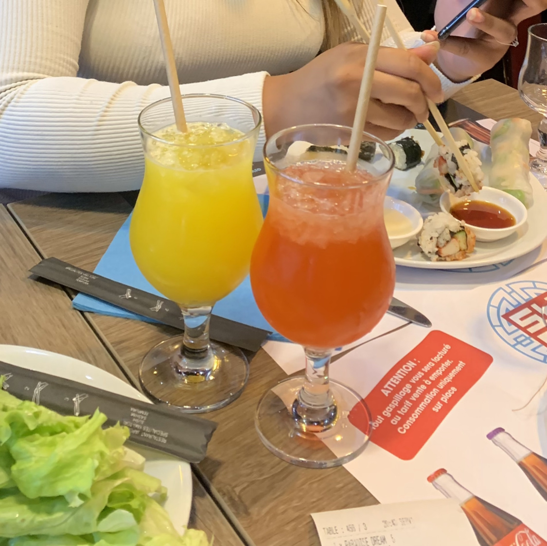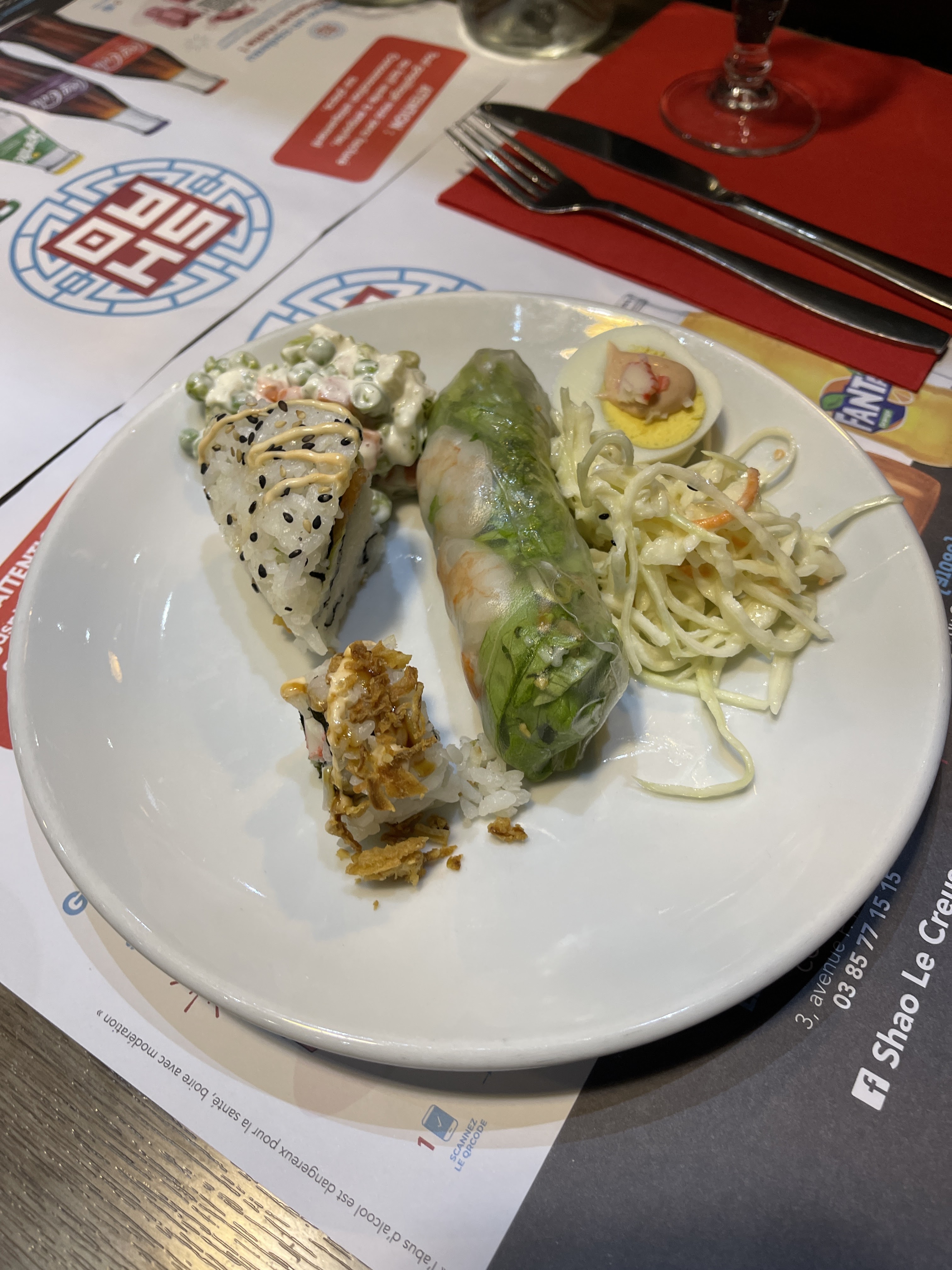 Sur place, je ne sais pas mais à emporter c’est une catastrophe. Voici en photo ce que j’ai eu pour 21€. Pas de baguettes, pas de wazabi et surtout on a la moitié du menu…j’appelle le restau : « vous avez commandés avec Uber donc on peut rien faire » Sans commentaire