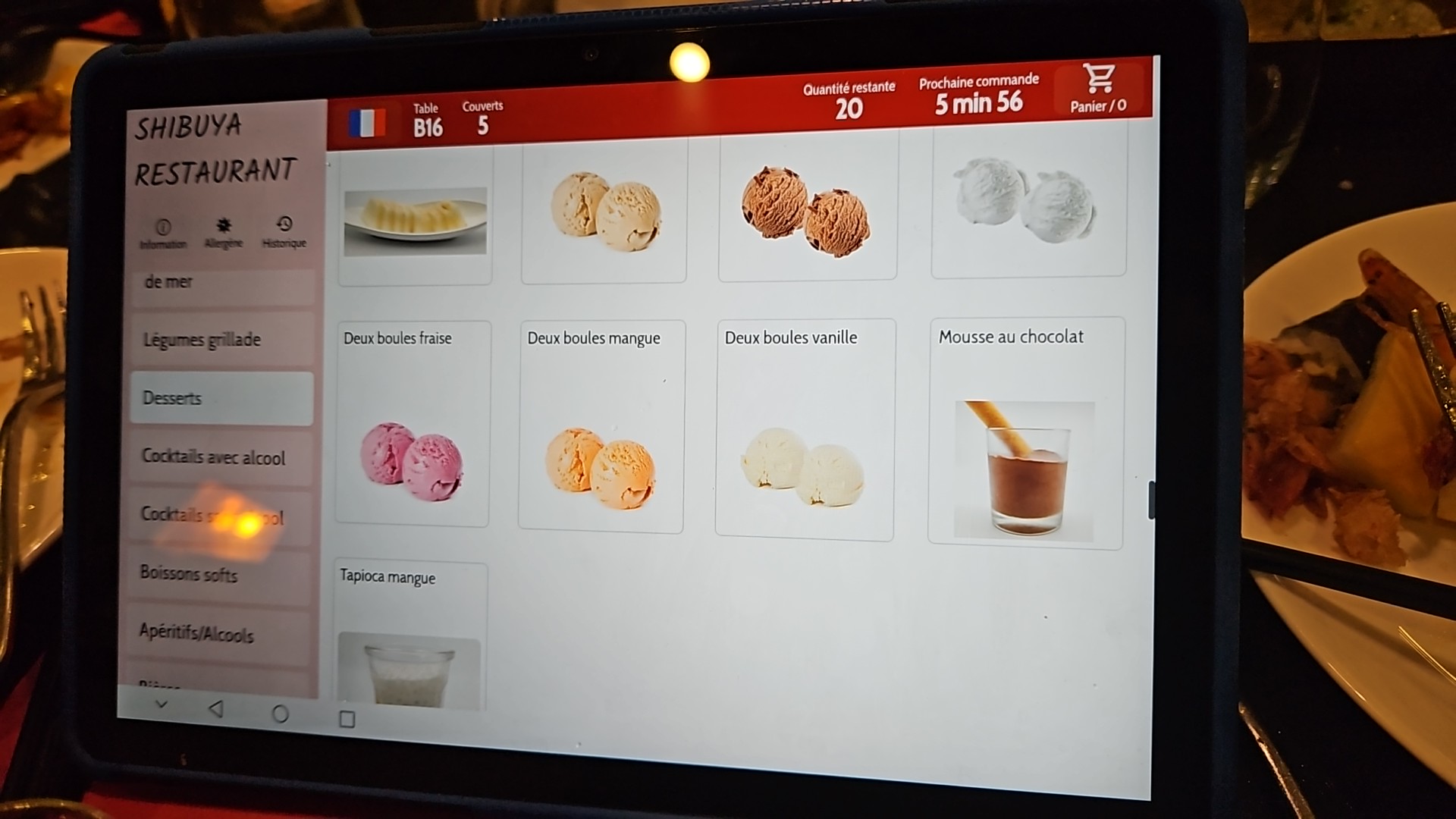 On a tester une fois je n y retournerai pas. Restaurant qui vient d ouvrir sur un concept innovent sur tablette vous passez commande ✌️ Conseil Faite cuire la viande et commander l accompagnements pendant la cuisson pour éviter de manger froid Le serveur apporte les plats et vous faites la cuisson à votre table 👌 Moins de déchets avec ce système En revanche c est pas gratuit 😨 Un samedi soir pour deux sans boisson sans café 59 euros 😡 Vous commandez à volonté mais attention des plats sont payant et toutes les boissons sont payante La carte n est pas super bien fournie quand on a des restrictions alimentaires ou simplement que l on aime pas tous les plats Beaucoup de plats à cuire préparé donc moins de choix Encore faut-il que ce soit de qualité Le bœuf saté bof un goût bizarre Peu de choix d entrée Peu de choix d accompagnements La plaque chauffante est rerègler à chaque fois qu un serveur passé donc deux plombe pour cuire Changer la pince de table qui est trop petite Liste de dessert extra réduite quand on retire les boules de glace Les fruits y en a pas et l 🍍 n est pas mur Je leur donne 1 an avant de faire faillite 👎on est pas à Paris Geste commercial pour le prix Compléter la carte en choix nature et donner un jus en boisson ou un café ☕️ thé