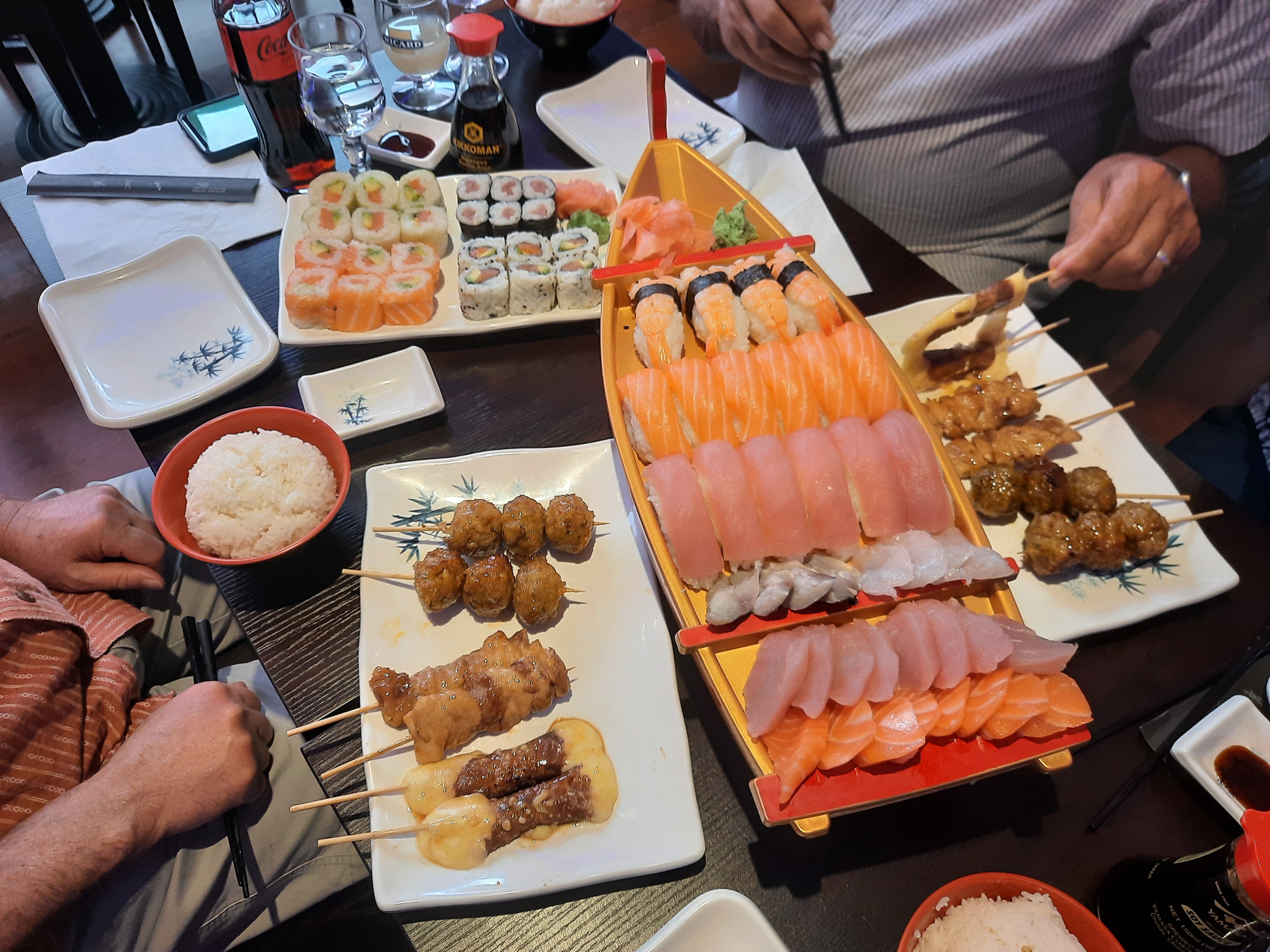 Nous avions le restaurant que pour deux!!!! Beaucoup de personnes prennent leurs sushis 🍣 à emporter ... Nous avons opté hier pour le bateau duo avec les brochettes ,le tout arrosé d'une bonne Asahi dry....délicieux !!!! Un service express et chaleureux que l'on recommande 👌