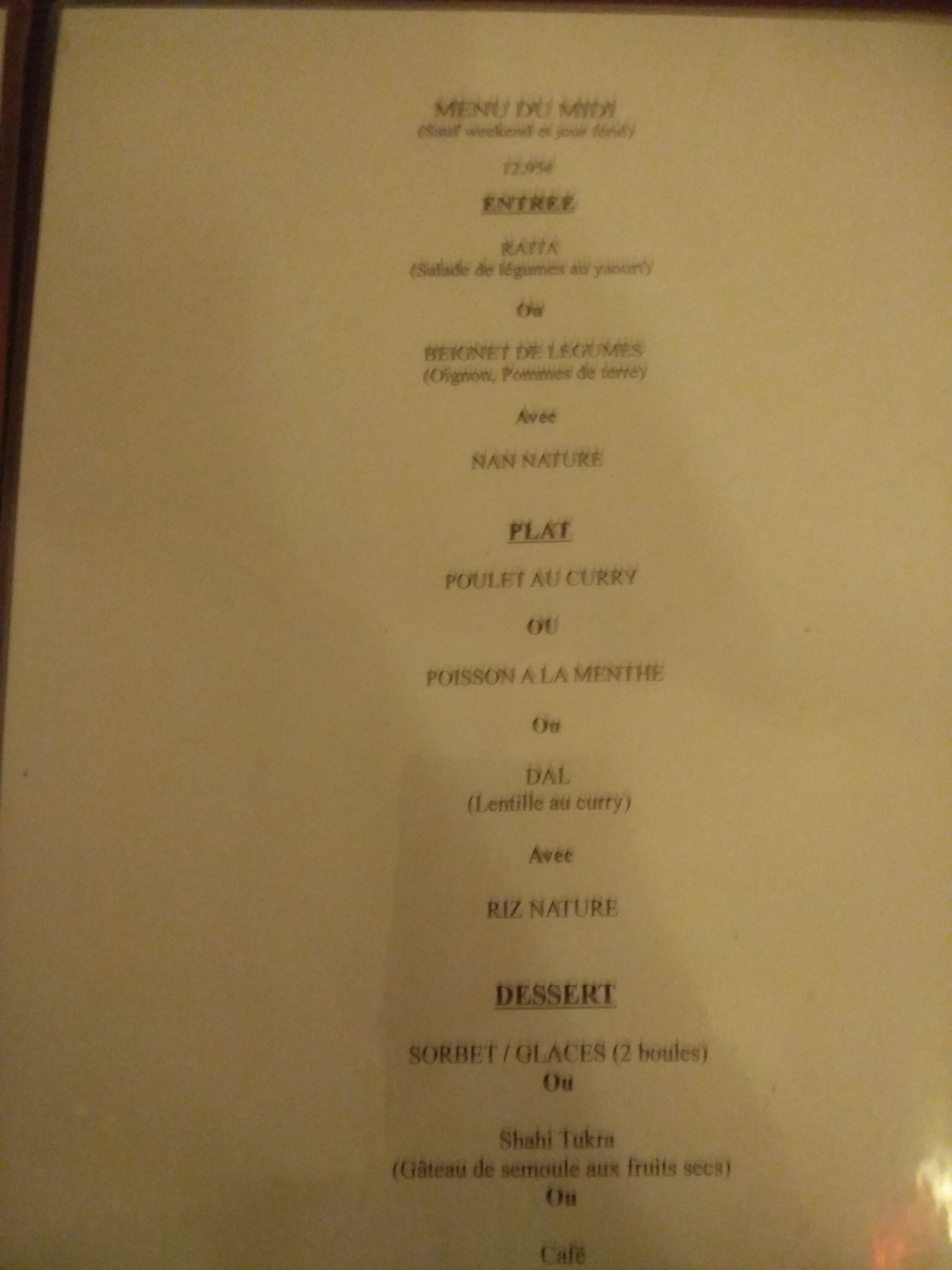 Très bonne cuisine indienne, naan particulièrement bien fait (maison?) attention à la table près de la porte en hiver ;), personnelle aimable