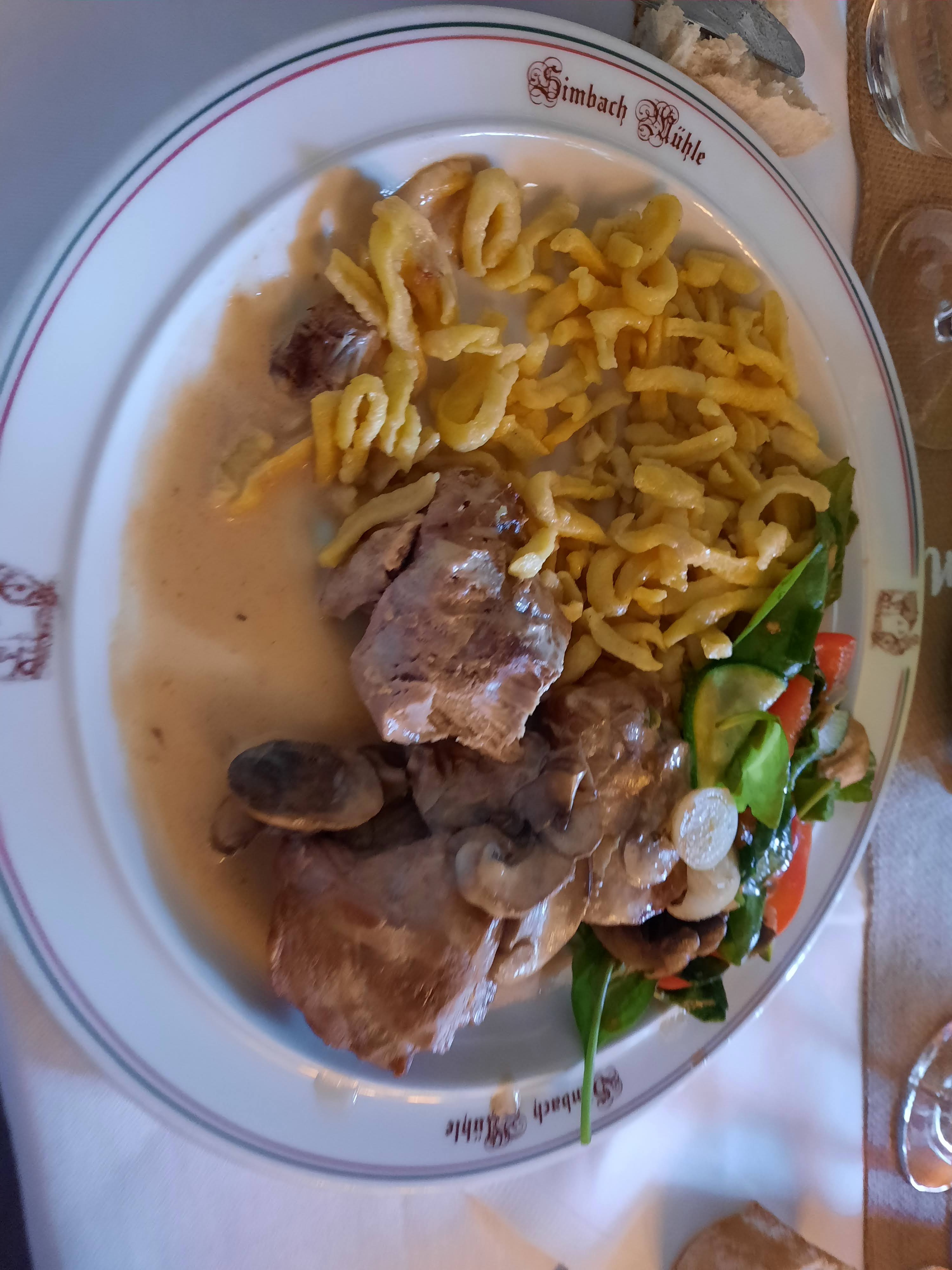 Nous avons reçu le moulin le 30 avril. Visité avec 5 personnes (3 adultes, 2 enfants). L'accueil a été très sympathique et la table réservée nous a été préparée. Lors de la commande, les demandes particulières ont également été prises en compte et finalement parfaitement prises en compte. La nourriture était préparée fraîchement et avec amour, donc si vous voulez être nourri en 10 minutes, vous n'êtes pas au bon endroit ici, que vous pourrez également goûter. Salades fraîches, viandes à la cuisson et au goût parfaits, complétées par de délicieux accompagnements. Et sans oublier un excellent rapport qualité/prix ! Dans l’ensemble, un très bon déjeuner qui nous a donné envie d’en savoir plus. Simbacher Mühle, continuez comme ça ! Nous serions ravis de revenir