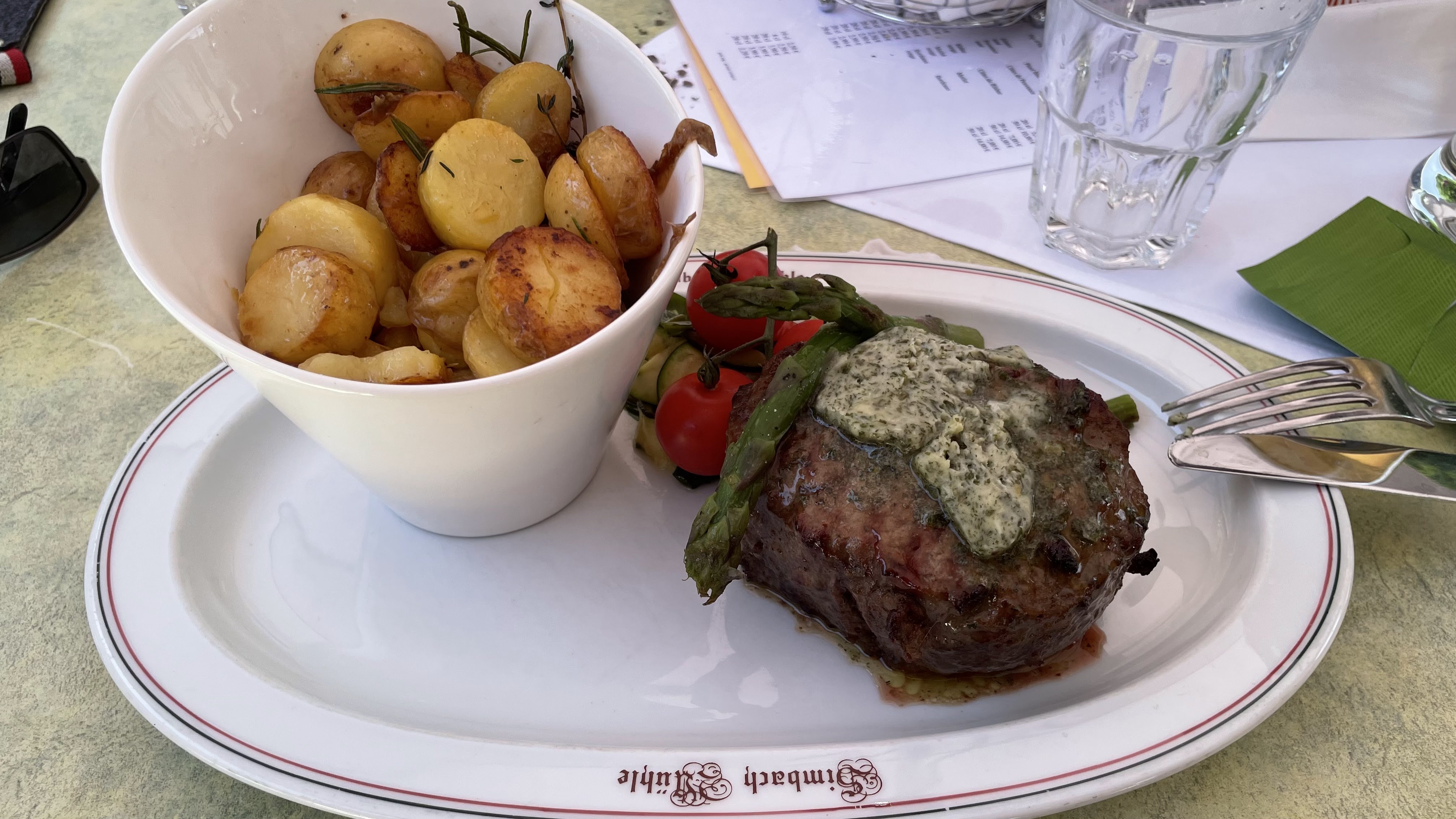 Notre visite du 28 septembre 2018 Emplacement très frais, presque froid. Forte odeur de fumée provenant de la cheminée à foyer ouvert. Pour l'apéritif Crémant... Plainte car totalement rassis, sans aucune sensation de picotement. Nourriture commandée avec un accompagnement de pommes de terre frites, mais des frites ont été livrées à table. Deuxième plainte. Le bœuf, aussi bien le steak de filet de bœuf que le bœuf sur la plaque du grill pour deux personnes, bouillonnait sur la langue, en contraste complet avec le crémant du début. Un goût aigre piquant du bœuf. Troisième reproche, l'excuse du cuisinier selon laquelle c'était la marinade spéciale. Les verres à bière ne sont généralement pas remplis jusqu'au repère d'étalonnage. Malgré trois plaintes, le Werder était prêt à accepter l'addition et a reçu un verre offert. Les choses étaient différentes et nettement meilleures avant le changement de direction. C'est dommage pour l'emplacement, cela ne vaut pas le détour, surtout pas aux prix élevés auxquels le service et la qualité du Werder rendent justice.
