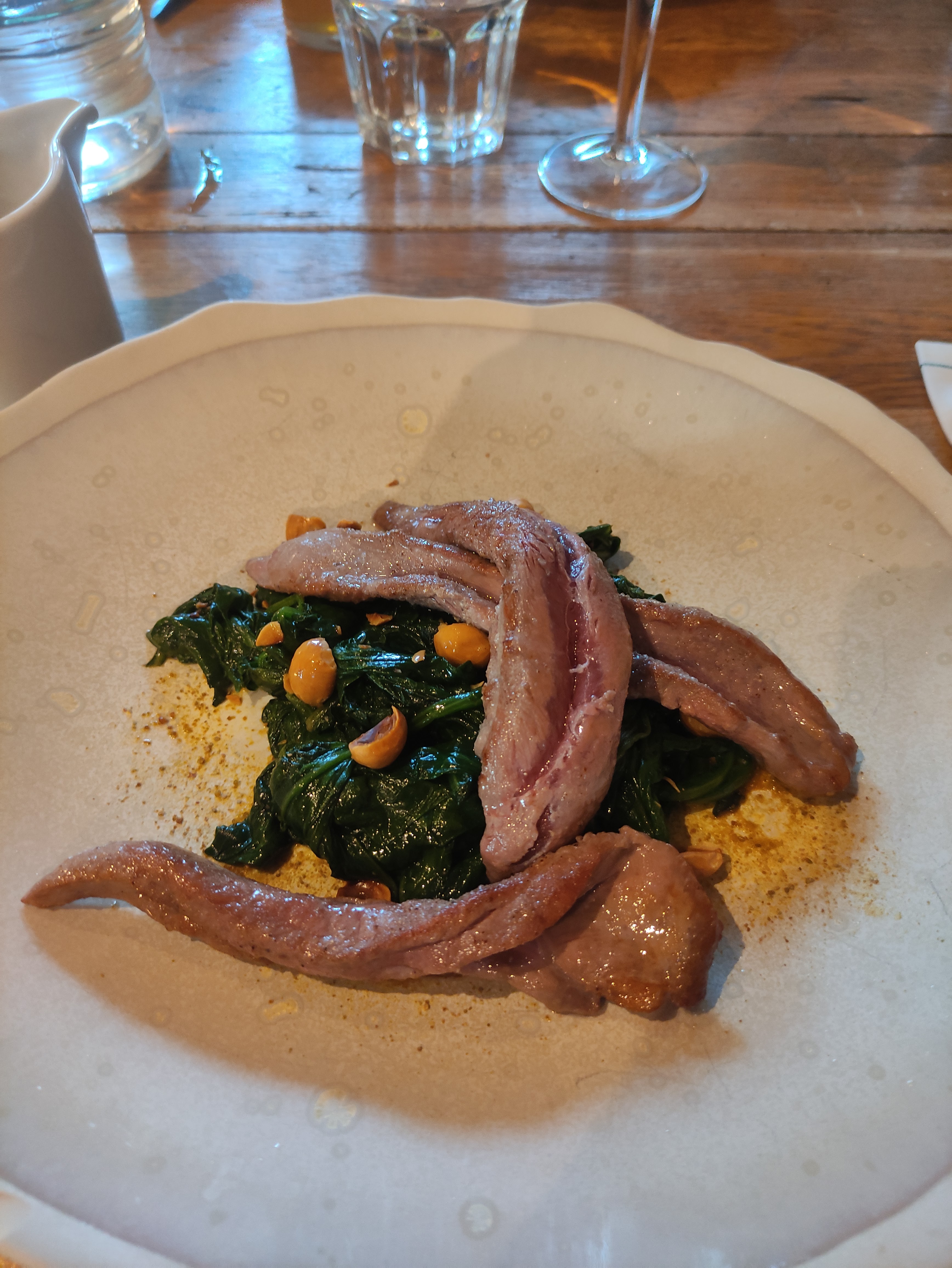 La nourriture était bonne. La truite aux épinards était triste. Le canard était excellent.