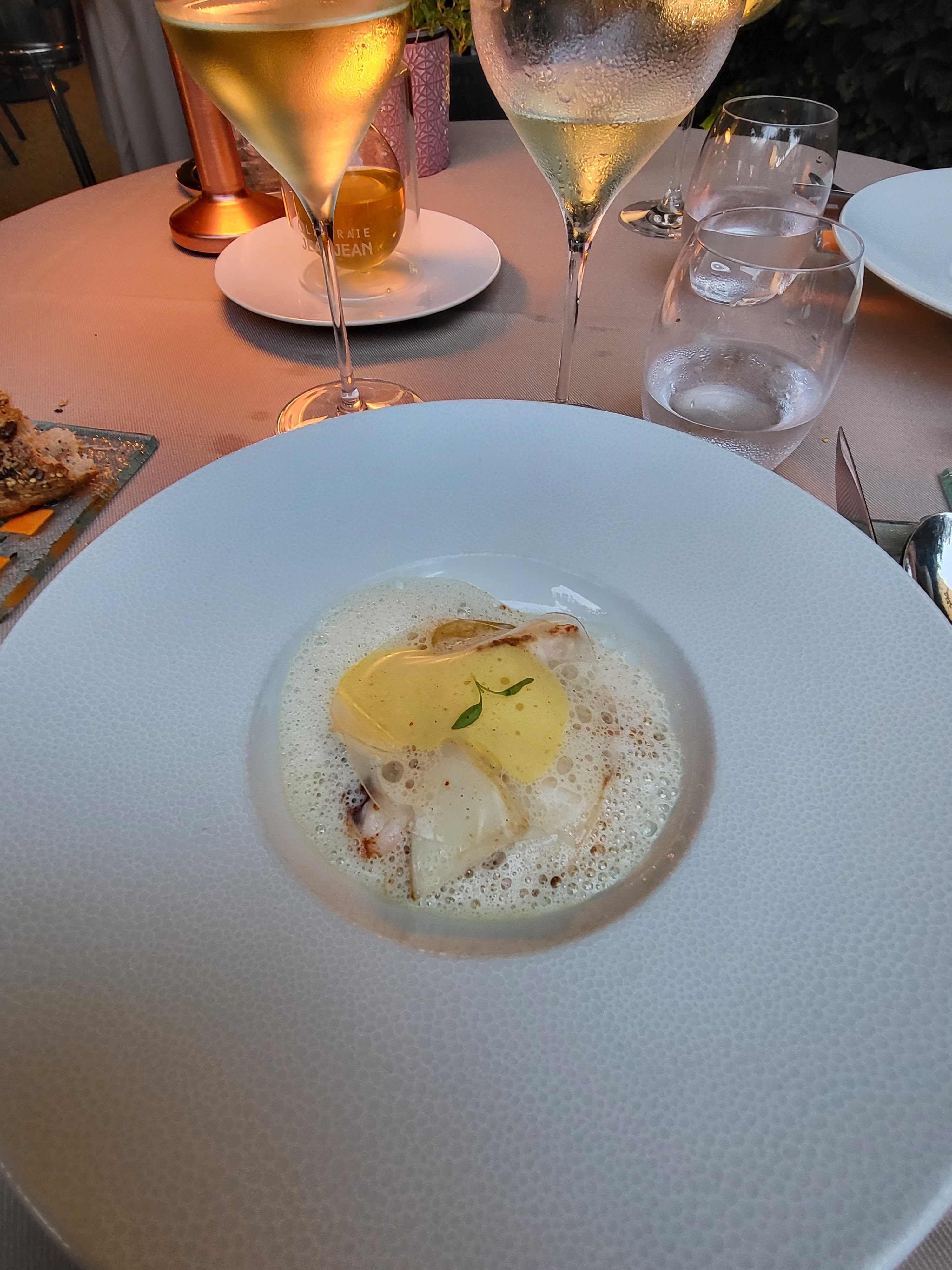 Quel instant divin ! L'orchestration du service était bien rythmé, la farandole des plats nous a énormément plus, depuis la petite brioche de bienvenue jusqu'aux miniardises de sortie. Le reste je vous invite à le découvrir par vous même. Nous avons pris le menu plaisir à 78€ pour un repas gastronomique de 3h30. La décoration du patio est superbe. Seul bémol qui ne m'a pas fait donner 5 étoiles c'est la température dans cet espace confiné que représente le patio: en pleine canicule du 15 août 2020 il aurait été judicieux de prévoir un système de ventilation et/ou de brumisateurs.