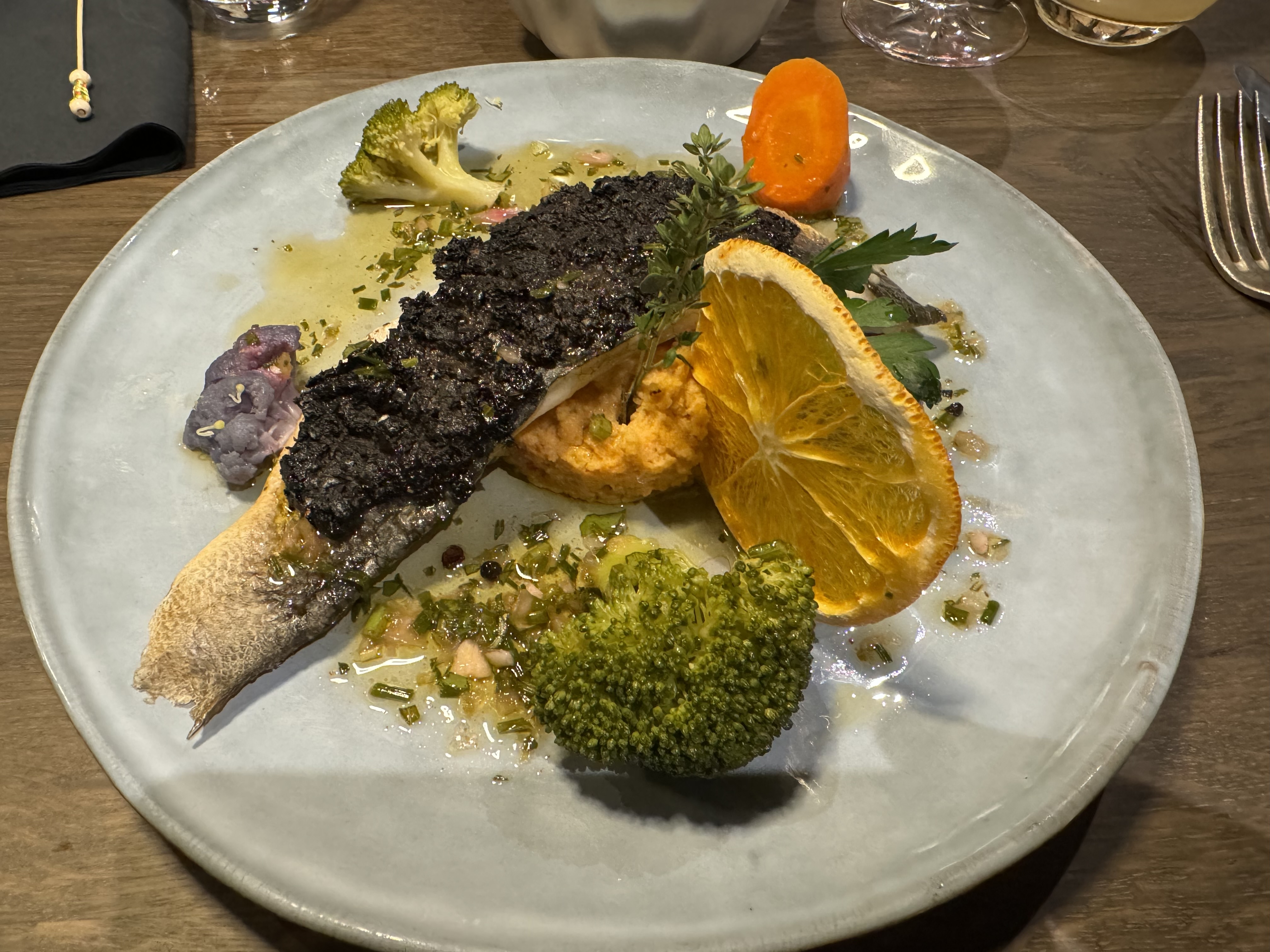 La nourriture était assez bonne (pas exceptionnelle) et bien présentée, l'ambiance était très agréable, le service était au mieux moyen, mais le maître d'hôtel était exceptionnellement impoli. Nous étions à l'hôtel Vaillant (domicile du restaurant Stork) et nous n'avions pas très faim, nous voulions donc partager une assiette principale. Le serveur nous a informé que le partage n'était pas autorisé et que nous devions au moins commander une assiette chacun. Nous lui avons dit que nous ne voulions pas gaspiller la nourriture que nous ne mangeons pas et que nous ne voulions pas non plus gaspiller d'argent. Reconnaissant l'accent canadien-français de ma femme, le serveur a suggéré qu'elle pourrait vouloir une poutine. Quel commentaire absolument stupide et insensible. Elle a répondu que comment saurait-il si elle aimait même la poutine, et en plus, ce n'est pas sur le menu/l'offre. Quel crétin. Le menu du soir était très limité et assez cher, surtout les vins.