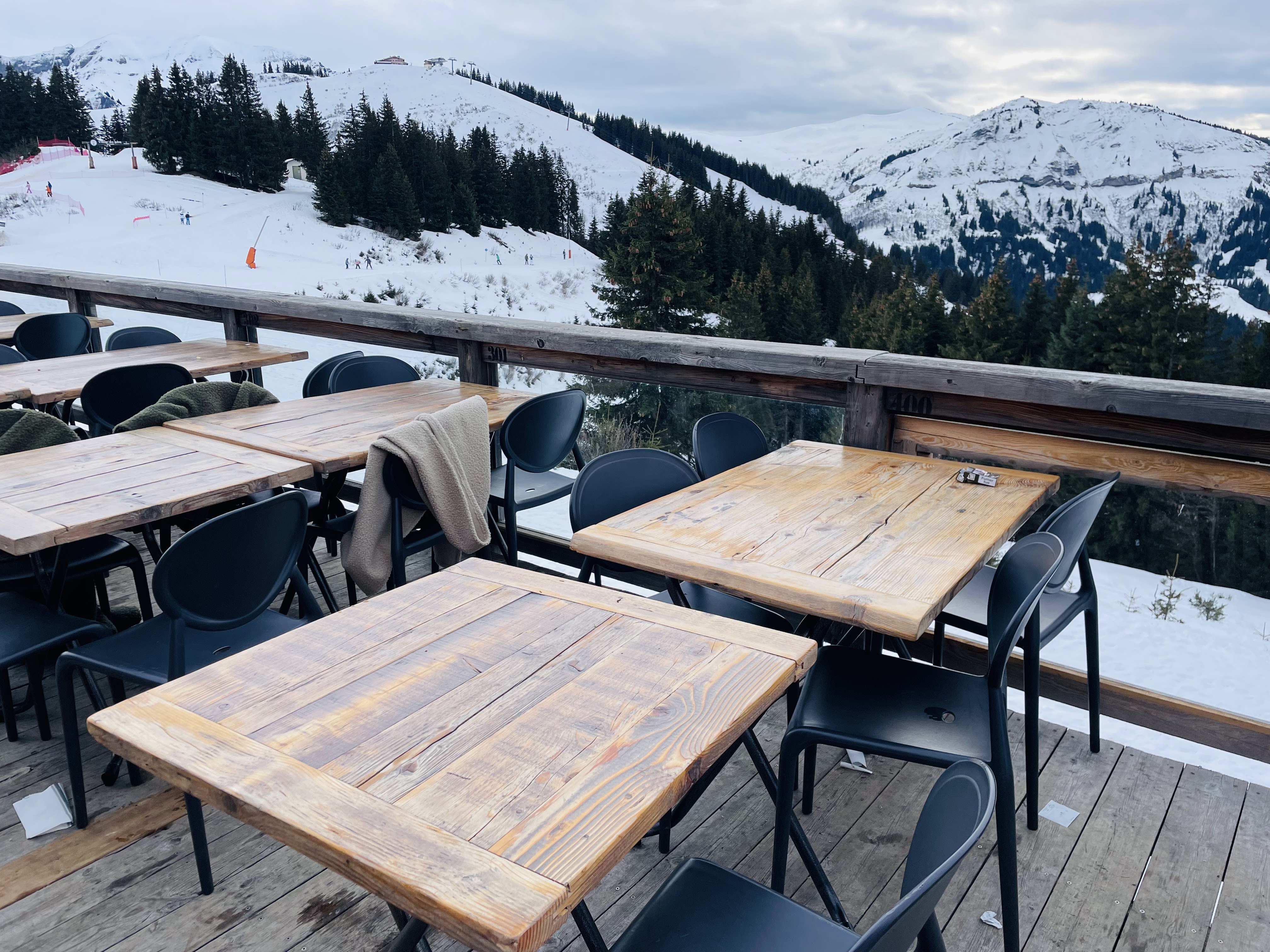 Très belle terrasse avec une vue dégagée sur toutes les hauteurs Mont Blanc etc, arriver a 14h sans réservation nous avons attendu 20 min pour avoir une table ce qui m’a l’air très correct au vu des autres commentaires service impeccable, prix excessif.